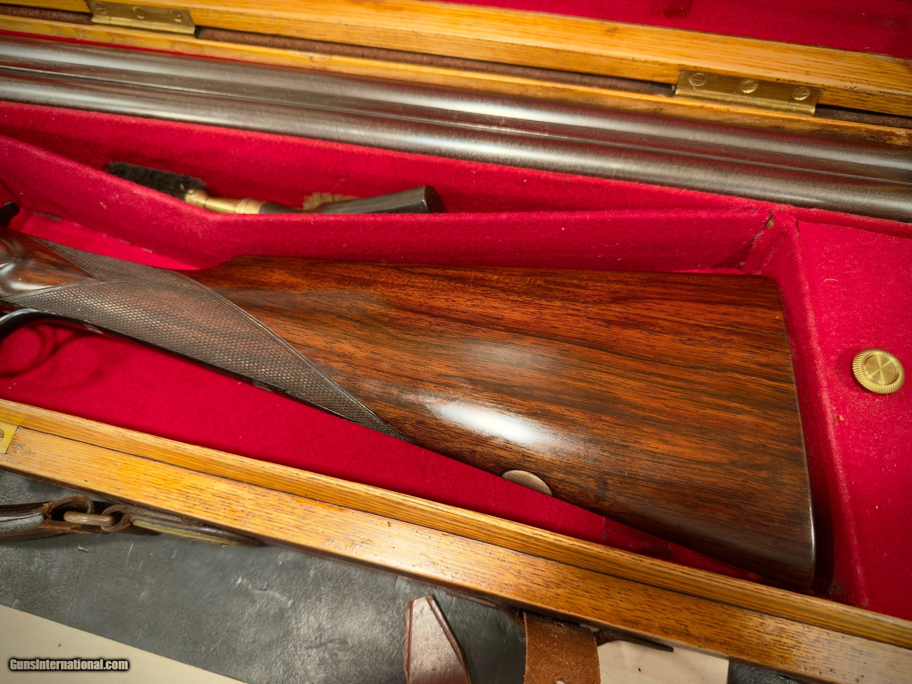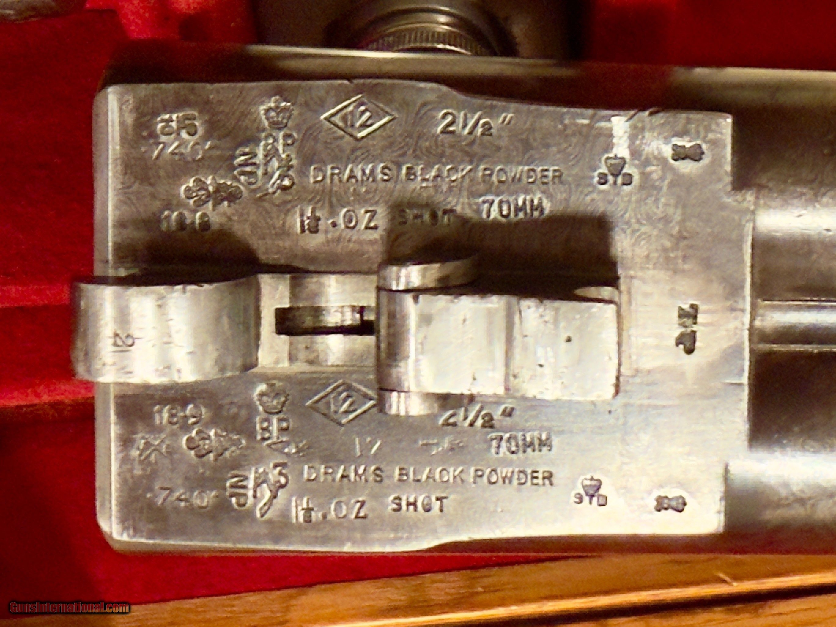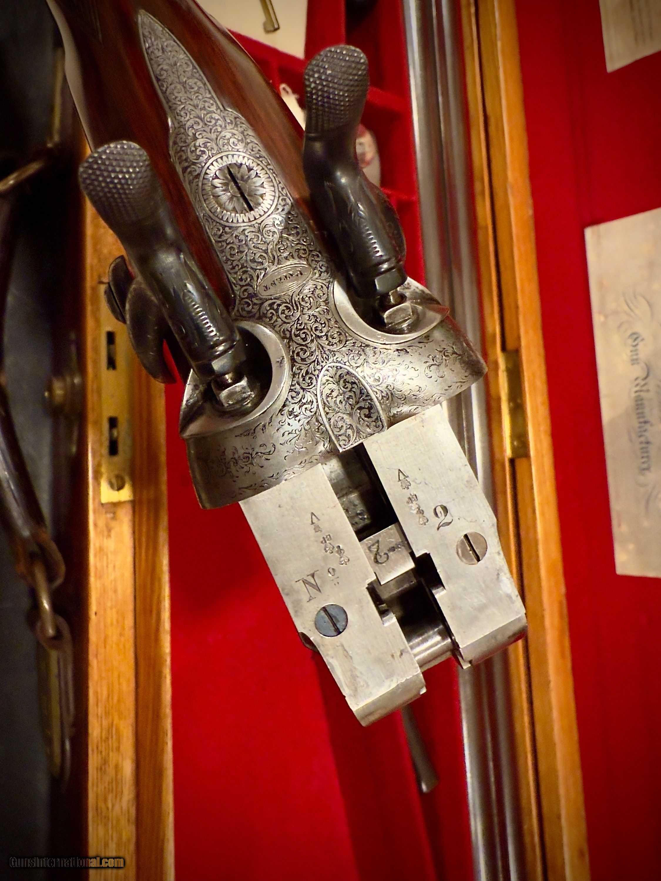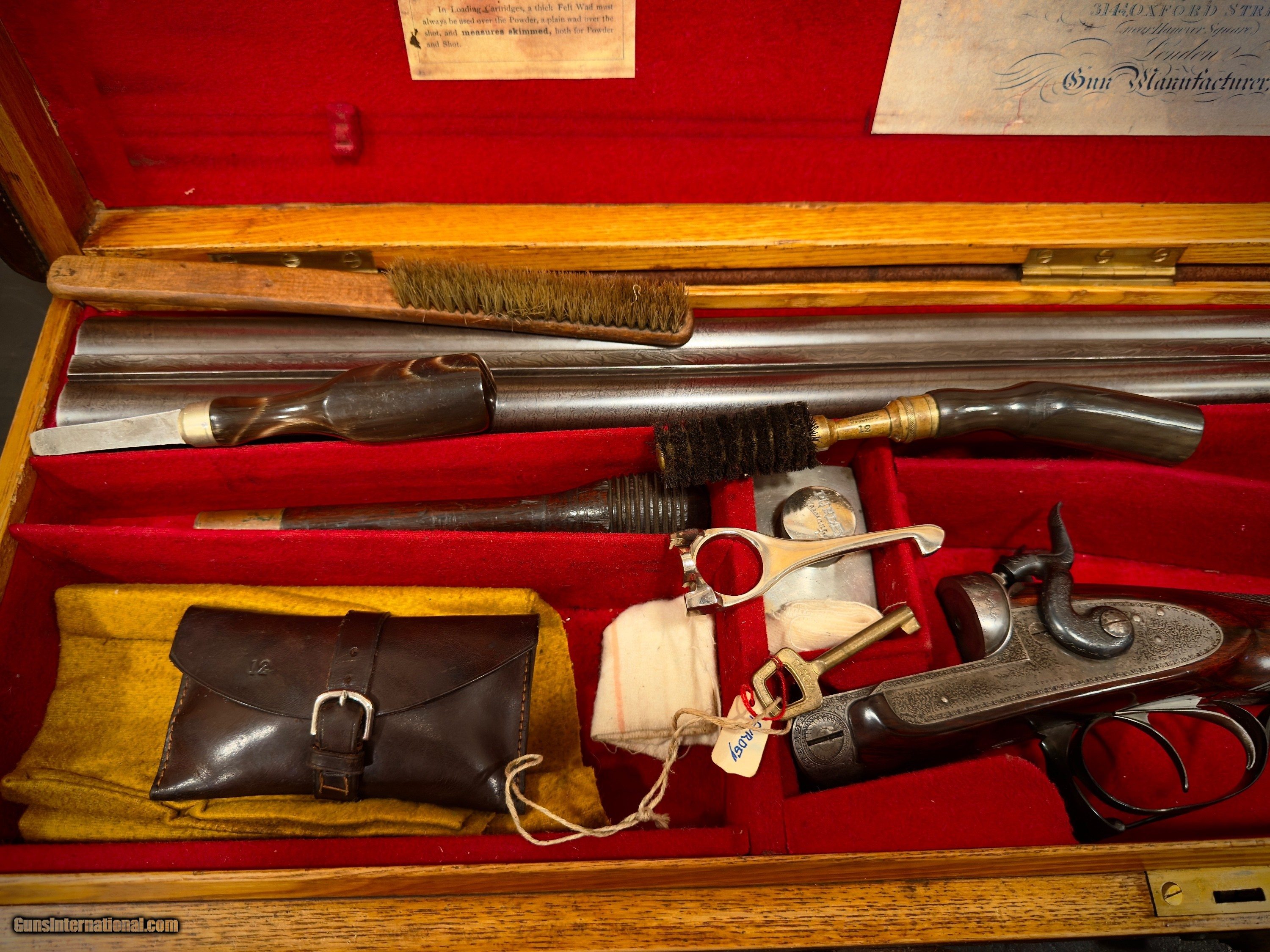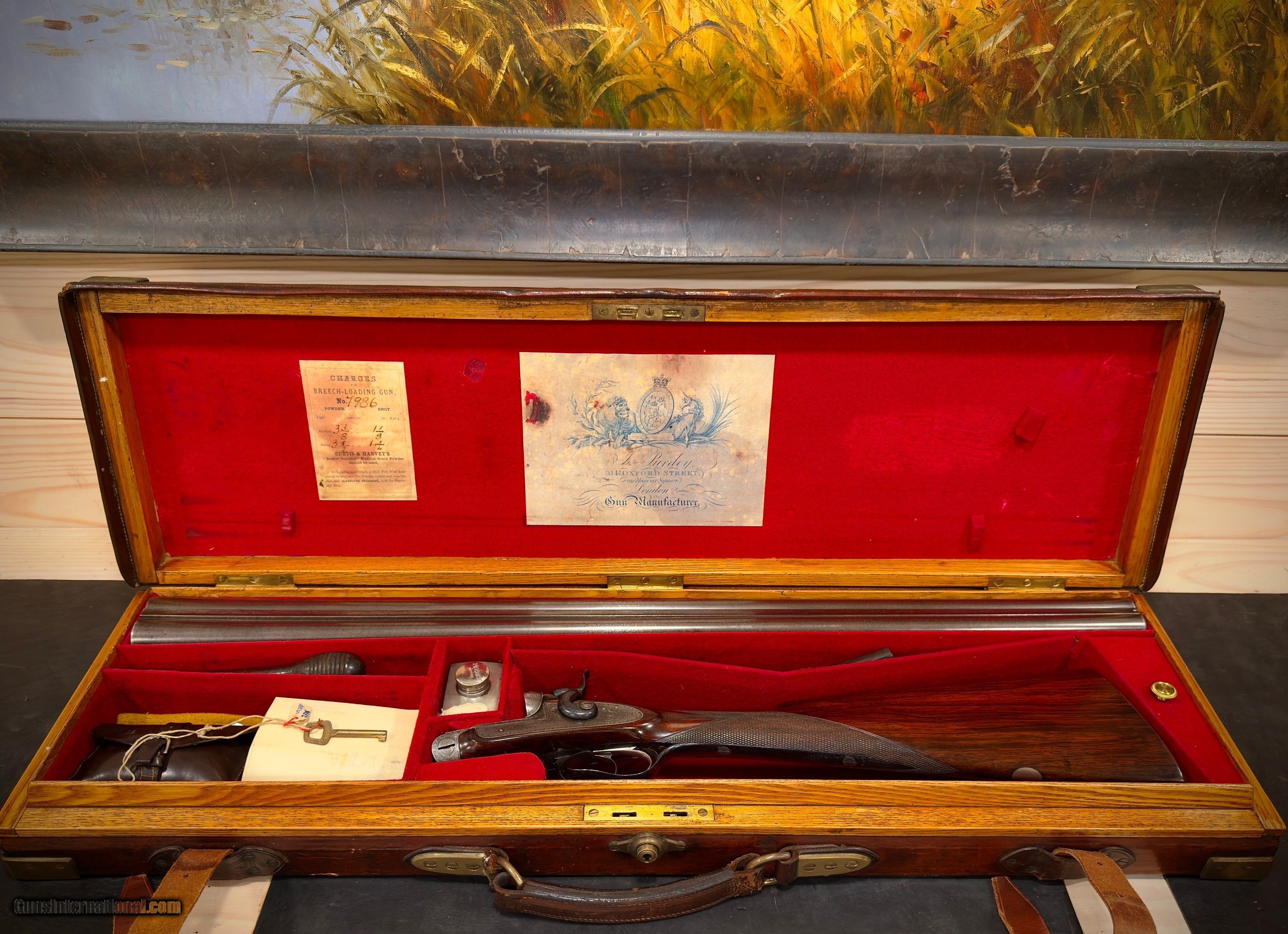 Description: James Purdey & Sons 12 gauge antique bar in wood hammergun, has been proofed for modern shells. This beautiful work of art has finally made it to the US and is available here at Selwood Farma. James Purdey & Sons has confirmed that this 12 gauge thumblever bar-in-wood hammergun (serial number 79xx) was manufactured in 1869. What makes Purdey’s pedigree even more extraordinary is the fact that all shotgun manufacturing, engraving, fitting, etc., down to the thousandth of an inch, was hand-crafted without the assistance of automated machining, computer measurements, or electronic assistance. Absolute master craftsmen invested hundreds of hours into each shotgun they made by hand, with hundreds of additional hours devoted to the engraving, fitting & finishing of each Best Quality piece. An unusual find with all original components, a thumb-lever release mechanism, and original numbered case with tools, No. 79xx’s handsome sidelocks are in keeping with the usage of 'Purdey' on each lock, as the '& Sons' was not added until the end of 1877. In beautiful condition, the action, locks, hammers, and top strap are hand-engraved in ornate and finely detailed patterns in typical Purdey fashion: acanthus scrollwork and spiral constellations on both locks and each side of the rounded action, with similar bold acanthus engraving on the floorplate; vine scrollwork on the trigger guard and thumb lever; extremely fine and bold scrollwork on the toplever and elongated dolphin-style non-rebounding hammers, with “PATENT” in an oval; and exceptional vinework detailing engraved on the fences. The maker’s name “PURDEY” bolsters the bottom of each lock. Double bite action. Excellent condition on the interior of the action, with minimal powder marks on the face. Matching serial numbers “79xx” throughout the gun on the barrels, fore-end, and trigger guard. The original antique London proof house black powder proof marks are on the left and right barrel flats, denoting the “definitive” proof mark with a script “GP” under a crown. The accompanying antique London “view” mark “V” under a crown is also on the barrel flats. These same original London accompanying proof marks are likewise on the action flats. The action flats are also marked “No. 2” as the second “Best Quality” piece in an original four gun set as annotated by Purdeys. This gun comes in at a lightweight 6 pounds 11 ounces. Barrels have undergone complete inspection and re-proofing, with the flats stamped to confirm their safety & compliance with modern testing standards. Contemporary Birmingham proof marks show that it has undergone British Nitro Proof (NP) testing with the contemporary “BP” under a crown indicating Birmingham Proof House measurements and standard “NITRO PROOF” compliance for 12 bore chambers (“12” in a diamond). Additional London proof marks show that it has undergone more recent British Nitro Proof (NP) testing, including the London heraldic marks of “NP” surmounted by an arm dexter in armor holding a scimitar. Later re-testing marks are also present, with the London script “R” under a crown denoting reproof, as well as post-2005 testing as confirmed by the “STD” under a crown, all indicating Proof House re-proofing measurements and standard nitro proof compliance to accommodate modern 2 & 3/4” shells (“70MM” annotated on the flats showing 70 mm metric measurement). As Terry Wieland highlights in his book “Vintage British Shotguns,” he states “If you buy an English gun… and the proof marks show it has been nitro proofed – that is, proven with smokeless powder – you know it’s safe to shoot with loads of the length and gauge marked.” Exceptional Damascus barrels with beautiful patterns and great measurements – rare to find a Purdey with original Damascus in such outstanding condition. The 30” barrels with brass sight bead have been well taken care of over the past century and a half, with seemingly little use, and outstanding strong measurements coming in at 25,000th thickness for the right wall and 30,000th left wall thickness, and a flawless mirrored interior – no marks or pitting. With continued good care and cleaning after each shoot, this collector’s item should offer great future hunting well into the next century – a future family heirloom for generations to come. The chambers with extractors are sized for 2 & 3/4” (70 mm) shells, and has chokes of approximately improved cylinder in both barrels. The interior of the bores are mirrors, while the outer barrels have handsome brown aged Damascus coloring with only the faintest of handling marks. The well figured stock has nice sharp checkering throughout the hand and a handsome dark grain, checkered buttplate, a brass oval on the underside of the stock suitable for engraving, and a 14 & 5/8” pull. There is the finest seam in the wood grain just in front of the trigger plate (not crack) but absolutely no break whatsoever in the grain and zero separation to the wood – looks to be original to the stock and quite old, but wanted to note any slight blemish for full disclosure. The barrels lock up tight with absolutely no play in the action. Beautifully patterned Damascus game rib is engraved with the maker’s details and reads “J. PURDEY, 314 ½ OXFORD STREET, LONDON.” Sharply checkered fore-end wood with engraved fore-end base and tip and crosspin release. Good overall length and fit to this gun with its slightly longer stock and 30” barrels provide for balanced shooting. This collector’s item is housed in its original Victorian beautiful oak and leather Purdey gun case with red felt interior, leather straps and leather handle all in good condition, with brass hardware, brass corners, lock and original key. The antique hammergun case has its original antique Purdey maker’s decals matched to this gun, showing some age-related staining and wear. There is also some 
