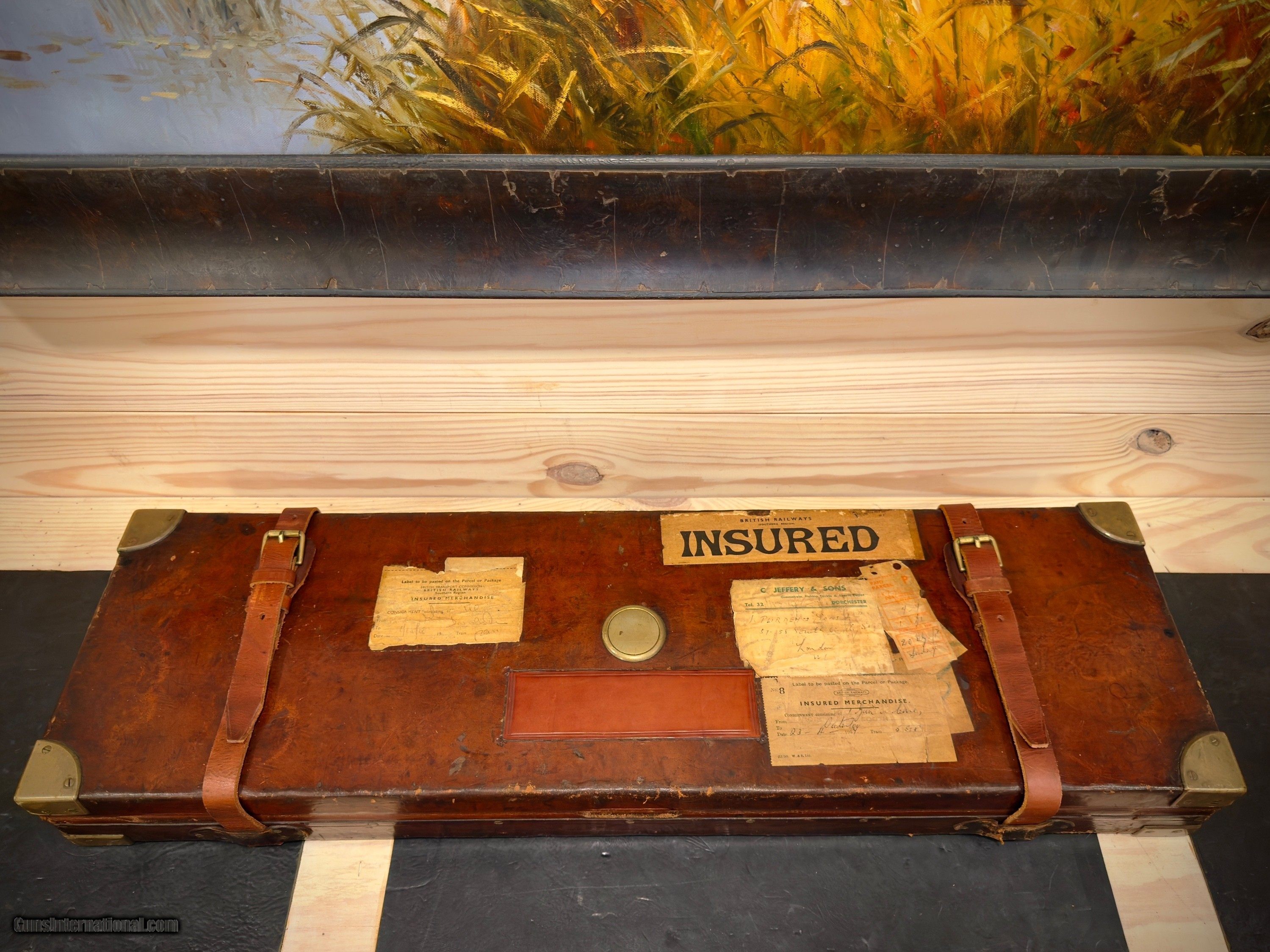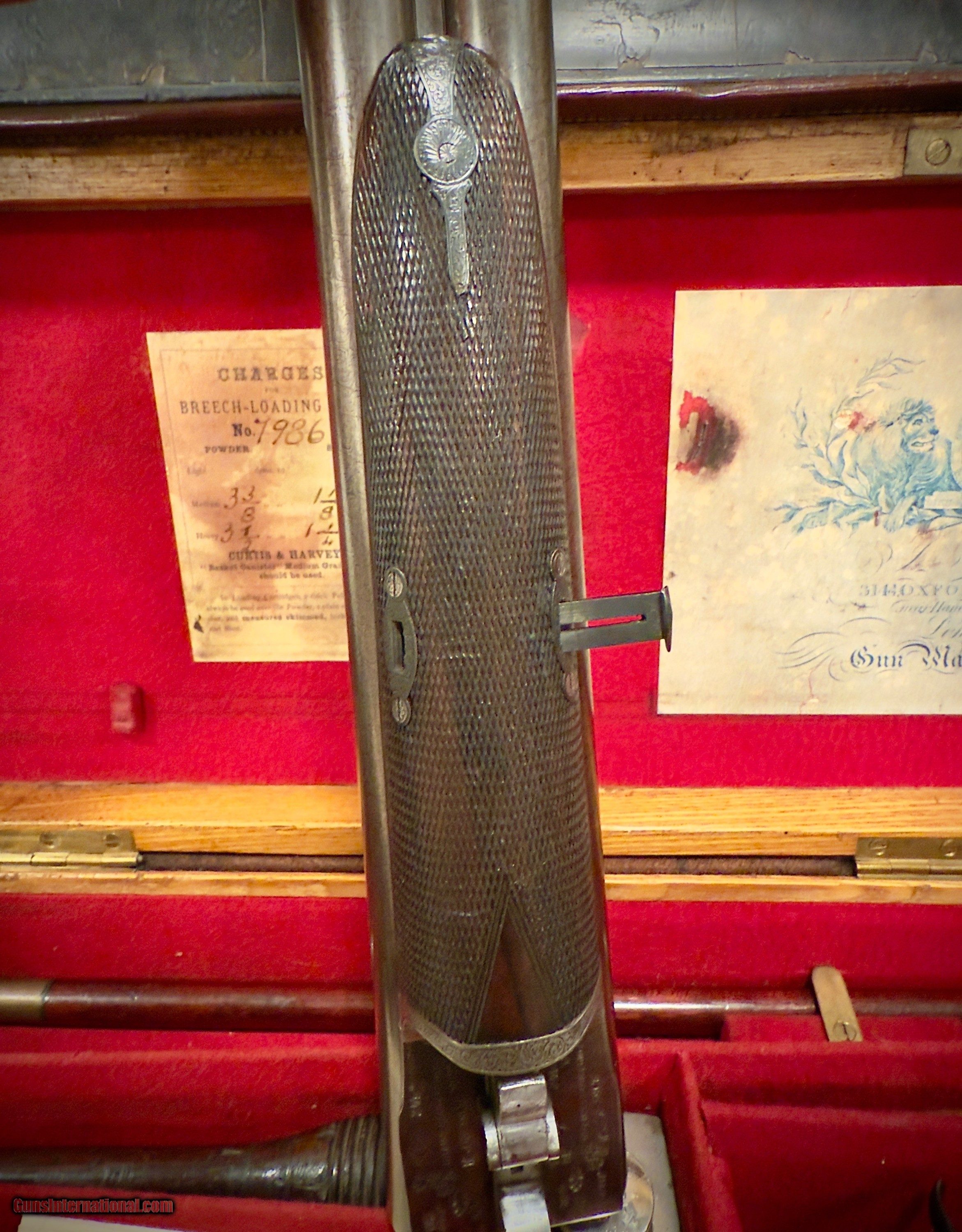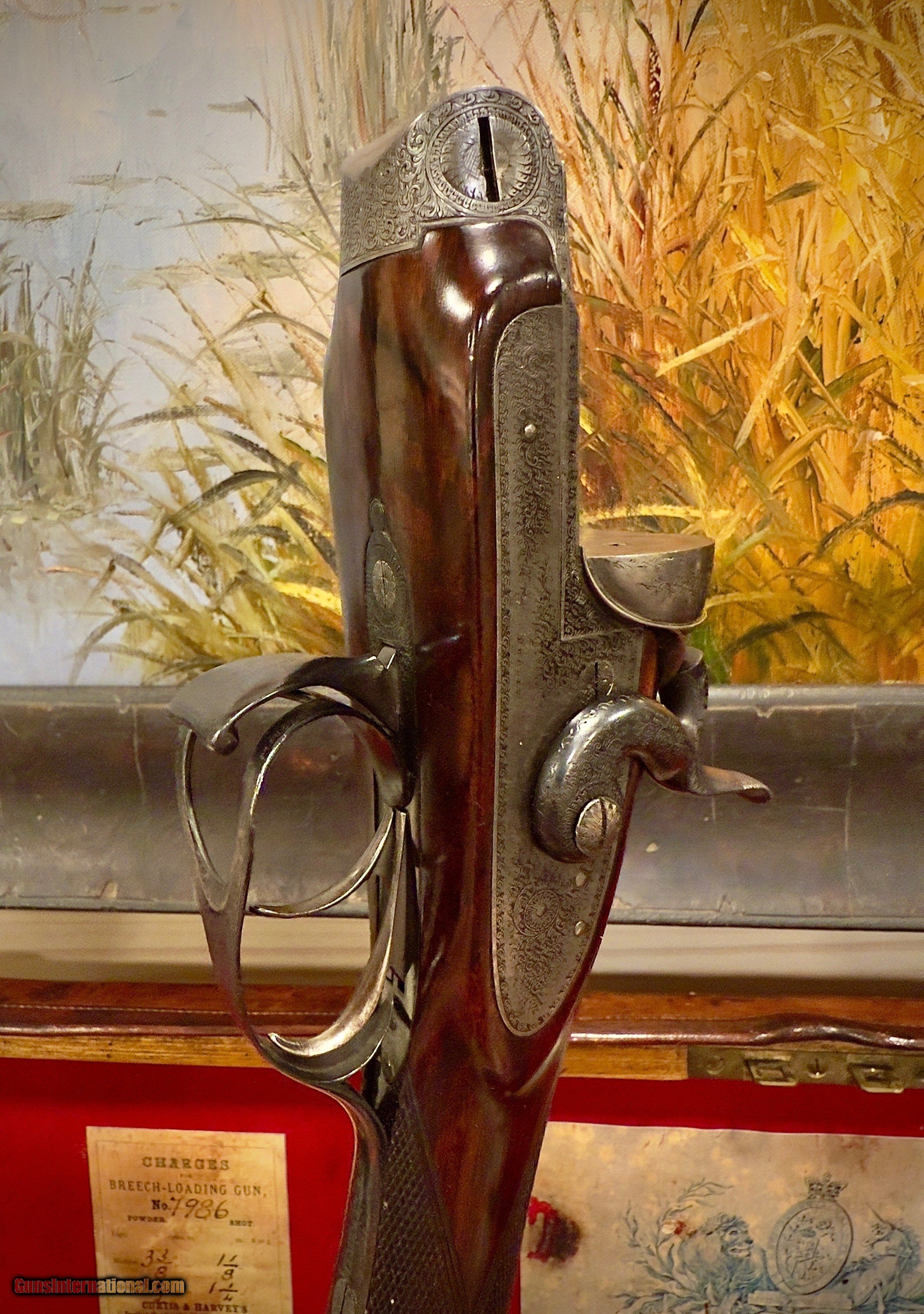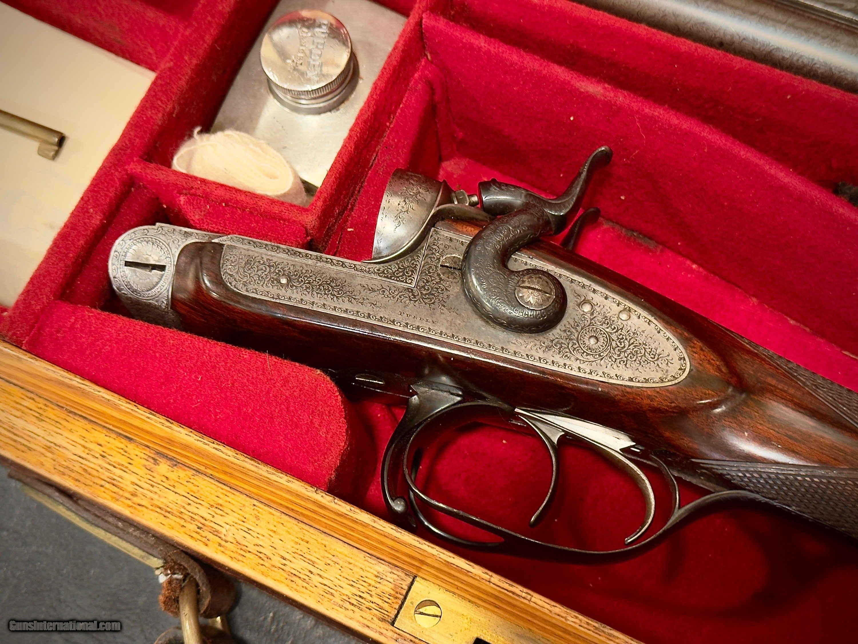 Description: James Purdey & Sons 12 gauge antique bar in wood hammergun, has been proofed for modern shells. This beautiful work of art has finally made it to the US and is available here at Selwood Farma. James Purdey & Sons has confirmed that this 12 gauge thumblever bar-in-wood hammergun (serial number 79xx) was manufactured in 1869. What makes Purdey’s pedigree even more extraordinary is the fact that all shotgun manufacturing, engraving, fitting, etc., down to the thousandth of an inch, was hand-crafted without the assistance of automated machining, computer measurements, or electronic assistance. Absolute master craftsmen invested hundreds of hours into each shotgun they made by hand, with hundreds of additional hours devoted to the engraving, fitting & finishing of each Best Quality piece. An unusual find with all original components, a thumb-lever release mechanism, and original numbered case with tools, No. 79xx’s handsome sidelocks are in keeping with the usage of 'Purdey' on each lock, as the '& Sons' was not added until the end of 1877. In beautiful condition, the action, locks, hammers, and top strap are hand-engraved in ornate and finely detailed patterns in typical Purdey fashion: acanthus scrollwork and spiral constellations on both locks and each side of the rounded action, with similar bold acanthus engraving on the floorplate; vine scrollwork on the trigger guard and thumb lever; extremely fine and bold scrollwork on the toplever and elongated dolphin-style non-rebounding hammers, with “PATENT” in an oval; and exceptional vinework detailing engraved on the fences. The maker’s name “PURDEY” bolsters the bottom of each lock. Double bite action. Excellent condition on the interior of the action, with minimal powder marks on the face. Matching serial numbers “79xx” throughout the gun on the barrels, fore-end, and trigger guard. The original antique London proof house black powder proof marks are on the left and right barrel flats, denoting the “definitive” proof mark with a script “GP” under a crown. The accompanying antique London “view” mark “V” under a crown is also on the barrel flats. These same original London accompanying proof marks are likewise on the action flats. The action flats are also marked “No. 2” as the second “Best Quality” piece in an original four gun set as annotated by Purdeys. This gun comes in at a lightweight 6 pounds 11 ounces. Barrels have undergone complete inspection and re-proofing, with the flats stamped to confirm their safety & compliance with modern testing standards. Contemporary Birmingham proof marks show that it has undergone British Nitro Proof (NP) testing with the contemporary “BP” under a crown indicating Birmingham Proof House measurements and standard “NITRO PROOF” compliance for 12 bore chambers (“12” in a diamond). Additional London proof marks show that it has undergone more recent British Nitro Proof (NP) testing, including the London heraldic marks of “NP” surmounted by an arm dexter in armor holding a scimitar. Later re-testing marks are also present, with the London script “R” under a crown denoting reproof, as well as post-2005 testing as confirmed by the “STD” under a crown, all indicating Proof House re-proofing measurements and standard nitro proof compliance to accommodate modern 2 & 3/4” shells (“70MM” annotated on the flats showing 70 mm metric measurement). As Terry Wieland highlights in his book “Vintage British Shotguns,” he states “If you buy an English gun… and the proof marks show it has been nitro proofed – that is, proven with smokeless powder – you know it’s safe to shoot with loads of the length and gauge marked.” Exceptional Damascus barrels with beautiful patterns and great measurements – rare to find a Purdey with original Damascus in such outstanding condition. The 30” barrels with brass sight bead have been well taken care of over the past century and a half, with seemingly little use, and outstanding strong measurements coming in at 25,000th thickness for the right wall and 30,000th left wall thickness, and a flawless mirrored interior – no marks or pitting. With continued good care and cleaning after each shoot, this collector’s item should offer great future hunting well into the next century – a future family heirloom for generations to come. The chambers with extractors are sized for 2 & 3/4” (70 mm) shells, and has chokes of approximately improved cylinder in both barrels. The interior of the bores are mirrors, while the outer barrels have handsome brown aged Damascus coloring with only the faintest of handling marks. The well figured stock has nice sharp checkering throughout the hand and a handsome dark grain, checkered buttplate, a brass oval on the underside of the stock suitable for engraving, and a 14 & 5/8” pull. There is the finest seam in the wood grain just in front of the trigger plate (not crack) but absolutely no break whatsoever in the grain and zero separation to the wood – looks to be original to the stock and quite old, but wanted to note any slight blemish for full disclosure. The barrels lock up tight with absolutely no play in the action. Beautifully patterned Damascus game rib is engraved with the maker’s details and reads “J. PURDEY, 314 ½ OXFORD STREET, LONDON.” Sharply checkered fore-end wood with engraved fore-end base and tip and crosspin release. Good overall length and fit to this gun with its slightly longer stock and 30” barrels provide for balanced shooting. This collector’s item is housed in its original Victorian beautiful oak and leather Purdey gun case with red felt interior, leather straps and leather handle all in good condition, with brass hardware, brass corners, lock and original key. The antique hammergun case has its original antique Purdey maker’s decals matched to this gun, showing some age-related staining and wear. There is also some 