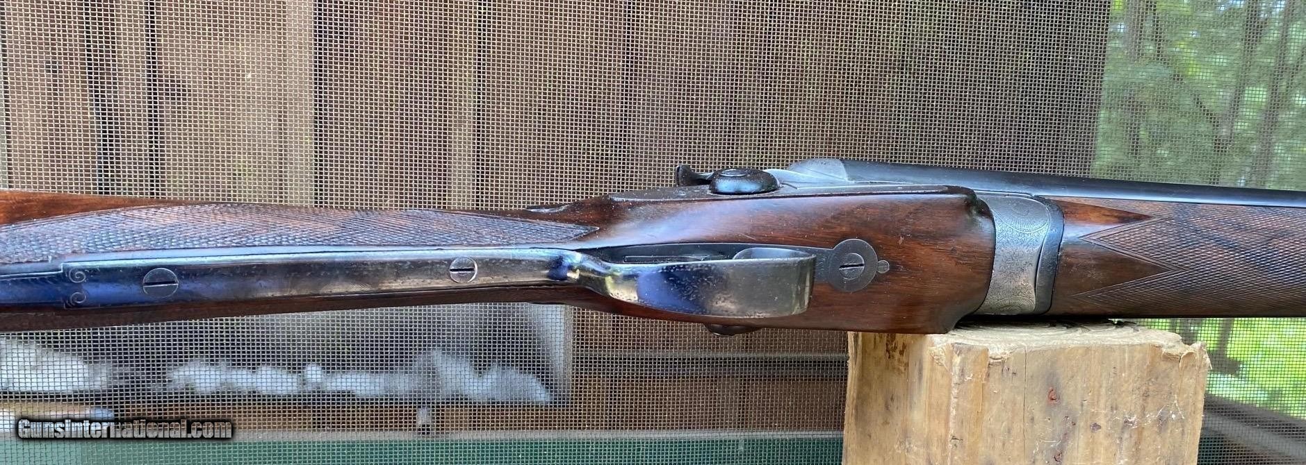 Description: This Purdey bar-in-wood 12 bore shotgun was produced in 1883 according to the ledger. It has recently sleeved 29" barrels with open choke. There is adequate wall thickness to have fixed choke sleeves or interchangeable chokes installed. The gun weighs 6lbs 11oz and balances 1/2" in front of hinge. Stock dimensions are 14 1/2" LOP over pad with 1 5/8" DAC and 2 3/16"DAH. The stock is original but has suffered a crack at the wrist which was repaired prior to my owning, I have shot and hunted this gun without issue. The engraving on the top lever and trigger guard is well worn from carry. SOLD Antique: Yes Shotgun Gauge: 12 Gauge Manufacturer: Purdey Model: bar-in-wood Barrel Length: 29 Chambers: 2 3/4 Ejectors: extractor Condition: fair Bore Condition: great Manufacture Date: 1883 |