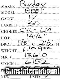 Description: Purdey Best 12 gauge SOLD Serial Number: 13610 Barrels: 30 Stock Comb: 1 5/8 Stock Heel: 2 1/2 LOP: 14 1/4 Weight: 6lbs 9oz Chokes: CYL-LM |