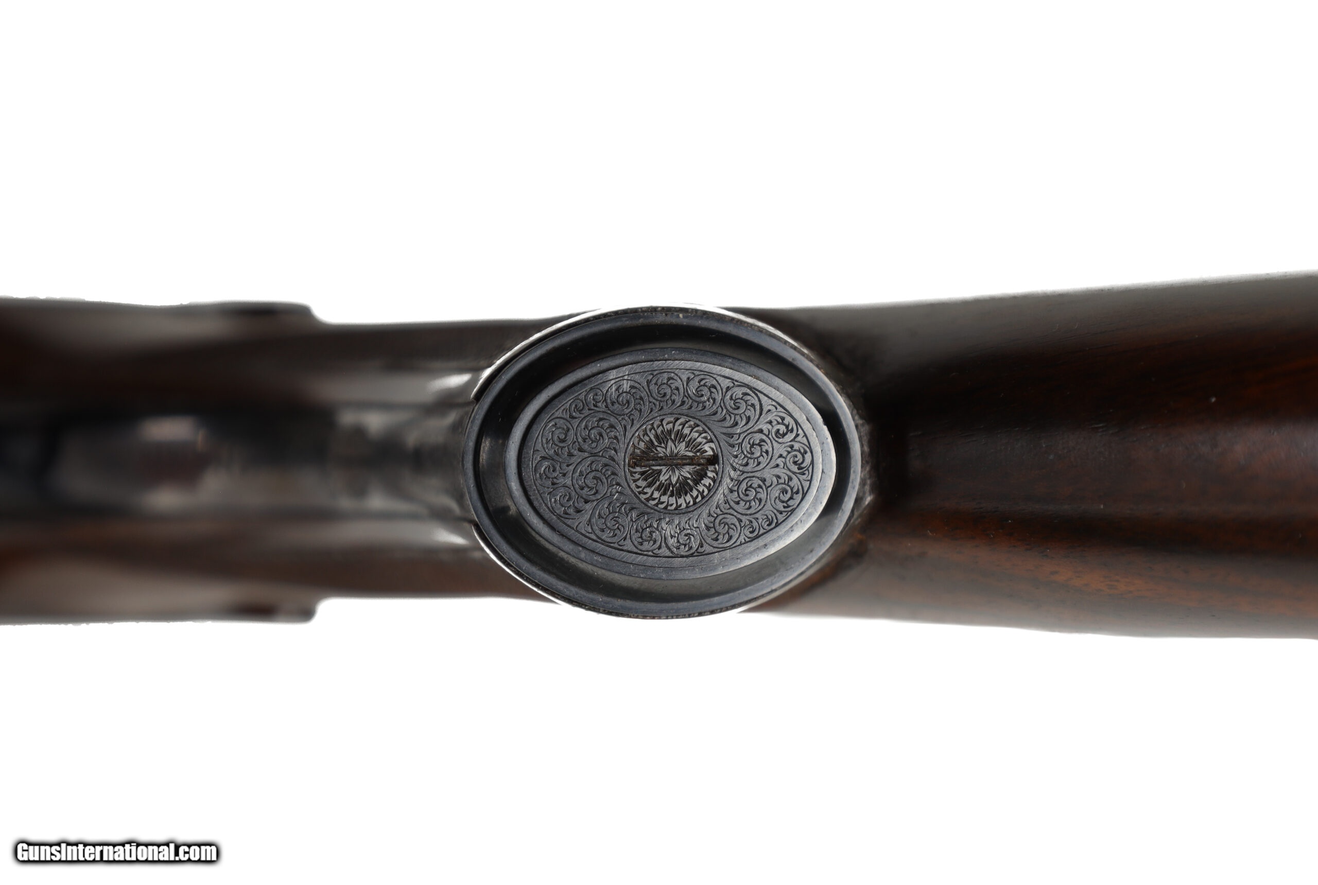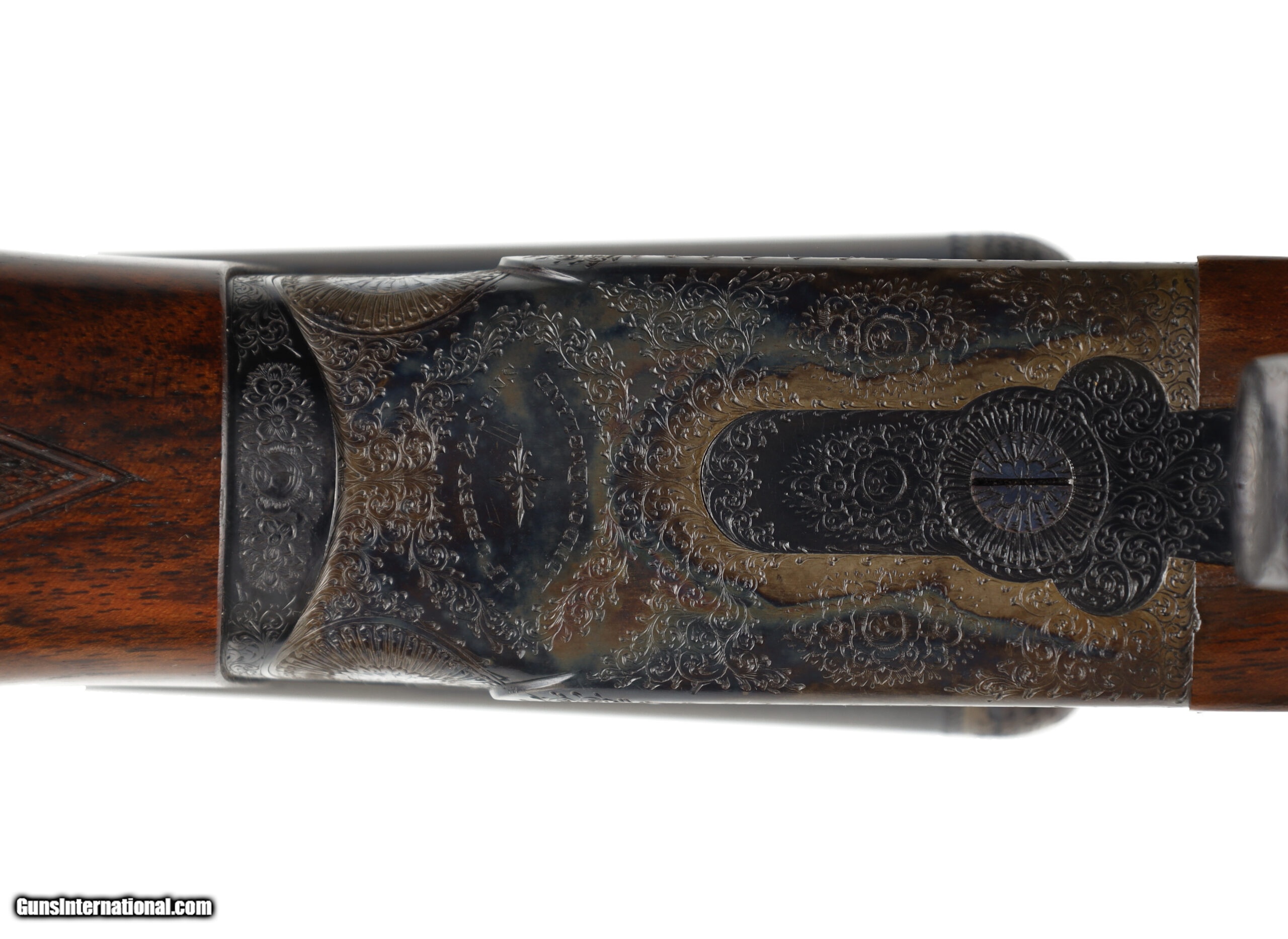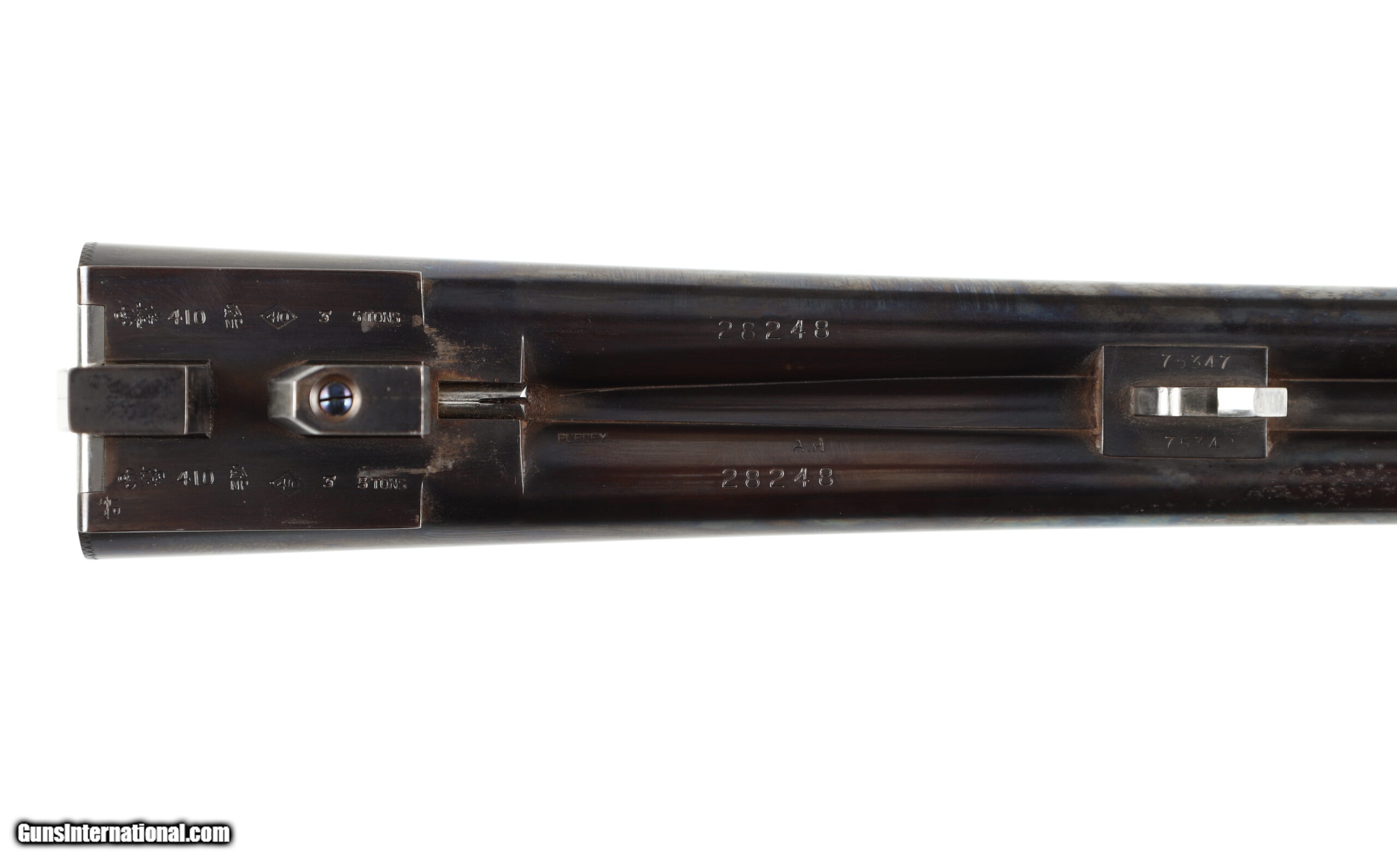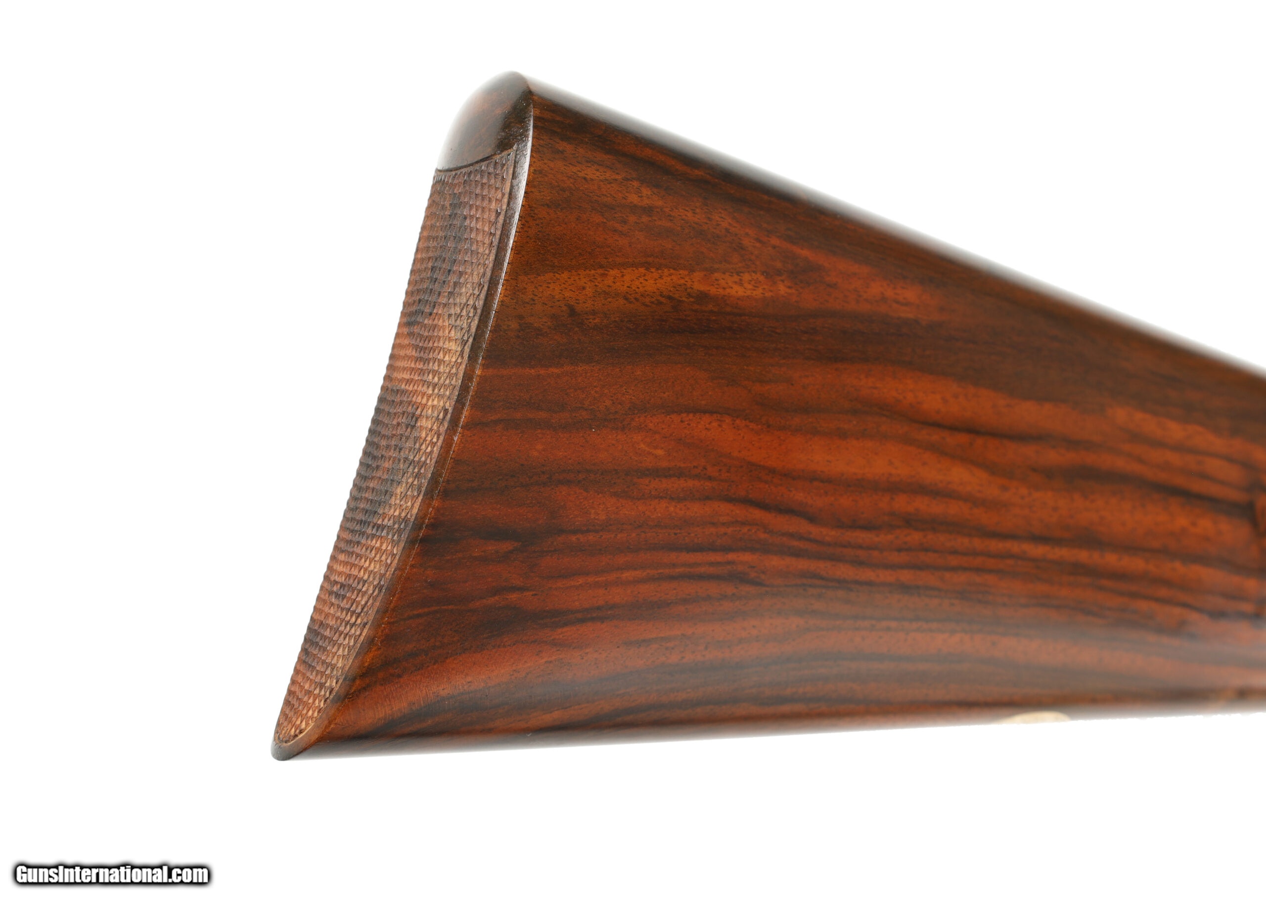 Description: This Beautiful Purdey .410 Gauge shotgun, completed in 1981, is a magnificent showing of English gunmaking. The stocks, made of beautiful but subdued walnut, are crafted into a svelte pistol grip buttstock with blued grip cap and wrap around checkering, measuring to a 15 3/8" length of pull, and the forend shaped into a finely checkered beavertail to protect the hand from the heat of shooting. The action sitting within these stocks is the typical Purdey self opening design, with their distinct rose and scroll engraving under bold color case hardening, accented by the addition of gold inlaid into the safe marking. This piece of functional art is finished by the flawlessly blued 28" tubes of the .410 Gauge barrel which are choked to Mod and Full for the greatest effect while in the hands of a skilled hunter. The original stock, made to a 15 7/16" length of pull, with a 1 5/8" bend at the heel and a leather covered recoil pad is also supplied. Manufactured in: England Hand: Right Hand Action Finish: Case Colored Action Description: Side by Side Metal Finish: Original Barrel Length: 28 Inches Barrel Condition: Excellent Stock Finish: Original Stock Condition: Excellent Type of Butt: Checkered Wood Grip: Pistol Forend: Checkered Beavertail Cast Amount: 1/4" Extra Barrels: No. SOLD Manufacturer: J. Purdey & Sons Model: Best Quality Sidelock Chambers: 3 Inches Ejectors: Yes Condition: Preowned Metal Condition: Excellent Action: Side by Side Triggers: Single Gauge Info: 410 Gauge Stock Comb: 1 1/2 Stock Heel: 2 1/8 Stock Cast: Off Fore End: Checkered Beavertail LOP: 15 3/8 Rib: Game Finish: Original Weight: 5.9 lbs Manufacture Date: 1981 Chokes: M/F Extras: No. |