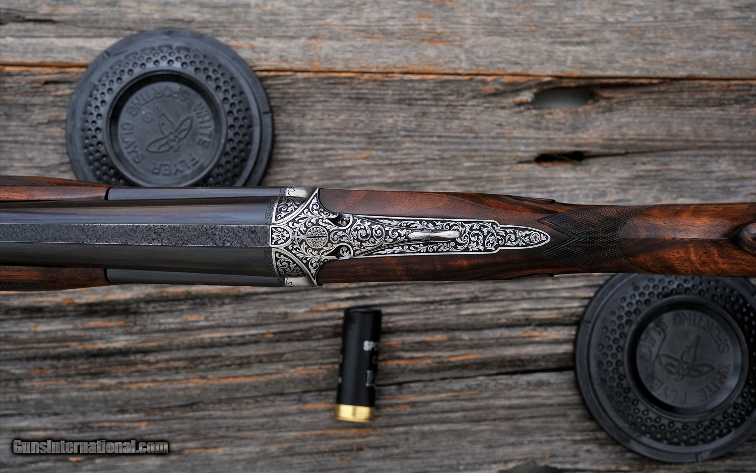 Description: One of only 59 single-barrelled trap guns built by James Purdey & Sons since 1922. This example was completed in June 1974 actioned by Ernest Lawrence engraved by Ken Hunt in Silver finish. Pistol grip stock with engraved cap and Monte Carlo comb. Square-backed guard. No Safety. Beavertail fore-end. Barrels numbered “1” and “2” in gold in Old English font with choke percentages on rear lump. Raised matted ventilated top rib. Spare top-lever spring mainspring ejector spring and spare striker Tumbler had an arrow indicator. SOLD Manufacturer: J. Purdey & Sons Model: SB Trap Caliber Info: 12 Gauge Ejectors: Yes Condition: Preowned Metal Condition: Very Good Barrels: 32 Action: Sidelock : Single Barrel Trap Triggers: Single Gauge Info: 12 Gauge Stock Comb: 1 1/4 Stock Heel: 1 3/8 Stock Cast: Off Fore End: Checkered LOP: 14 Rib: Ventilated Weight: 8.000000 Chokes: Full Case: Oak And Leather Lugg |