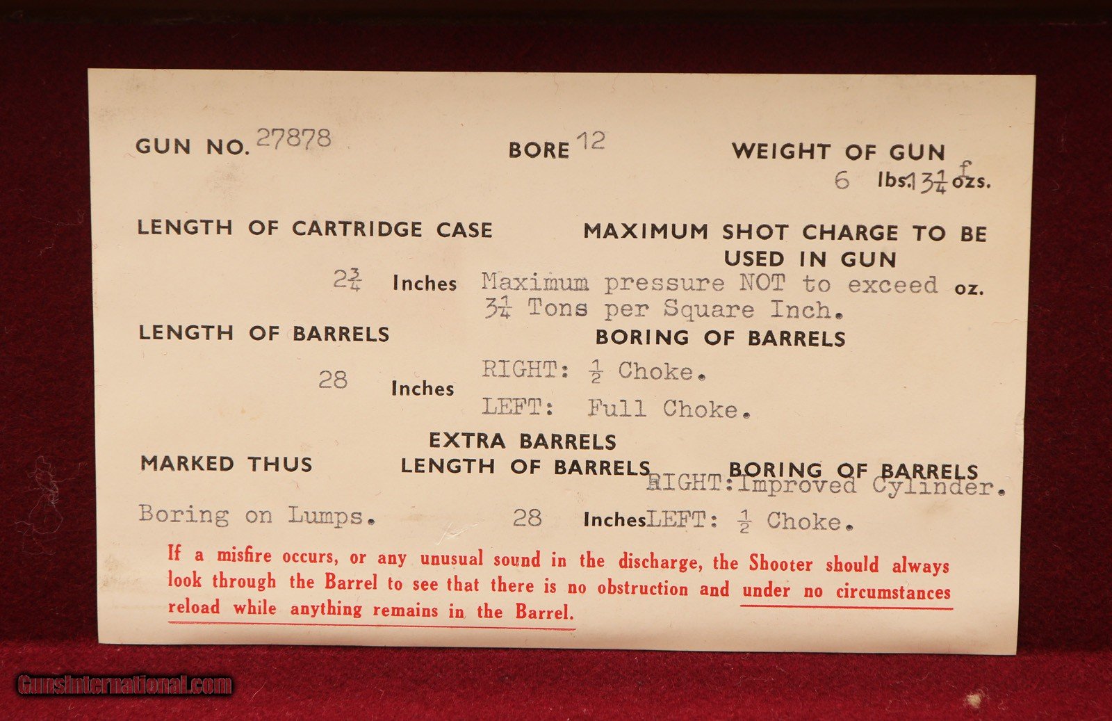 Description: 1973 - J. Purdey & Sons #27878 - - Extra Finish - 12ga - 2 Bbl Set - - - LOP 15-3/8" to Checkered Butt, Drop 1-1/2" to 2", Cast Off for the Right Hand, Weight 6 lbs. 13 oz.
