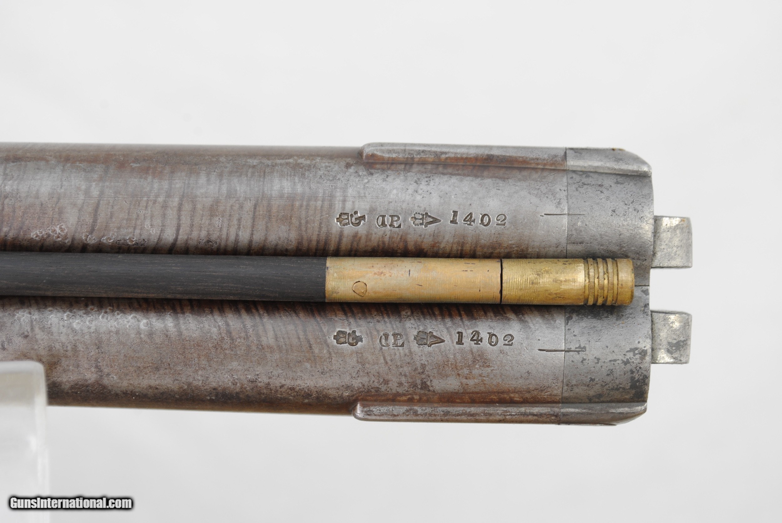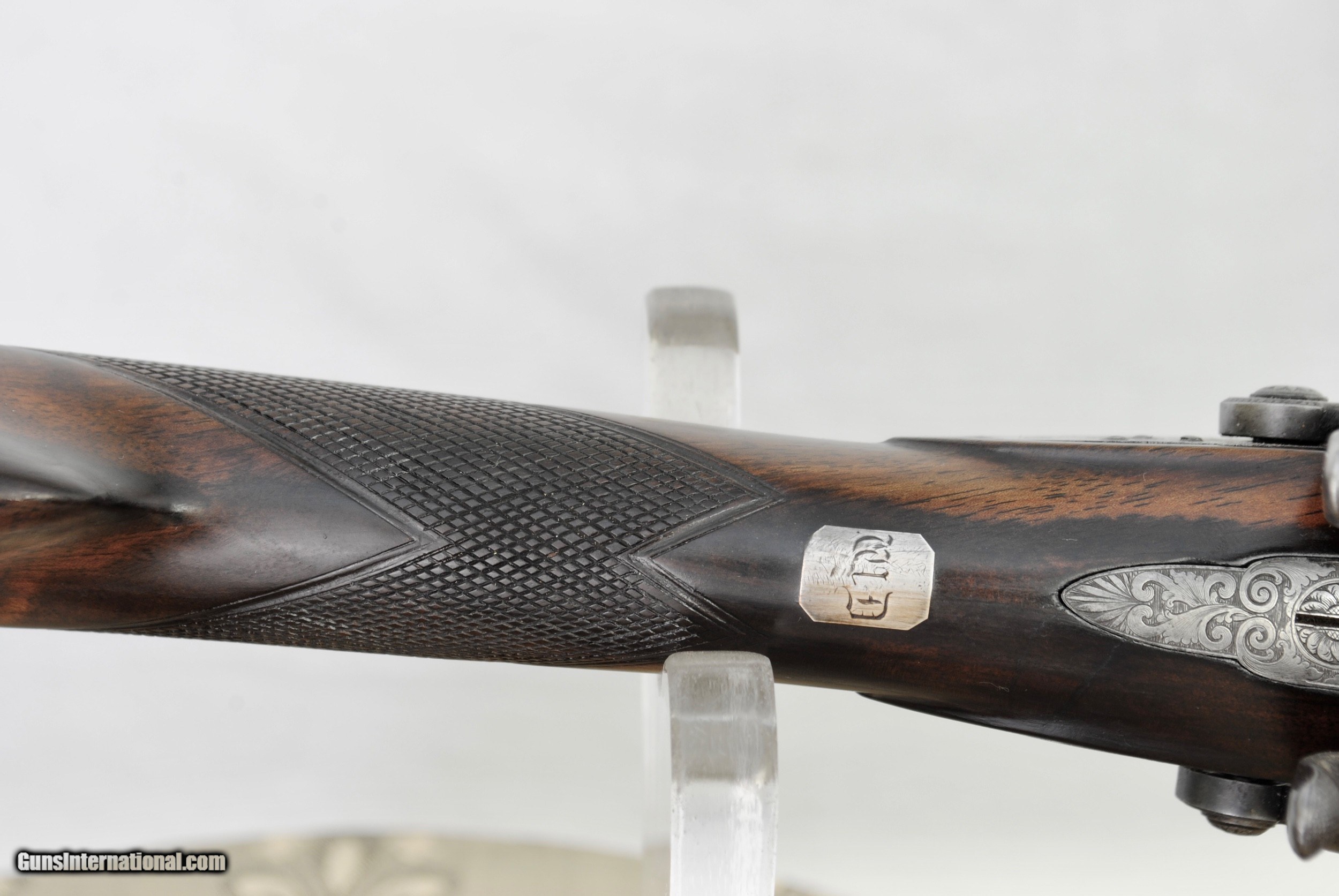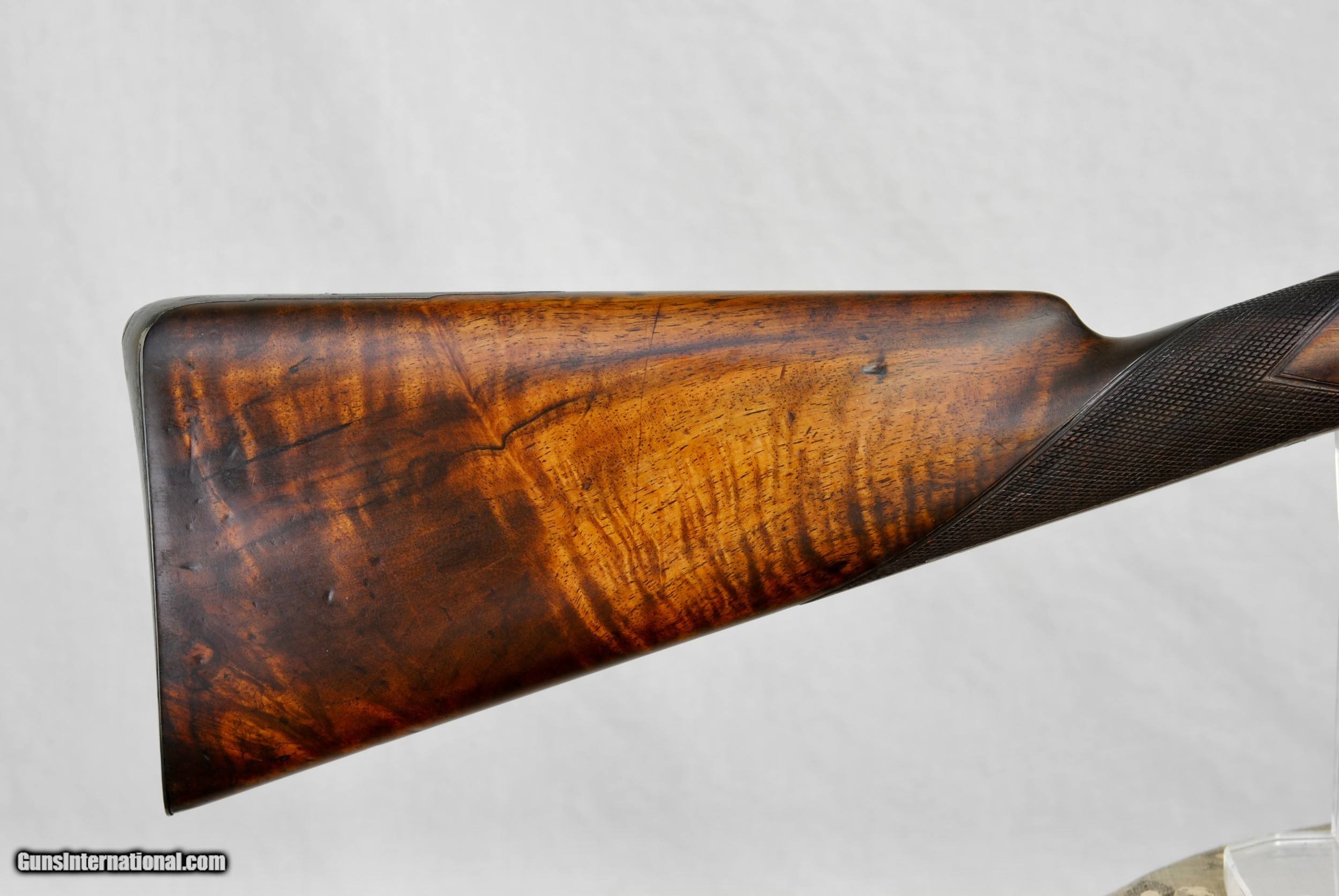 Description: Early Purdey Percussion Shotgun in 14 bore made in 1828. Exceptional original condition. Includes original case, accessories and ramrod that is serialized to the gun. Fully functional with locks as smooth as the day they were made, moving from fired, half cock and full cock in perfect timing. Twist barrels with platinum plugs. Barrels are in excellent condition inside and out. Minimum wall thickness in excess of 30/1000. Bores measure .691 - 14 Bore and stamped as such. Ribs are tight. Highly figured French Walnut stock with shield at wrist (initials - "WLD"). Barrels measure 29 1/4". Mahogany case with all the original accessories as shown - just add shot and powder and you are ready for the field. Weight of the gun is 6 LBS 12 1/2 OZ. Great stock dimensions with LOP of 14 3/8". Drop at comb of 1 1 1/2". Drop at heel of 2 1/4". Shipping by USPS Priority Mail is $150 and can be sent directly as local law allows. SOLD Antique: Yes Shotgun Gauge: 14 Gauge |