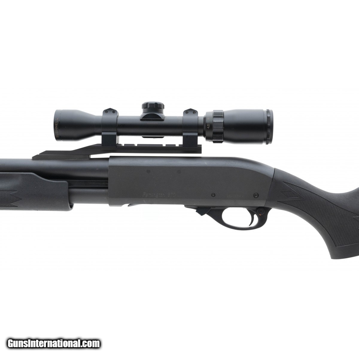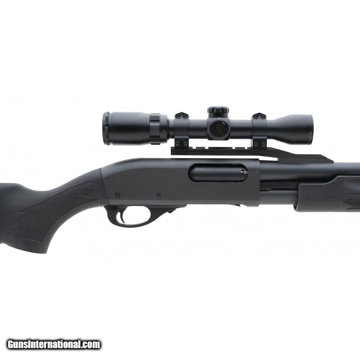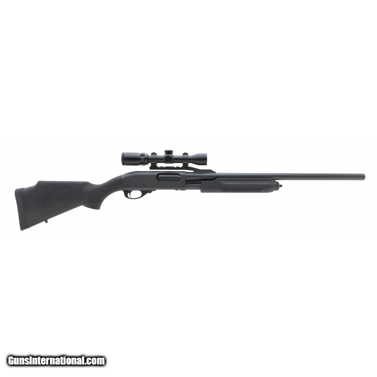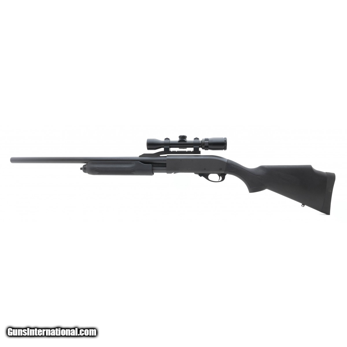 Pump slug gun with 23"" fully rifled barrel, matte finish and synthetic stock. Has a Bushnell 1.4x4.5 scope mounted. Excellent condition.