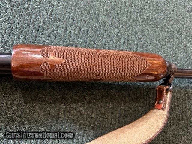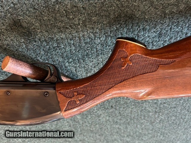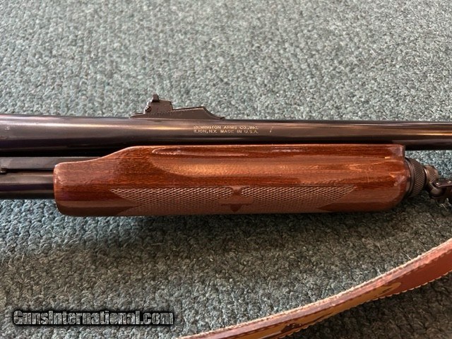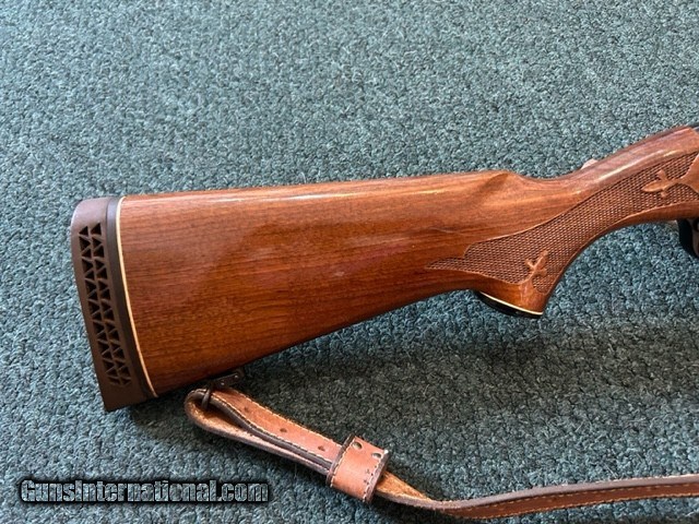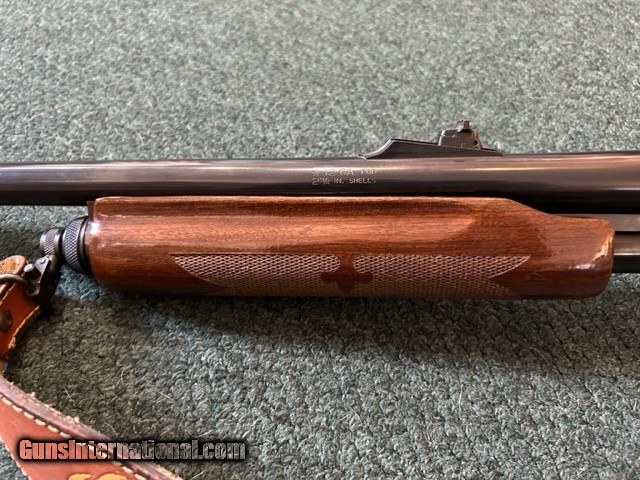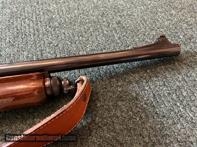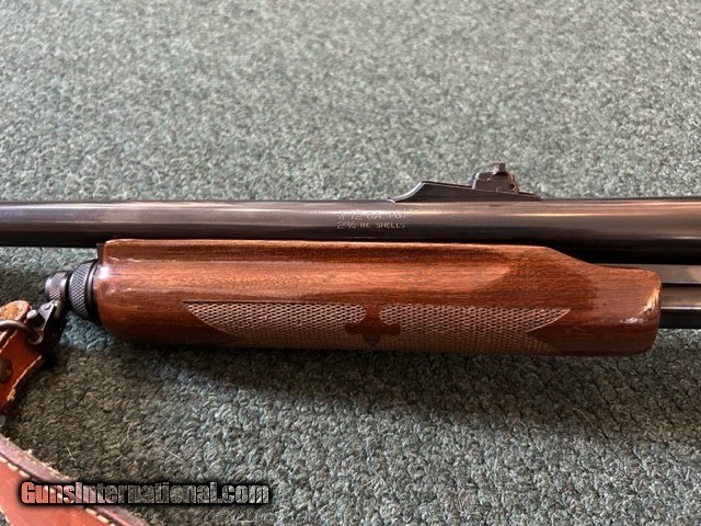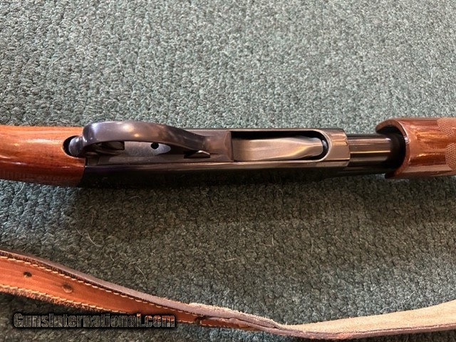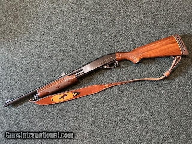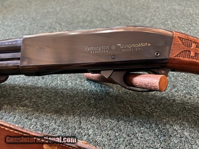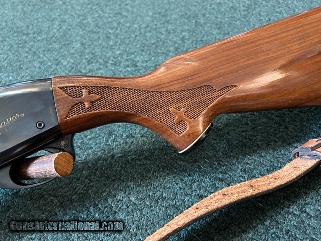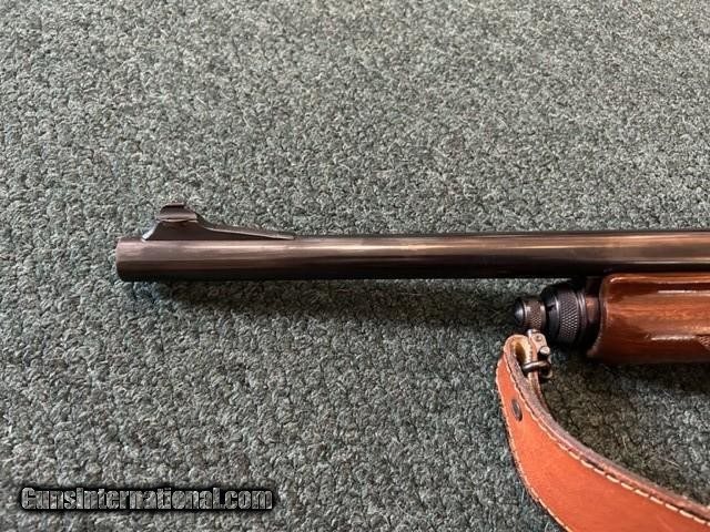 Description: Remington, 12ga, Mdl 870, Wingmaster, 2 3/4", 19 1/2" slug barrel, drilled and tapped for base on receiver, brass bead front sight, rear sight u shaped, improved cylinder choke, shiny finish, 99.9% overall condition, nice leather sling with deer head. Serial number V136933V. For further information and faster service call John at 941-224-5563. SOLD |