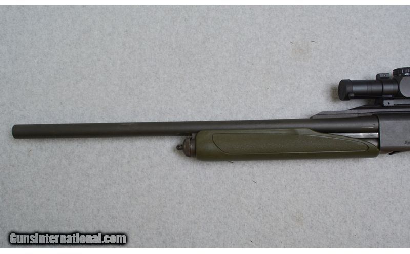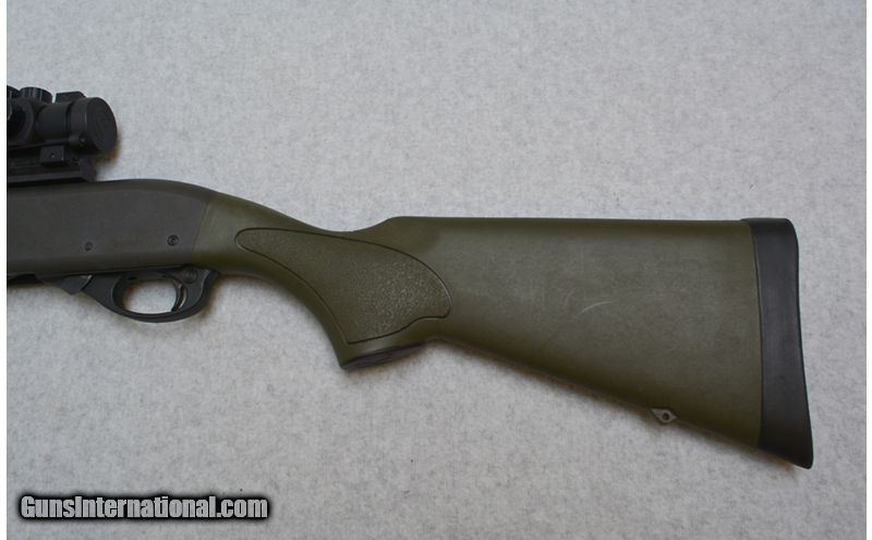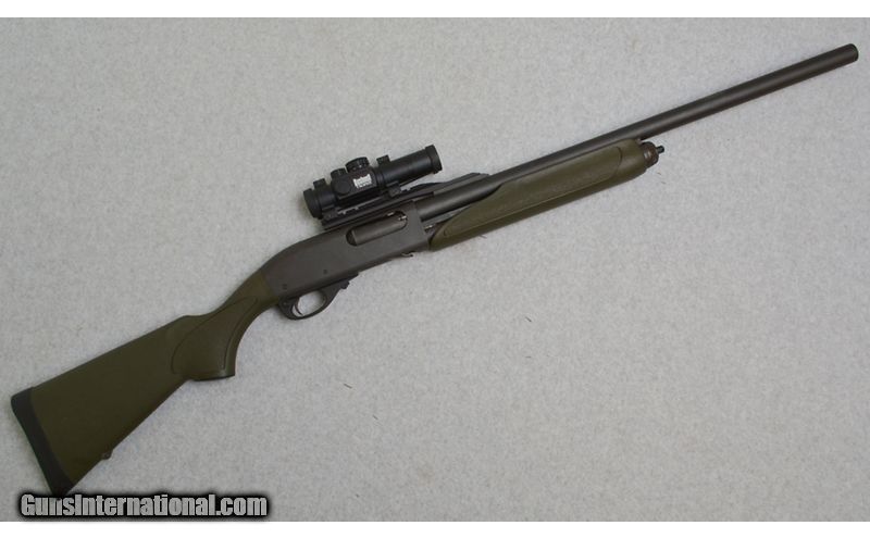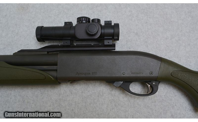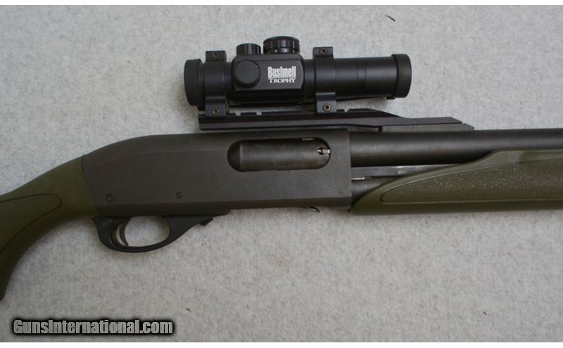 Description: This Green Remington 870 features; Matte finish 23" Rifled Barrel chambered for 2 3/4" & 3", and a Cantilever Mount sporting a Bushnell Trophy Red Dot. Has some blemishes on the barrel, is in very good overall condition. 12 Gauge SOLD Chambers: 2 3/4" & 3" Chamber Metal Condition: Very Good Bore Condition: Excellent Barrels: 23" Rifled with Cantilever Weight: 8 lbs. Sights: Bushnell Trophy Red Dot Item Location: Green Bay |