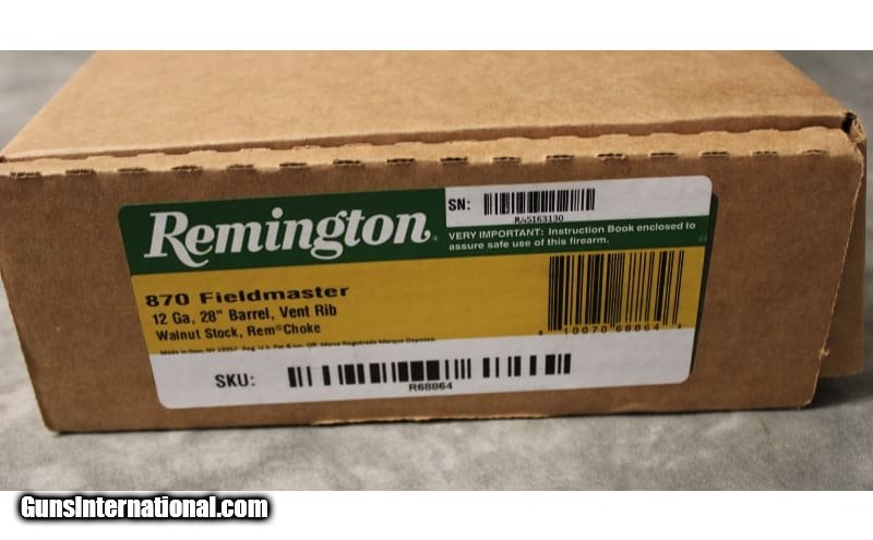 Description: Remington Arms Co 870 Fieldmaster 28" vent rib barrel with 3 screw in choke tubes, firearm comes with the origianl box and accessories and is in Like New condition. 12 Gauge SOLD Chambers: 3 Metal Condition: NIB Wood Condition: NIB Barrels: 28" Vent Rib Stock Dimensions: 14" LOP Weight: 7.4 lbs Sights: Single Bead Chokes: 3 Screw in Chokes Item Location: Auburn Hills, MI |