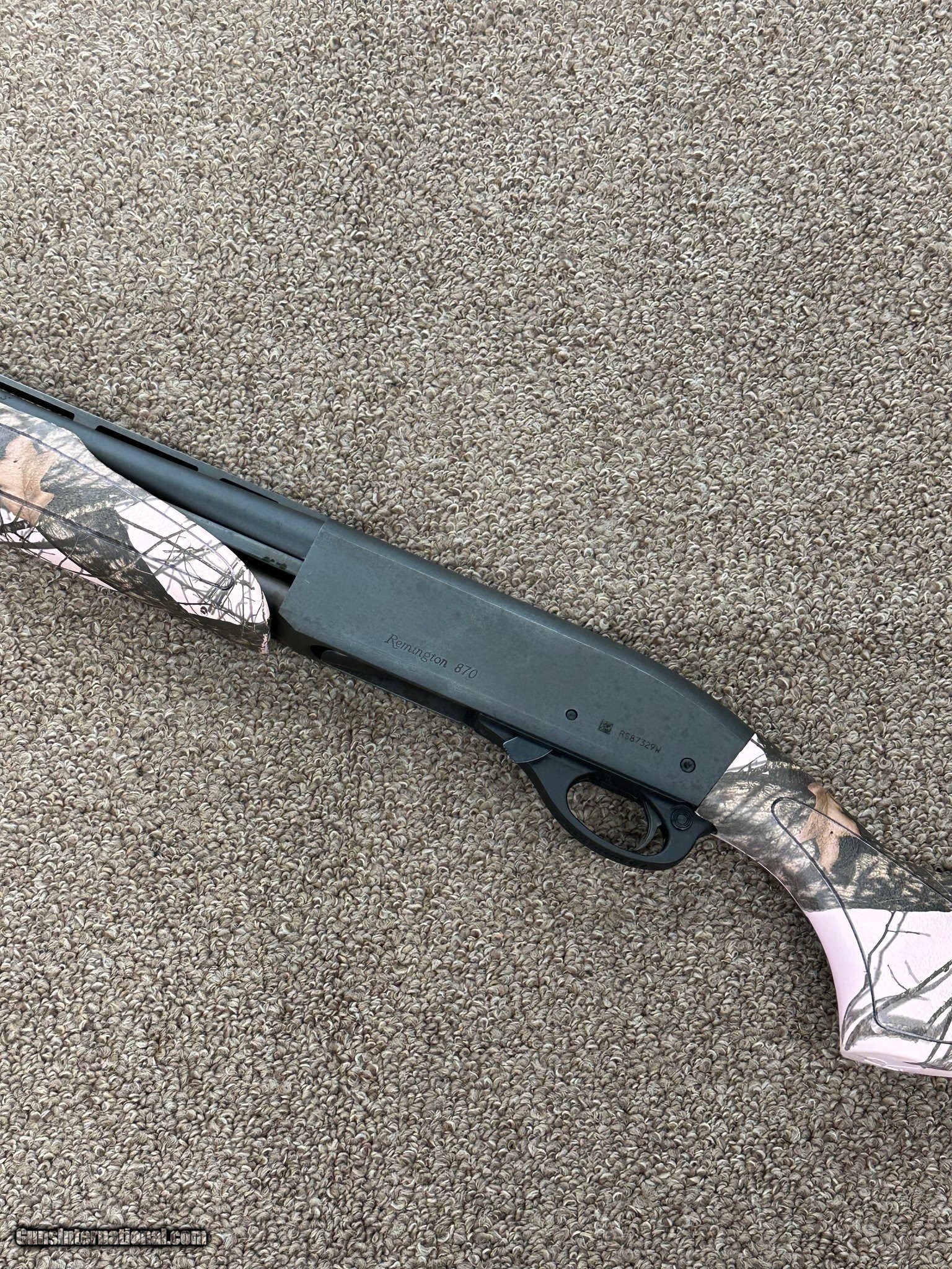 Description: Guns Listing ID: 392831 Used Remington 870 pink camo stock. Does have slight rust on receiver and scuffs on stock. SOLD Manufacturer: REMINGTON Model: 870 Condition: Used - Non-Certified Barrels: 21" BARREL Action: PUMP ACTION Gauge Info: 20 GA Finish: BLUE Weight: not specified |