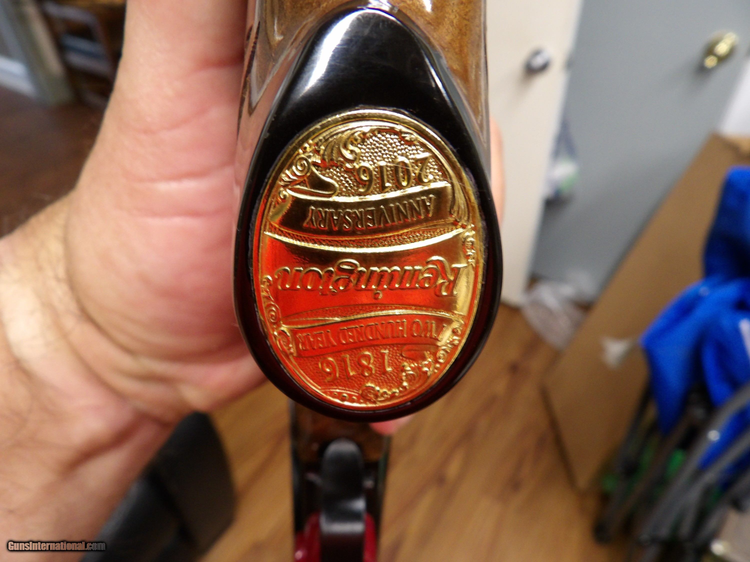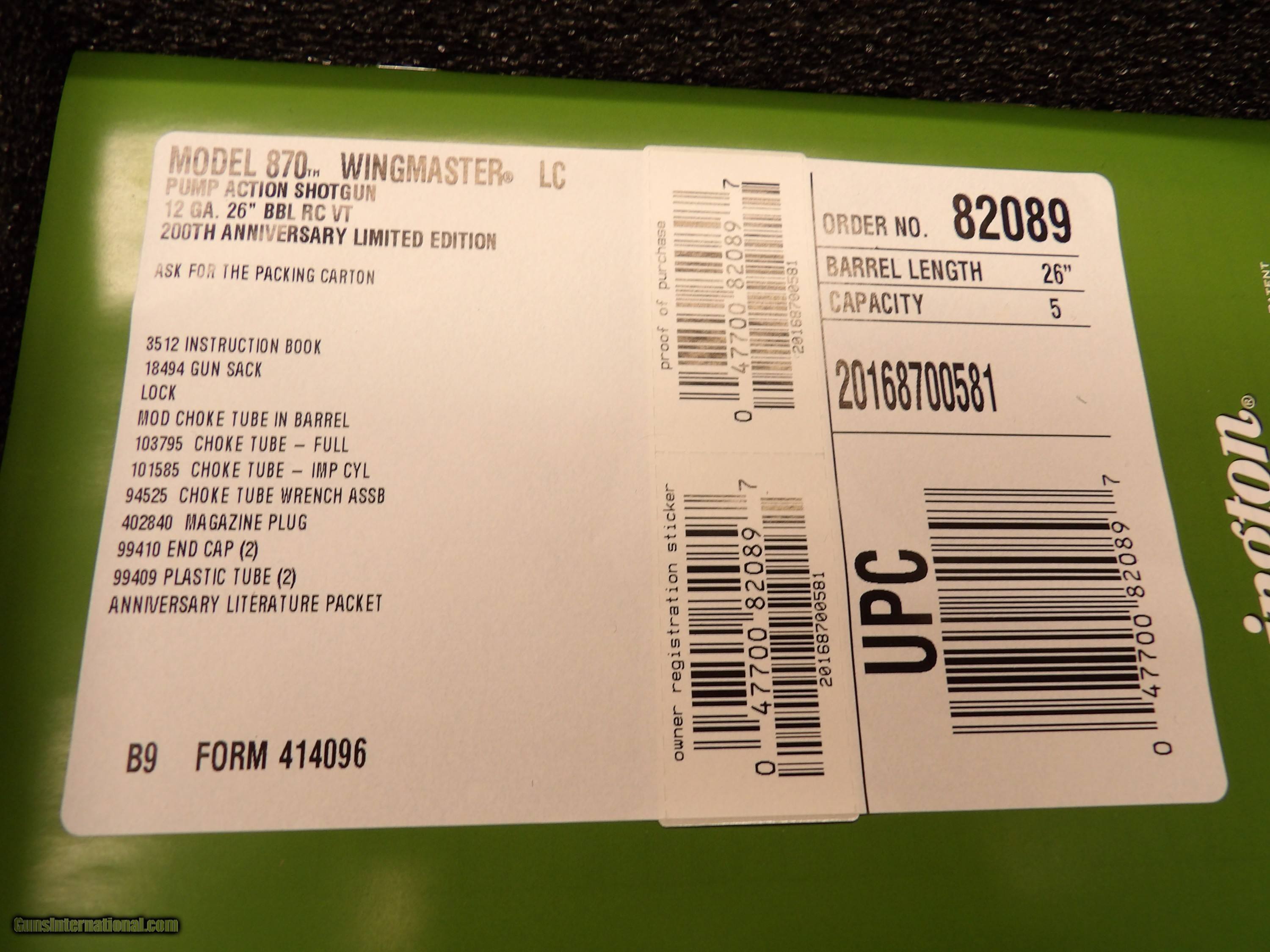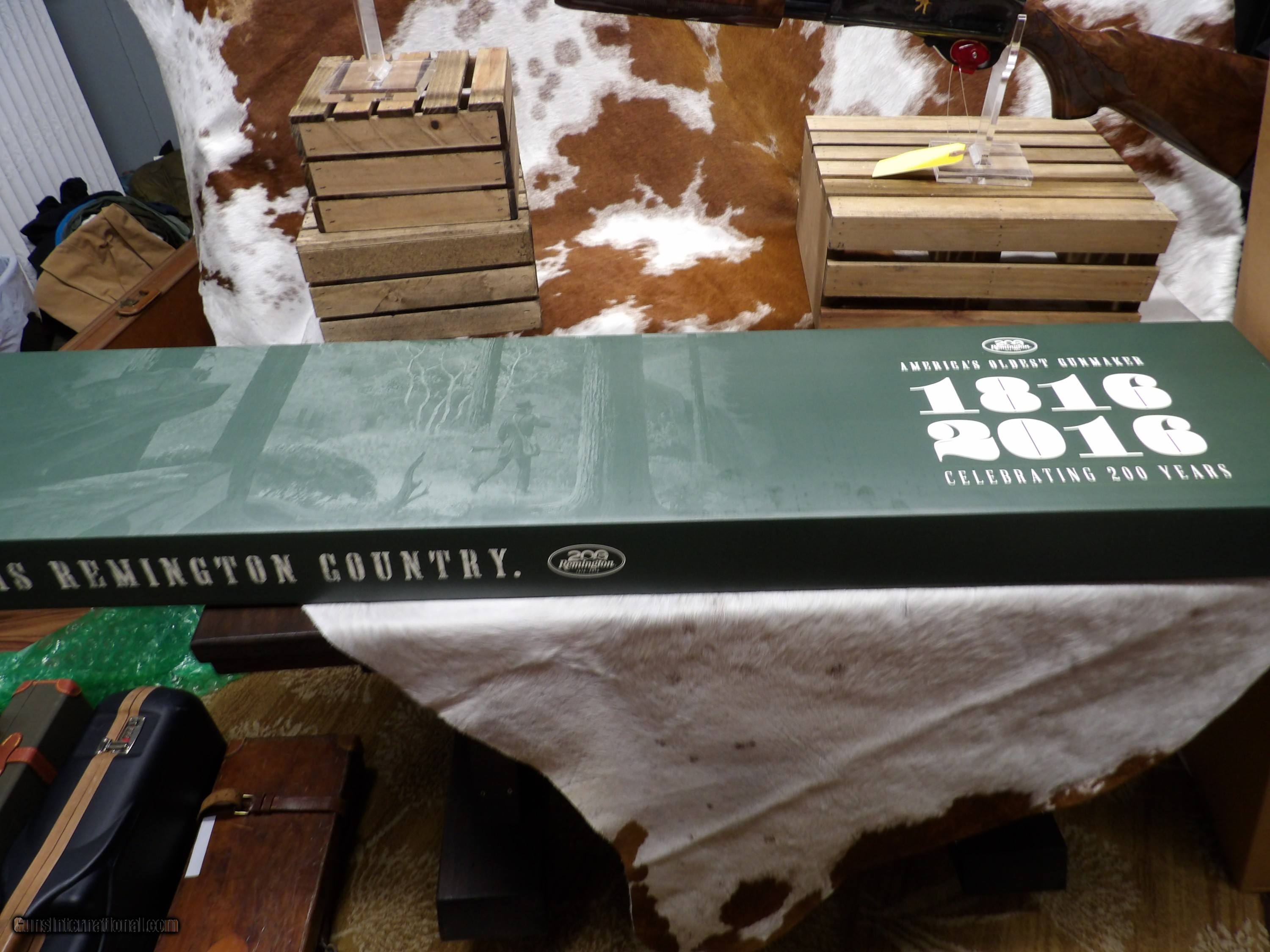 Description: Beautiful Rem 870 Pump, 200th Anniversary Edition. Includes factory box and protective sleeve. Beautiful engraving and lots of gold. Gold Barrel Band. Absolutely new condition never fired. It has choke tubes and beautiful lumber as well. SOLD Shotgun Gauge: 12 Gauge Manufacturer: Remington Model: 870 200th Anniversary Edition Barrel Length: 26 Bore: Perfect Chambers: 3 Condition: AS NEW Metal Condition: 100% Wood Condition: 100% Bore Condition: Perfect |