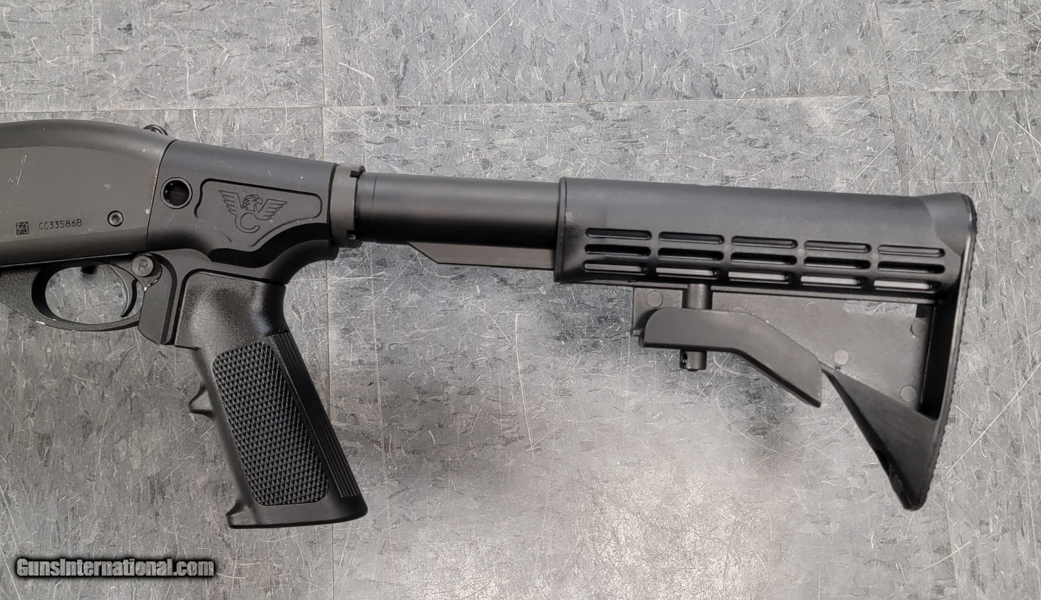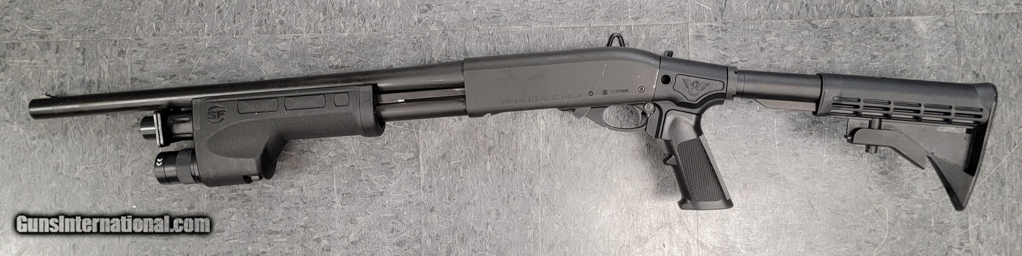 Description: Guns Listing ID: 921387 This is a Pre-Owned Remington 870 Police Magnum, it features a 18.5\" Barrel, a Surefire DSF forend, a 5 Round tube capacity, it is rated for 2 3/4 or 3\" shells. It has a improved cylinder choked barrel. It also features a Wilson Combat Stock adapter to allow use of a AR Grip and stock. This pre-owned shotgun shows signs of handling and firing. SOLD Manufacturer: REMINGTON Model: 870 POLICE MAGNUM Condition: Used - Non-Certified Barrels: 18.5 BARREL Gauge Info: 12 GA Finish: BLACK |