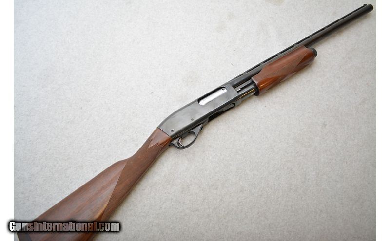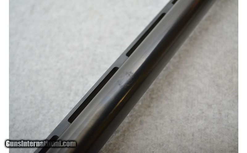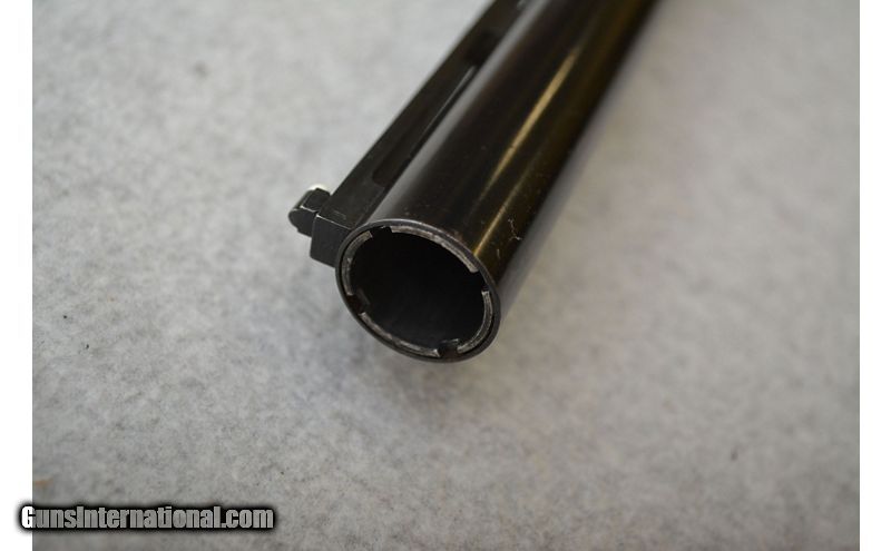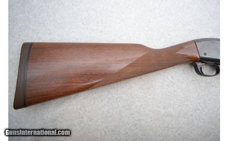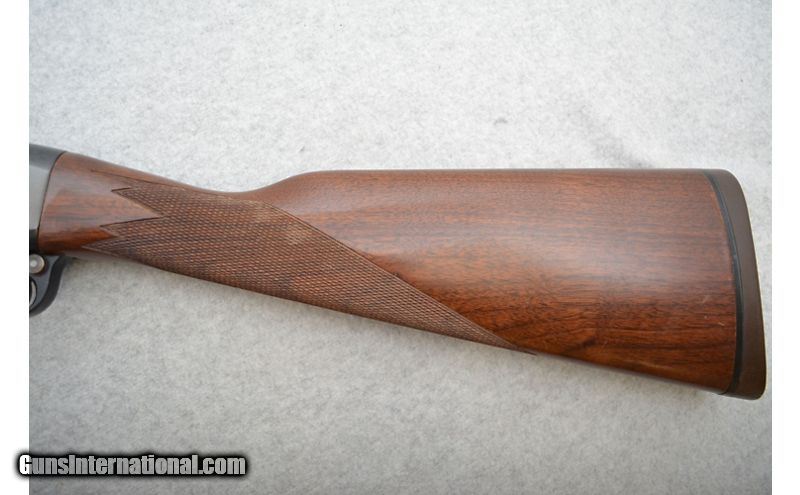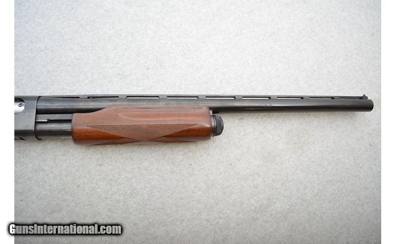 Description: Very good condition overall despite signs of field use. The metal of the barrel has a few patches of inactive surface rust. The largest is about 2/3's the size of a dime and is pictured. The receiver is rust free but has some scratches in the bluing. The magazine tube shows wear typical of use. The furniture is in good shape but also shows some evidence of field use. Scratches of very light to mild adorn the buttstock and pump handle; but none seem to be into the actual wood. Checkering is good to great overall but a few of the peaks in the checkering have been damaged on the buttstock. A single modified choke tube is included. 12 Gauge SOLD Chambers: Pump action fed from a tubular magazine and chambering up to 2¾" shells. Metal Condition: Good to very good. Wood Condition: Very good. Bore Condition: Excellent. Barrels: 21" Gloss blued with ventilated rib. Triggers: Narrow blued metal with smooth surface. Stock Dimensions: Semi-gloss finished walnut in "upland style" with a 14" LOP. Fore End: Semi-gloss finished walnut with wrap around diamond-in-diamond style checkering. Butt Pad: Brown rubber pad. Weight: 7lbs Sights: White front bead and stainless middle post. Chokes: A modified choke tube is included. Item Location: Green Bay |