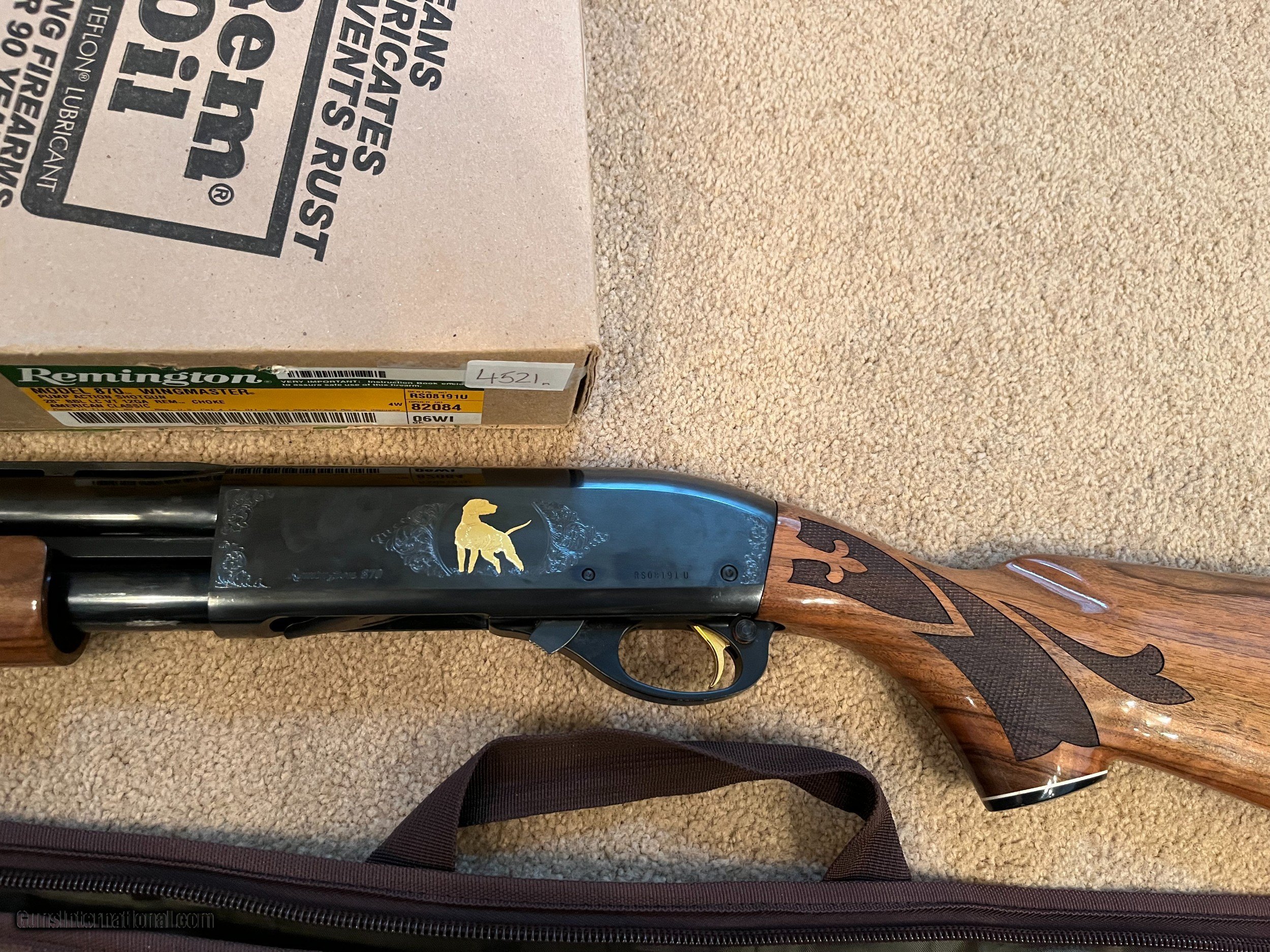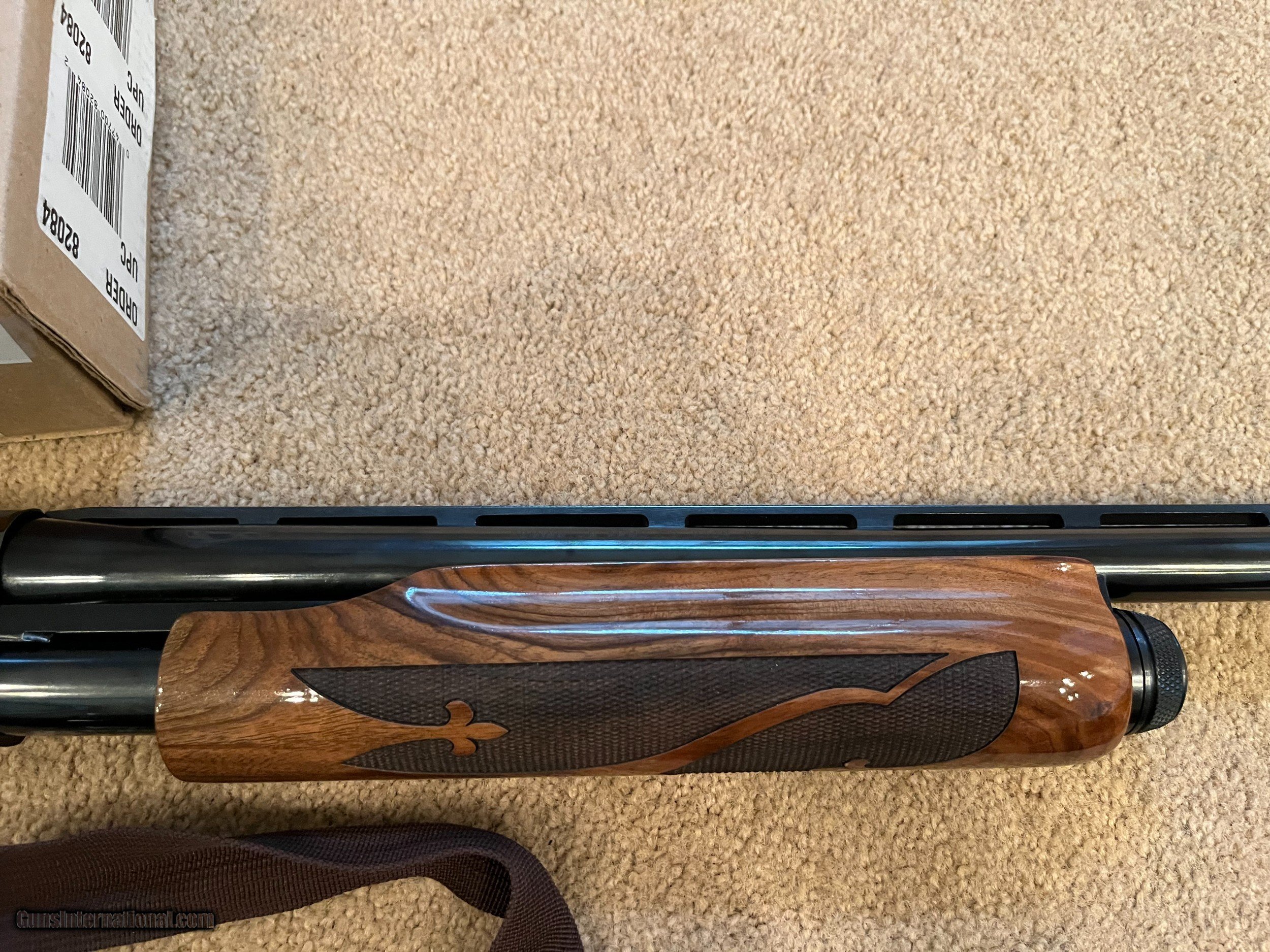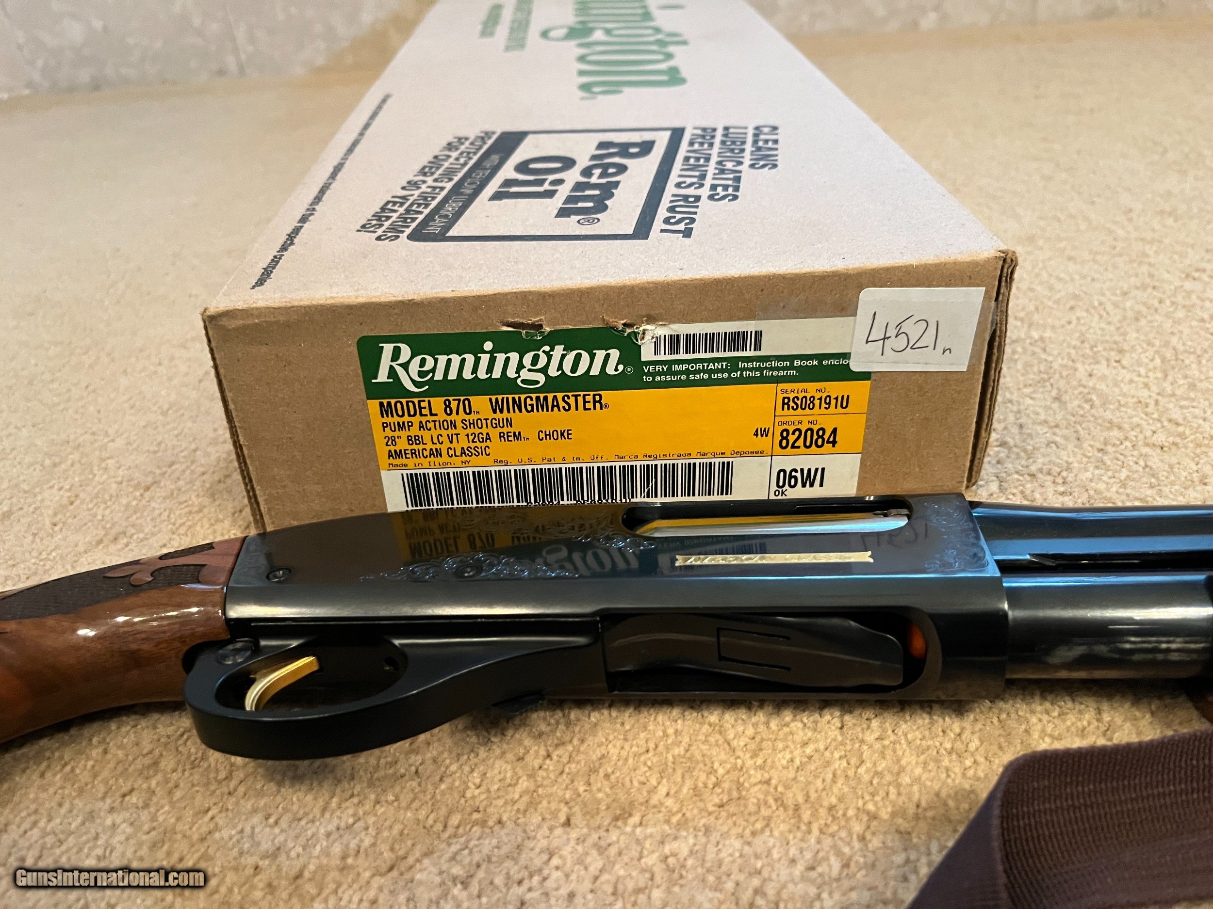 Description: Like new Remington 870 Wingmaster American Classic, these are unobtanium nowadays. 99% condition with original box and Full, modified, and improved cylinder chokes. 28-inch light contour barrel with vent rib (allows 2 3/4 and 3" shells). The engravings and wood are truly beautiful. Gold trigger, high polish beautiful blue finish, engraved receiver with gold filled " American Classic banner and gold hunting dog. The wood is a very fine nicely figured Grade B walnut forearm and stock with high gloss finish, black diamond grip cap with diamond insert, and ventilated red recoil pad. **NOTE, the stock has a 13.6" length of pull rather than 14". The pump action cycles like a sewing machine.with confidence. SOLD Shotgun Gauge: 12 Gauge Manufacturer: Remington Barrel Length: 28 Condition: 99% LOP: 13.6 Rib: Vented |