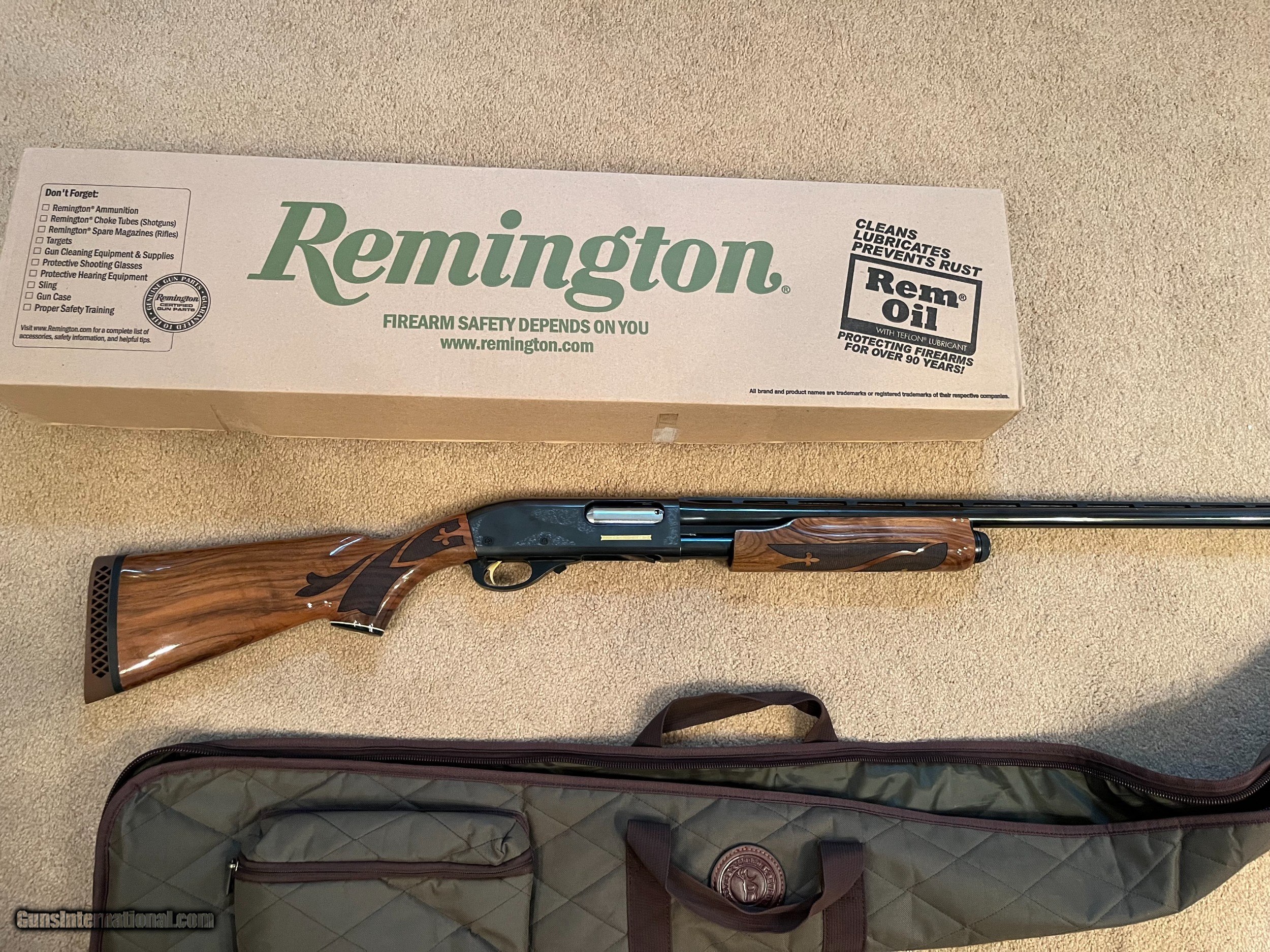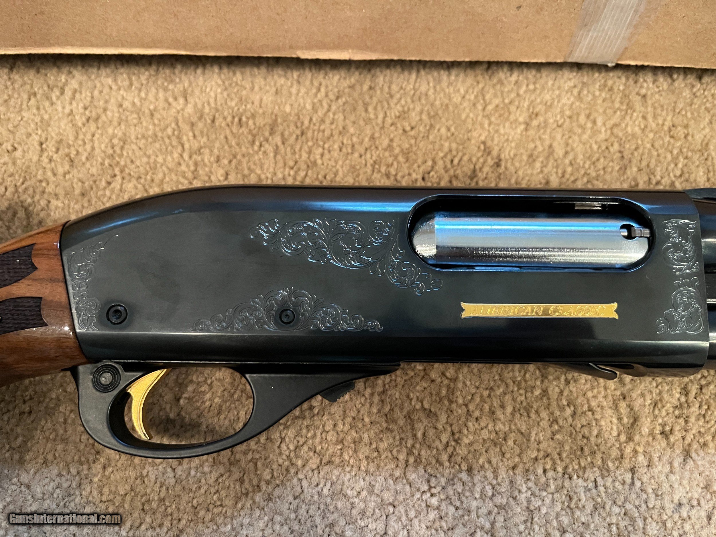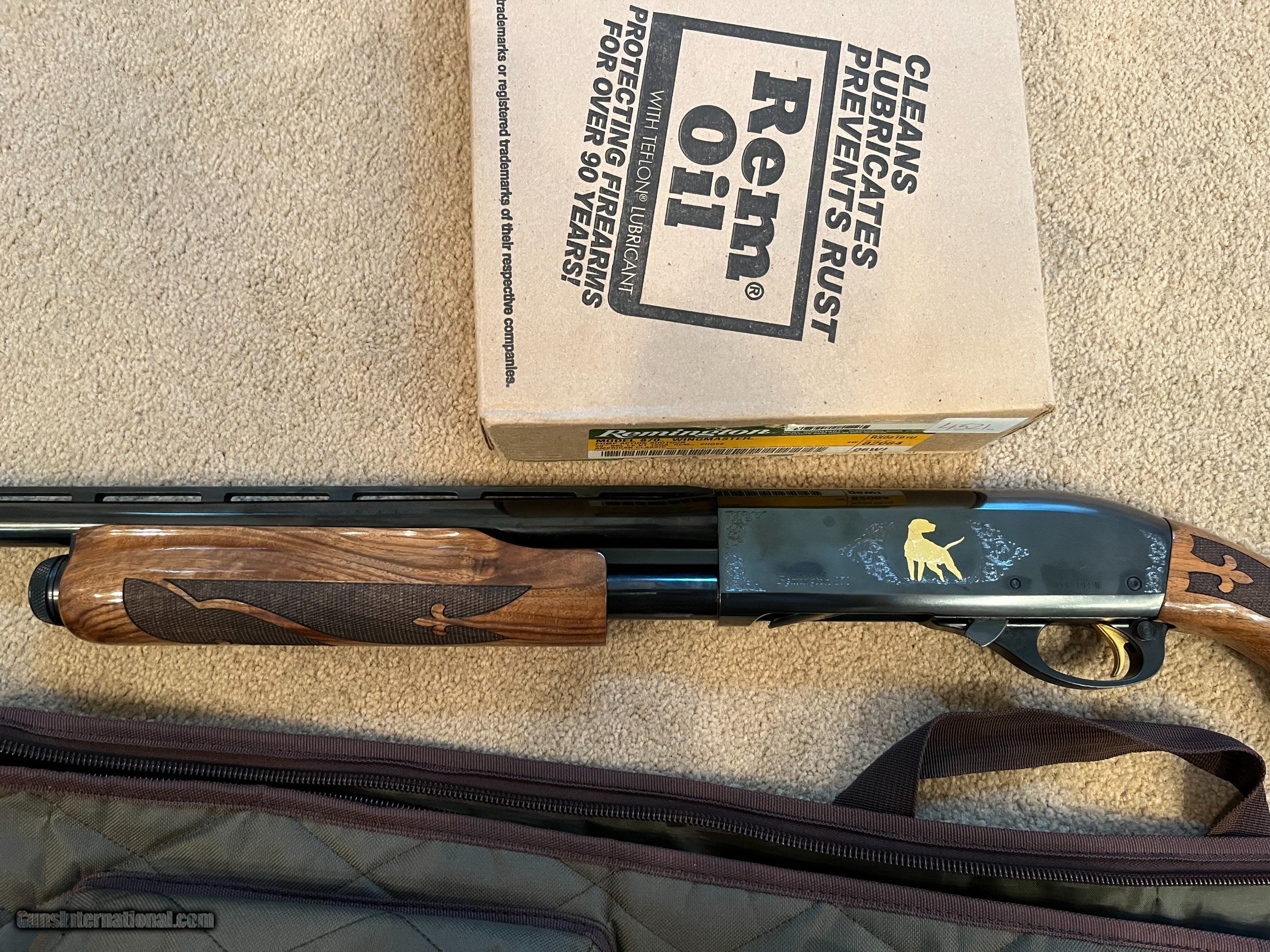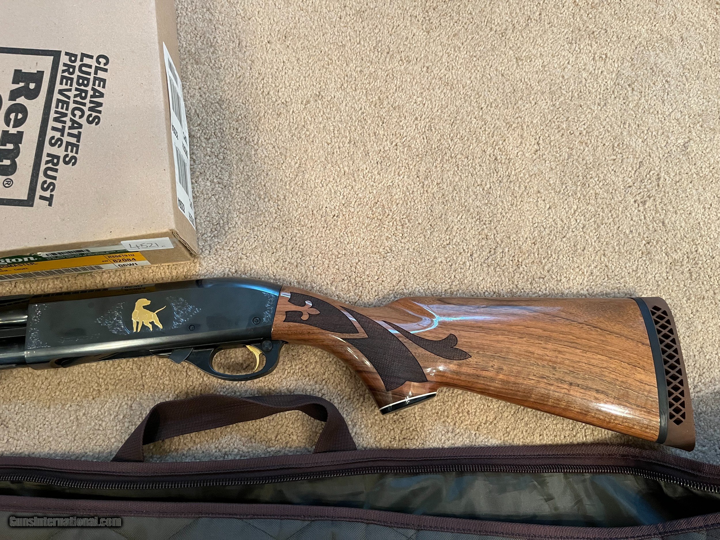 Description: Like new Remington 870 Wingmaster American Classic, these are unobtanium nowadays. 99% condition with original box and Full, modified, and improved cylinder chokes. 28-inch light contour barrel with vent rib (allows 2 3/4 and 3" shells). The engravings and wood are truly beautiful. Gold trigger, high polish beautiful blue finish, engraved receiver with gold filled " American Classic banner and gold hunting dog. The wood is a very fine nicely figured Grade B walnut forearm and stock with high gloss finish, black diamond grip cap with diamond insert, and ventilated red recoil pad. **NOTE, the stock has a 13.6" length of pull rather than 14". The pump action cycles like a sewing machine.with confidence. SOLD Shotgun Gauge: 12 Gauge Manufacturer: Remington Barrel Length: 28 Condition: 99% LOP: 13.6 Rib: Vented |