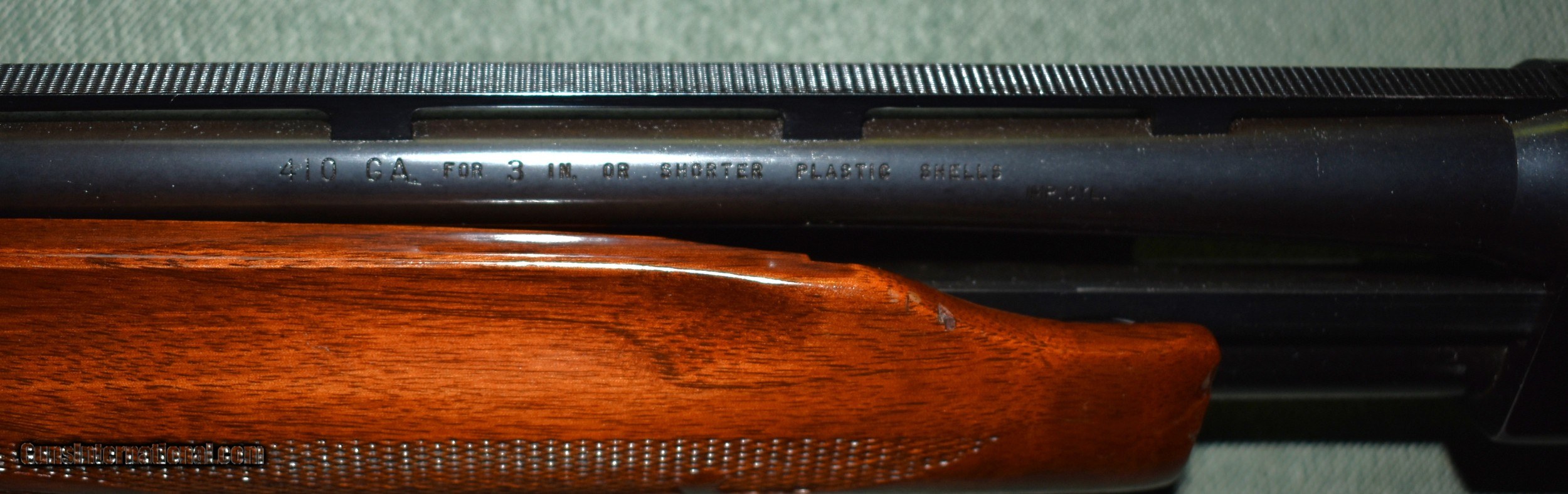 Description: Remington model 870 Wingmaster LW 410 built in 1987. This gun has a 25" vent rib barrel choked improved cylinder. The gun is in excellent original condition retaining 98% of the original blue and wood finishes. The bore is mint and the action works smoothly. The gun is chambered to fire either 21/2" or 3" shells. A great little gun for preserve shooting or clays. Hard to find in this gauge. SOLD Shotgun Gauge: .410 Gauge Manufacturer: Remington Model: 870 LW Serial Number: V898944H Barrel Length: 25 Chambers: 21/2" or 3 Condition: excellent Metal Condition: excellent Wood Condition: excellente Bore Condition: mint Action: Pump Rib: Ventilated Manufacture Date: 1987 Chokes: Improvec Cylinder |