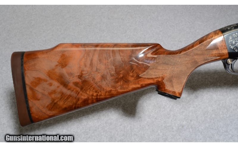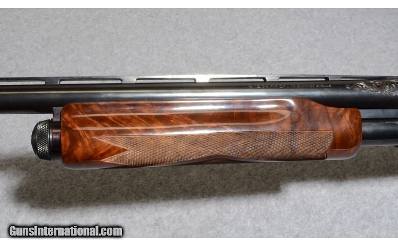 Description: One of the highest grade Remington Model 870's ever manufactured. Features full vent rib barrels with double beads, hand engraved at breech, fully engraved frame (all in leaf scroll), engraved trigger guard. Left side of frame has a gold shield with red, white and blue enamel with eagle that reads "Model 870 All American Trap Gun". The stocks are a deluxe highly finished, ornately checkered pistol grip fiery grain with solid brown rubber recoil pad. Bolt has light engraving. There were 1000 made. 12 Gauge SOLD Chambers: Pump Action Metal Condition: Excellent Engraved Wood Condition: Excellent Bore Condition: Excellent Barrels: 30 Triggers: Factory Trigger Stock Dimensions: "14 1/4"" LOP, 1 5/8"" DAC, 1 3/4"" DAH Fore End: Checkered Fine Walnut Butt Pad: Remington Rubber Butt Pad Sights: Vented Rib with Front and center Bead Chokes: Full Choke Item Location: Tulalip, WA |