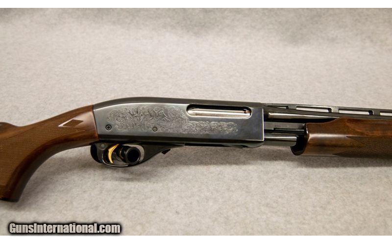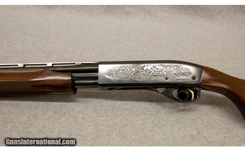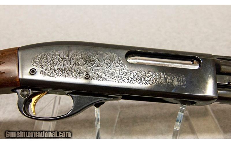 Description: Remington Model 870, chambered in .410 Gauge. Beautiful 870 with checkered stock and forearm. Features very nice engravings of game birds and a dog. Wood is in excellent condition as is the bluing. .410 Bore SOLD Chambers: ".410 Gauge 2 1/2, 3' Metal Condition: Very Good Wood Condition: Very Good Bore Condition: Very Good Barrels: 25' Stock Dimensions: 14' Butt Pad: Hard Plastic Sights: Single White Bead Chokes: Full Item Location: Fort Mill, SC |
