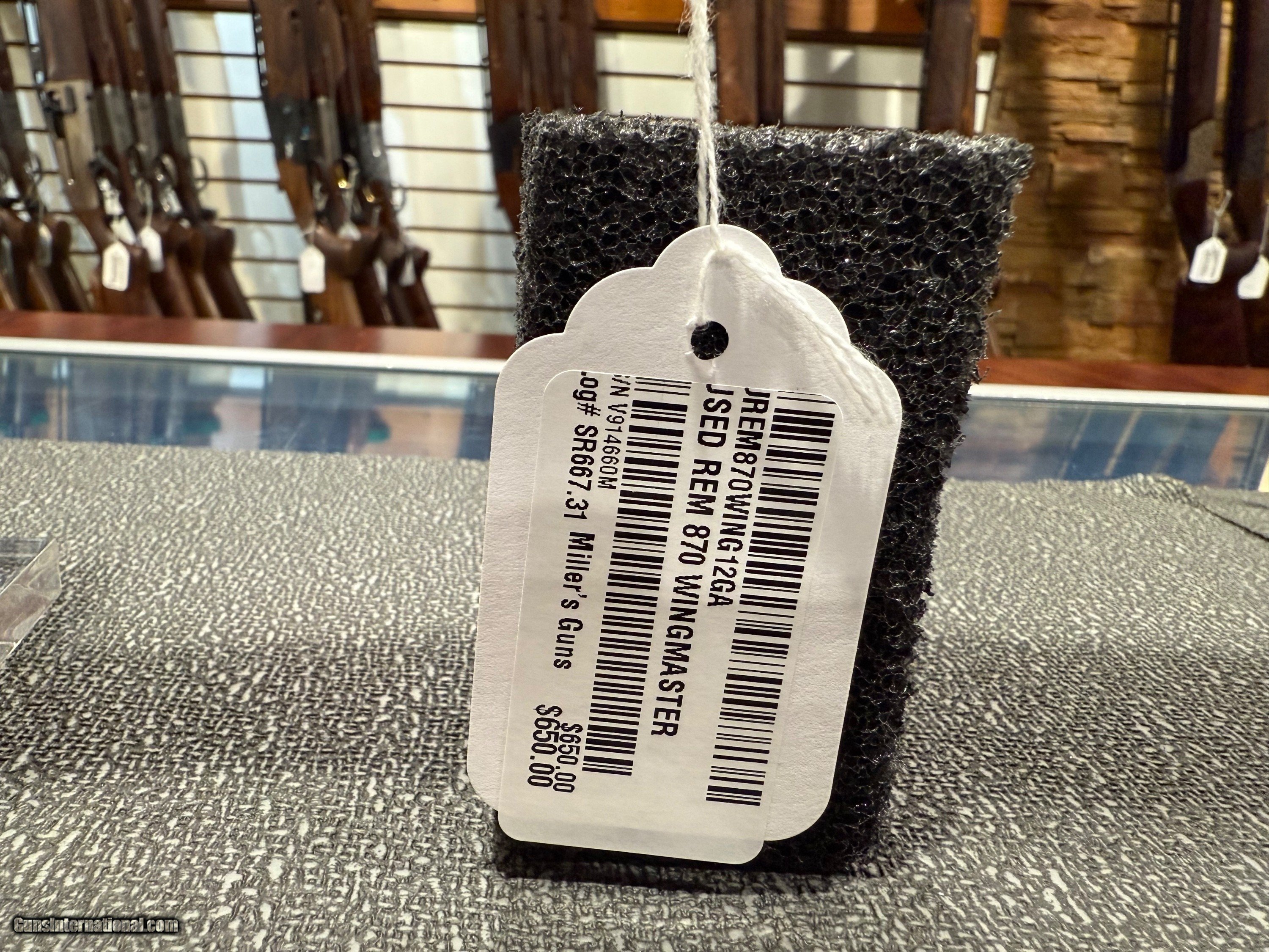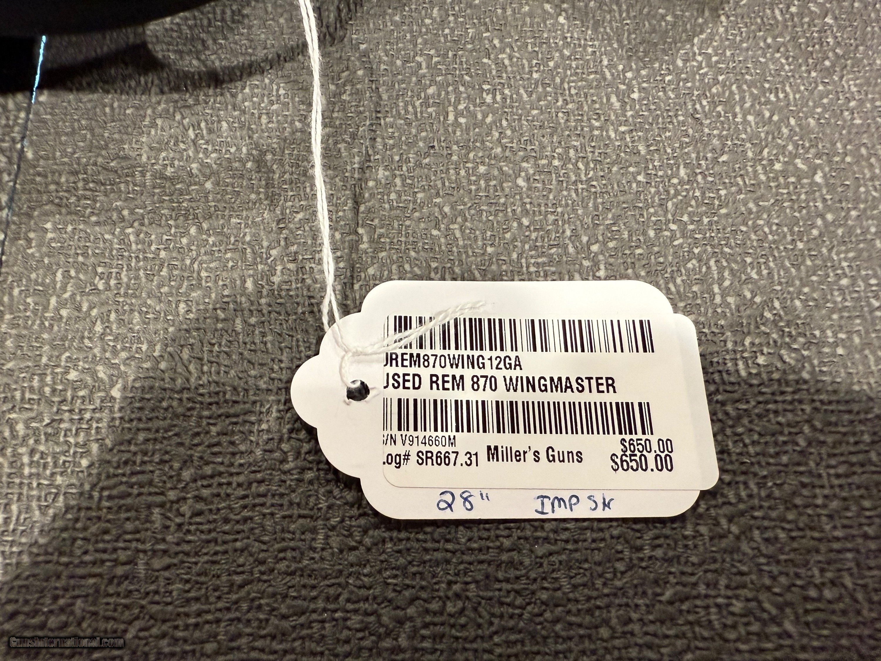 Description: USED Remington 870 Wingmaster 12ga Pump action 28" barrel 3" chamber IMP-SK choke No box / No case Shotgun Gauge: 12 Gauge Manufacturer: Remington Model: 870 Wingmaster Serial Number: V914660M Barrel Length: 28 Condition: GOOD Price: $650.00 Contact Seller |