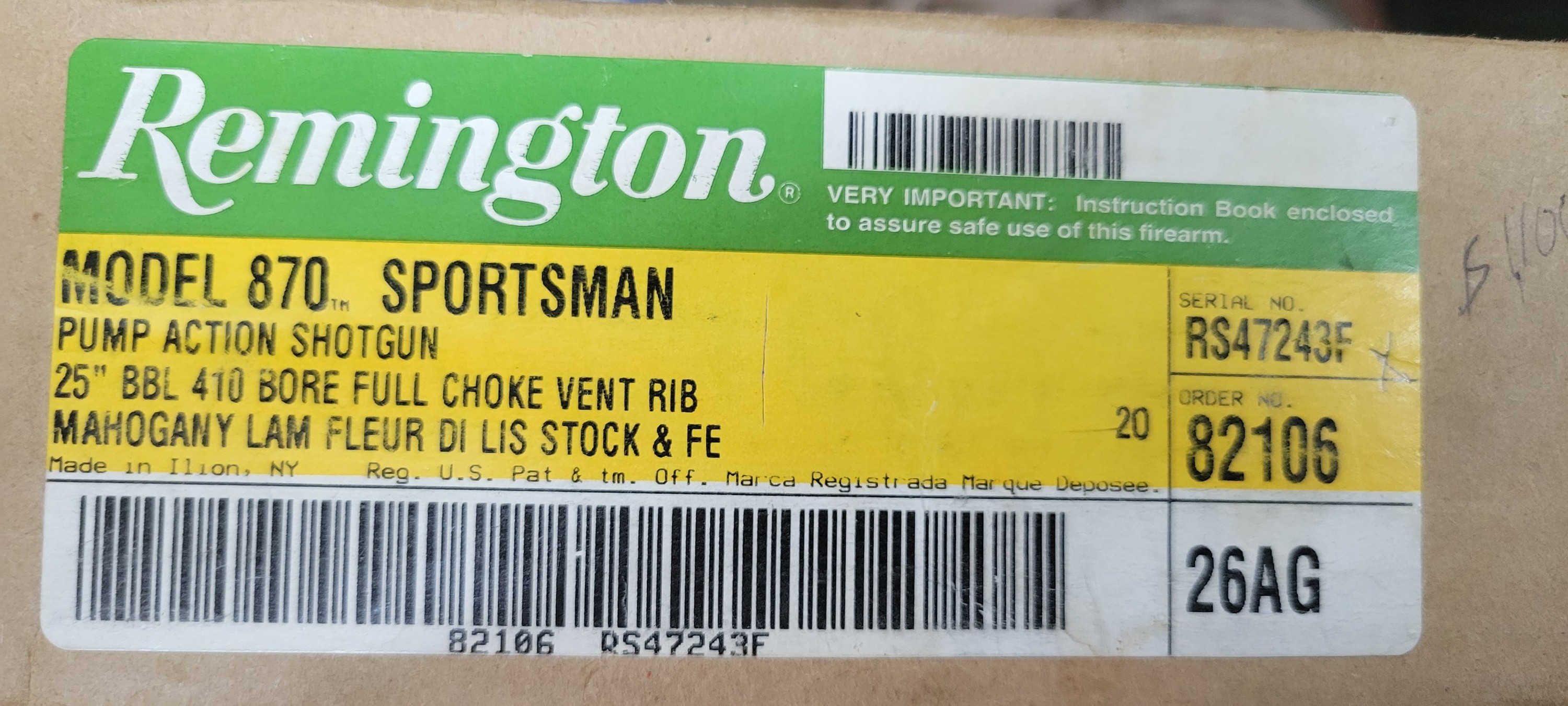 Description: New in box and never fired. Remington 870 sportsman in hard to find 410. This a mahogany laminated stock with beautiful fluer markings. It has a 25" vented rib barrel. Shipping is $60 insured. Cc fee 3%. SOLD Shotgun Gauge: .410 Gauge Manufacturer: Remington Model: 870 sportsman Barrel Length: 25 vent rib |