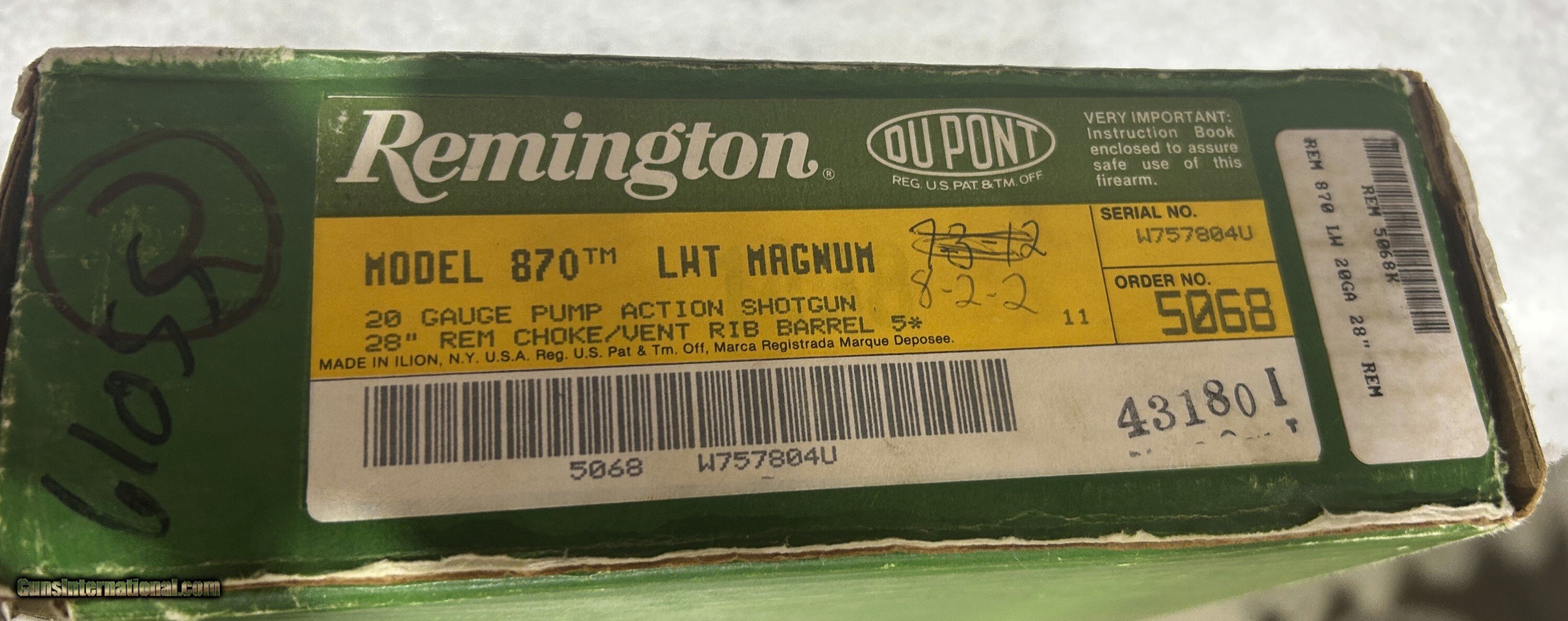 Description: NIB REMINGTON 870 LTW MAGNUM 20 GAUGE, WITH REM CHOKES ( MISSING WRENCH ) $750.00 + $55 SHIPPED TO YOUR FFL FOR PAYMENT I ACCEPT: POSTAL MONEY ORDERS SHIPS NEXT DAY PERSONAL CHECKS. MY BANK REQUIRES 11 BUISNESS DAYS TO GUARANTE ME FUNDS FOR CHECKS I WILL SHIP DAY 12 SOLD |