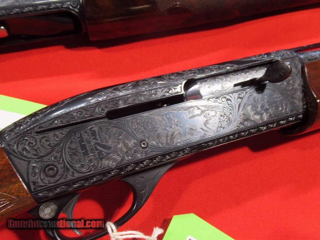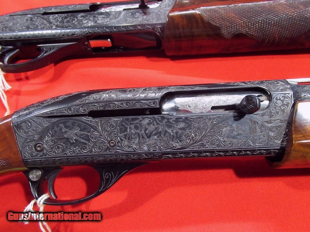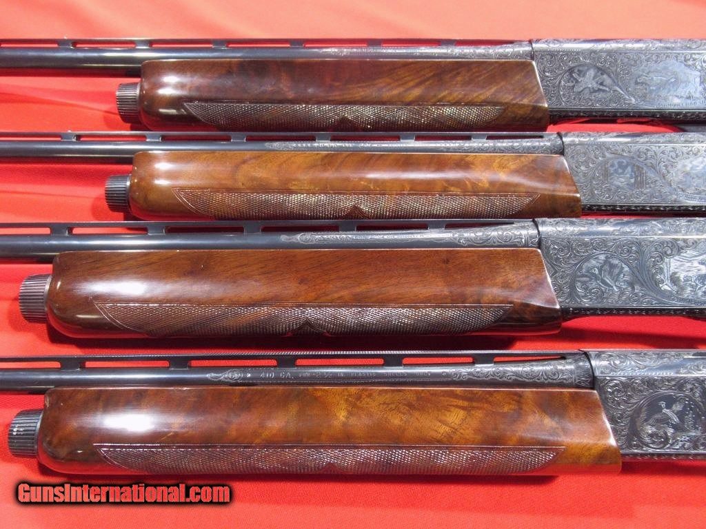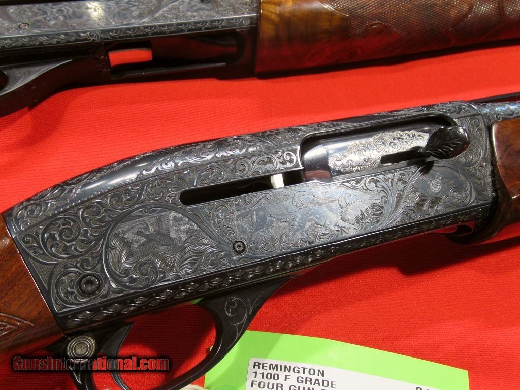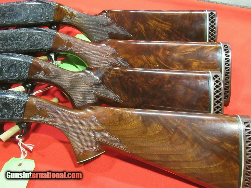 Description: FOUR GUN SET of Remington 1100 F Grades (12/20/28/410) w/ CONSECUTIVE SER. #s -- Ultra rare and seldom encountered. This is a once in a lifetime opportunity at a four gun set of Remington 1100 F Grade Skeet Guns with consecutive serial numbers. These gun feature full coverage game scene engraving in scroll with highly figured stock and forends. This would be the centerpiece of any Remington gun collection. Please call for details. SOLD |