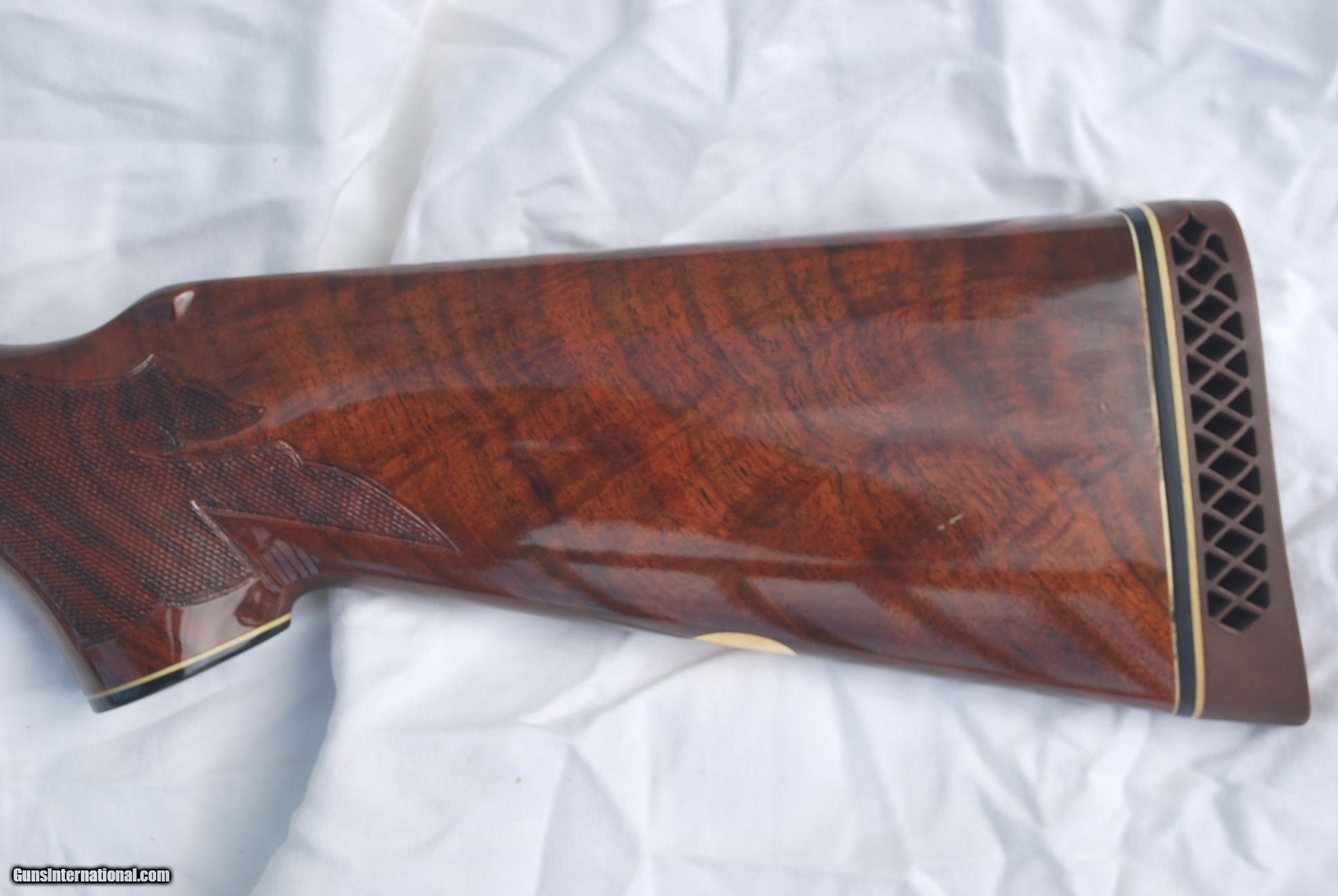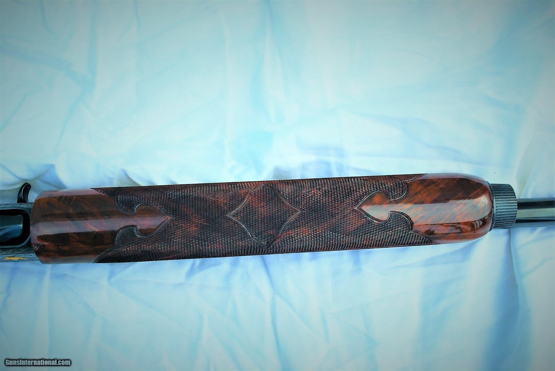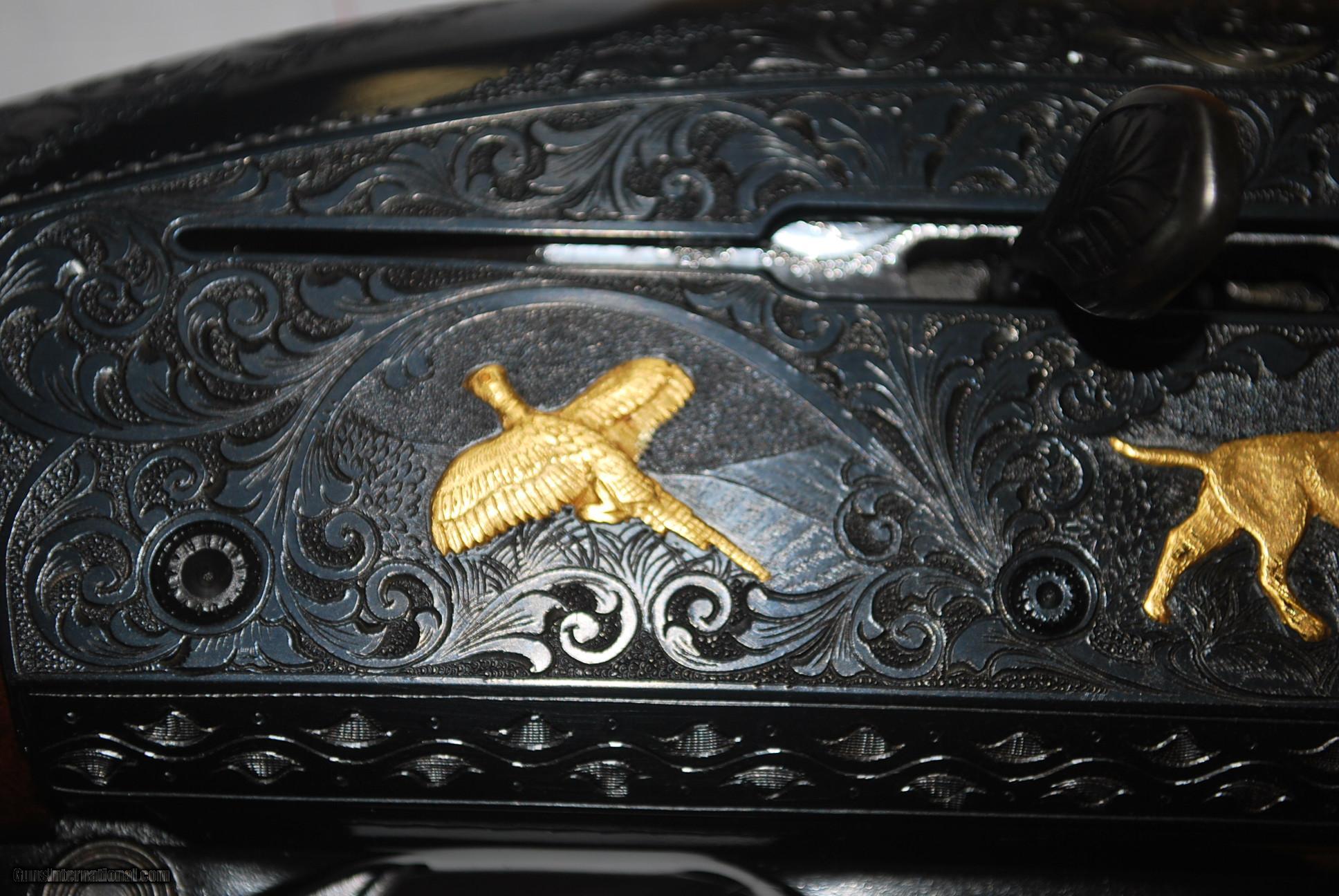 Description: Remington F Grade Gold Premier Model 1100 12ga—Factory Custom Shop 3 barrel set. ---circa 1980 ---Original Condition ------ Has not been refinished or re-blued----- Receiver engraved by Remington factory engraver Leo Walter Bala and is marked “ L W B 80 “ on the left side of the receiver. The receiver adorns 9 exquisitely done gold inlays of dogs and game.------ This shotgun left the factory Custom Shop as a 3- barrel set. The first barrel is a 12 ga 30” vent rib, fixed Full choke. The second is a 25” 12ga vent rib, fixed Skeet choke. The third is a 28”12ga vent rib, fixed Mod choke.------- All three barrels have F-grade engraving on the chamber section of the barrel. All 3 barrel bore are bright and shiny with no dents or rust.------ Stocks are made from the best wood Remington had to offer , numbered to the gun with only the smallest of handling marks.------- This F-Grade 1100 has been fired and has wear on its internal surfaces, mainly the magazine tube and barrel section in the receiver. All three barrels have mirror bores with no dents, rust or scratches.-------- The receiver is in very good condition, still bright blue overall.-------- Please look at all the photos as they reflect the true condition of this exceptional piece of art.---- I will only ship to an FFL in good standing and is will to sent a copy of their FFL to a private seller.---Please confirm with your FFL--- I recommend the buyer to be present when the FFL unpacks the firearm. Instruct your FFL to not except the package if there is any signs of shipment damage. I will except USPS Money orders only----Shipping and Insurance a flat fee of $40.00 to any lower 48 states SOLD Manufacturer: Remington Model: 1100 F Grade Gold Premier Condition: 95% Metal Condition: 95% Wood Condition: 95% Bore Condition: 99% |