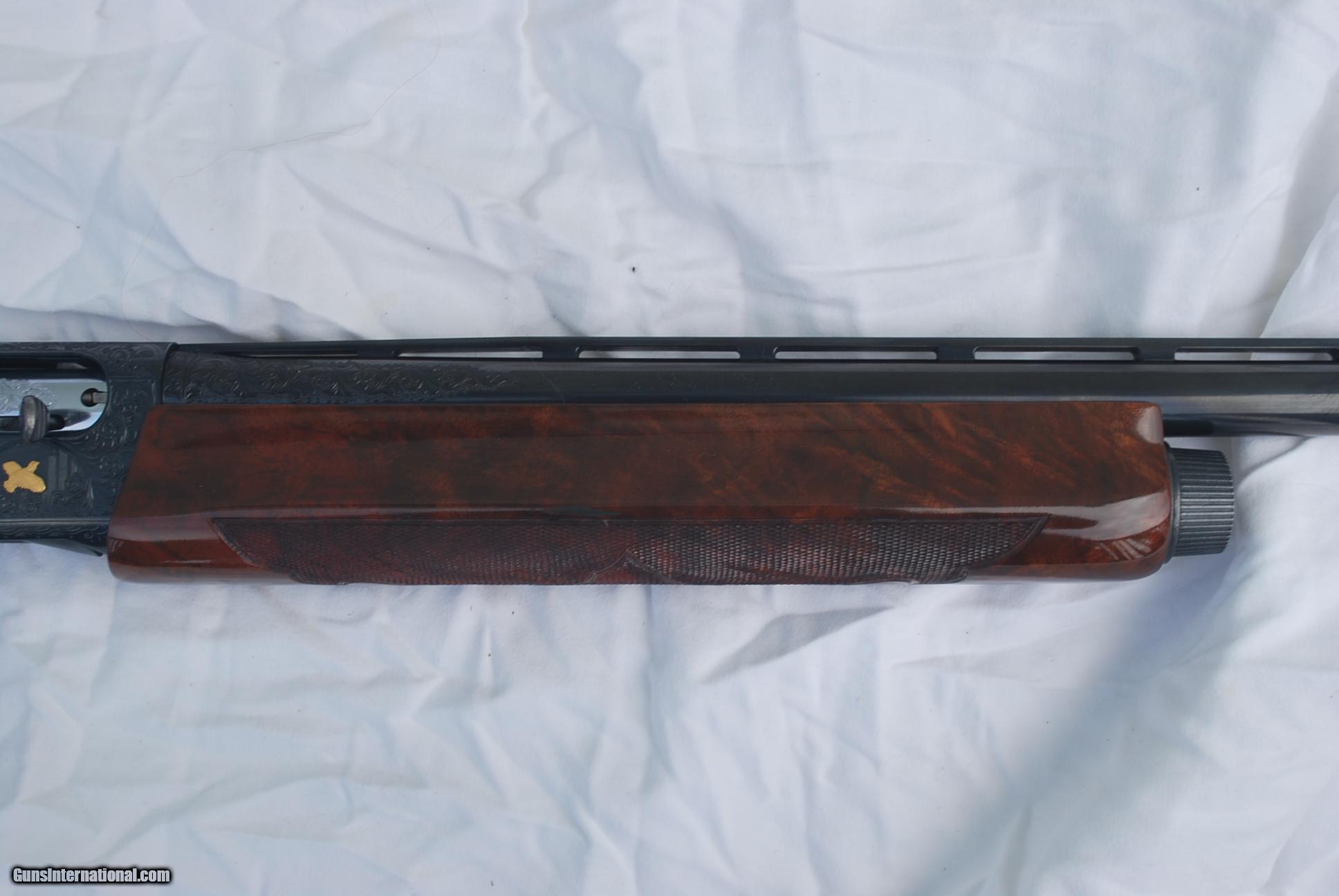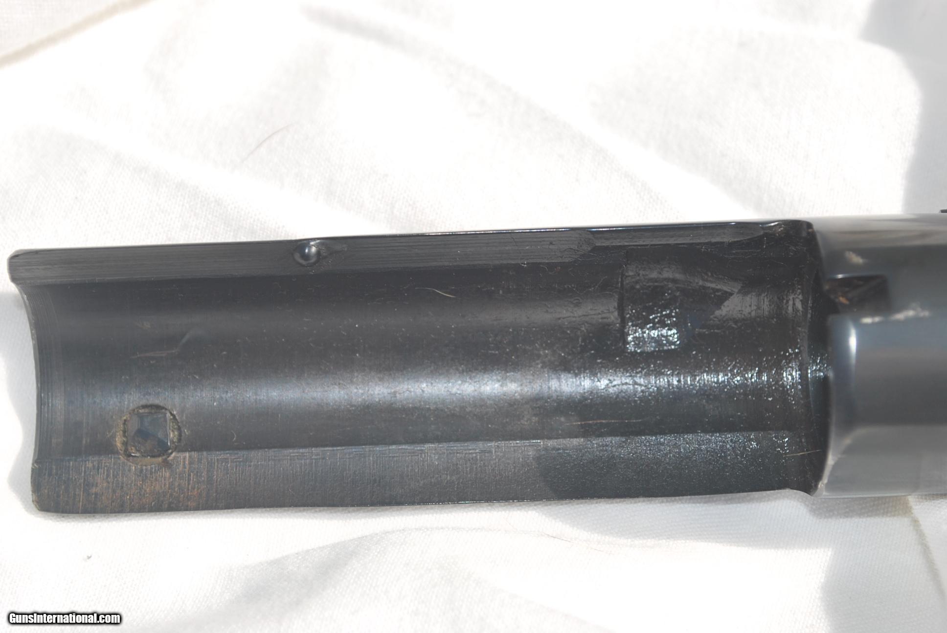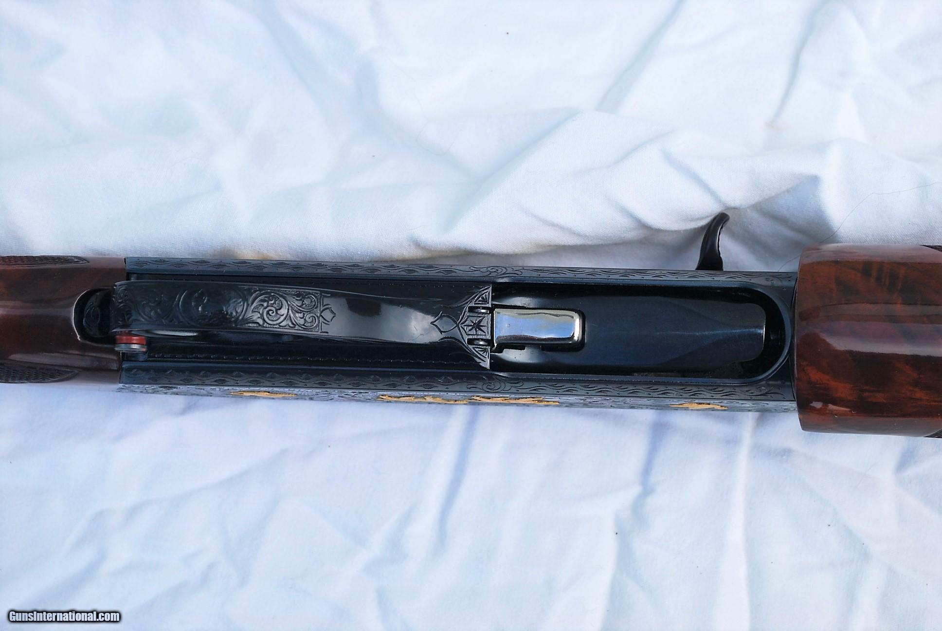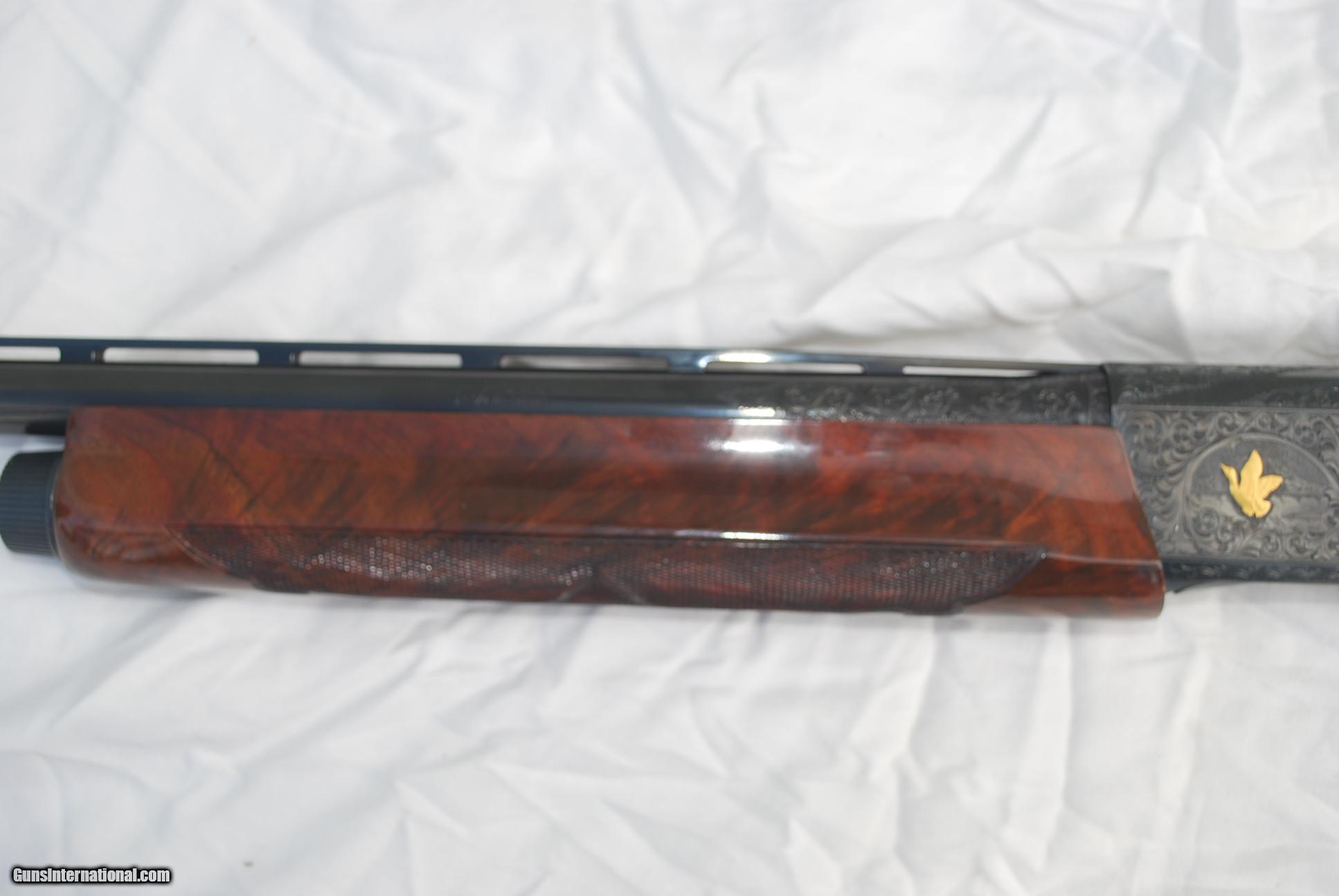 Description: Remington F Grade Gold Premier Model 1100 12ga—Factory Custom Shop 3 barrel set. ---circa 1980 ---Original Condition ------ Has not been refinished or re-blued----- Receiver engraved by Remington factory engraver Leo Walter Bala and is marked “ L W B 80 “ on the left side of the receiver. The receiver adorns 9 exquisitely done gold inlays of dogs and game.------ This shotgun left the factory Custom Shop as a 3- barrel set. The first barrel is a 12 ga 30” vent rib, fixed Full choke. The second is a 25” 12ga vent rib, fixed Skeet choke. The third is a 28”12ga vent rib, fixed Mod choke.------- All three barrels have F-grade engraving on the chamber section of the barrel. All 3 barrel bore are bright and shiny with no dents or rust.------ Stocks are made from the best wood Remington had to offer , numbered to the gun with only the smallest of handling marks.------- This F-Grade 1100 has been fired and has wear on its internal surfaces, mainly the magazine tube and barrel section in the receiver. All three barrels have mirror bores with no dents, rust or scratches.-------- The receiver is in very good condition, still bright blue overall.-------- Please look at all the photos as they reflect the true condition of this exceptional piece of art.---- I will only ship to an FFL in good standing and is will to sent a copy of their FFL to a private seller.---Please confirm with your FFL--- I recommend the buyer to be present when the FFL unpacks the firearm. Instruct your FFL to not except the package if there is any signs of shipment damage. I will except USPS Money orders only----Shipping and Insurance a flat fee of $40.00 to any lower 48 states SOLD Manufacturer: Remington Model: 1100 F Grade Gold Premier Condition: 95% Metal Condition: 95% Wood Condition: 95% Bore Condition: 99% |