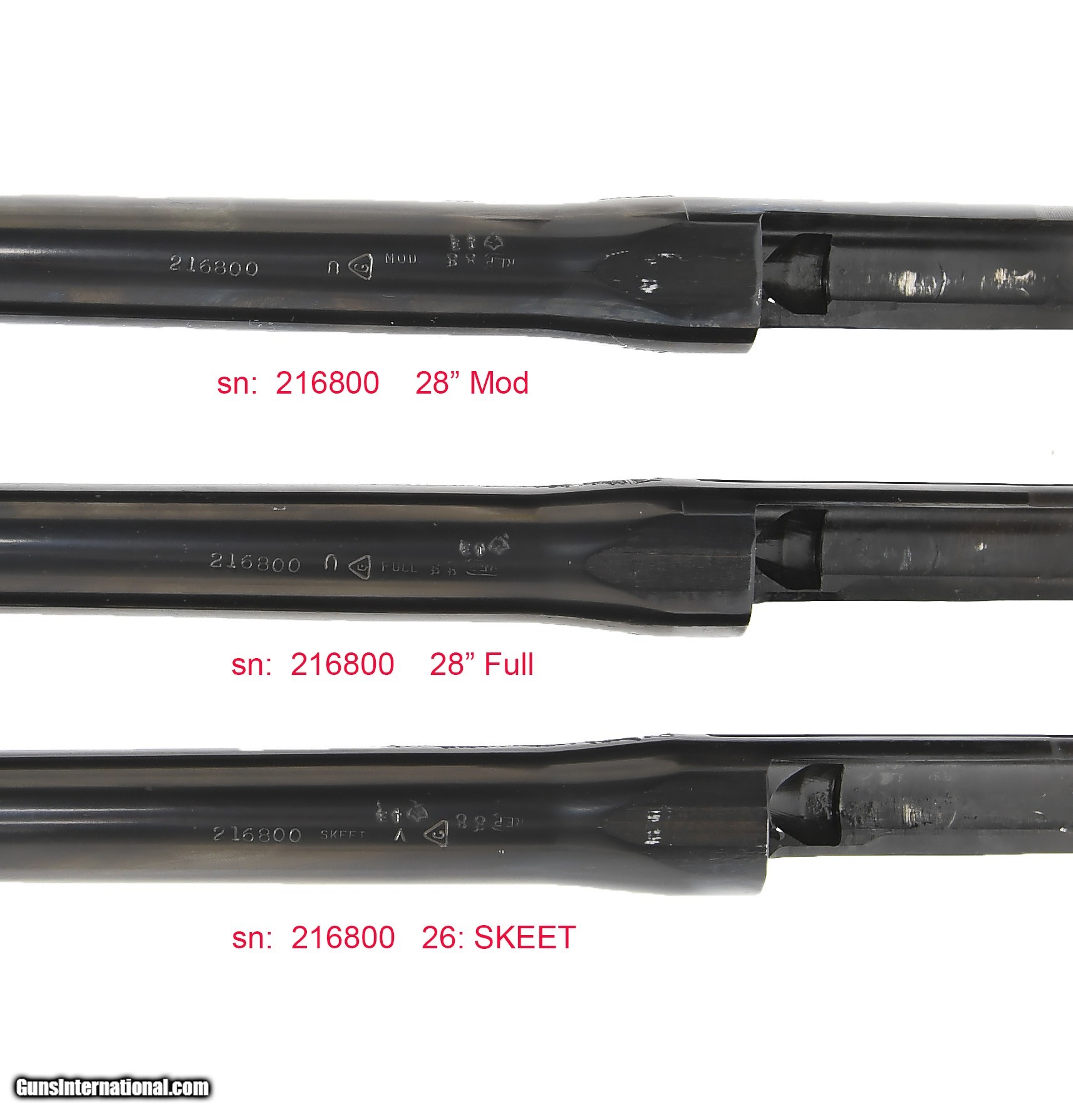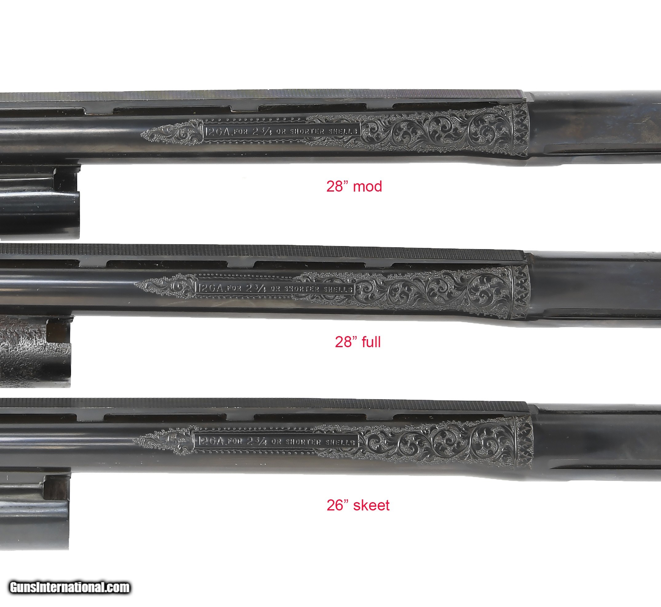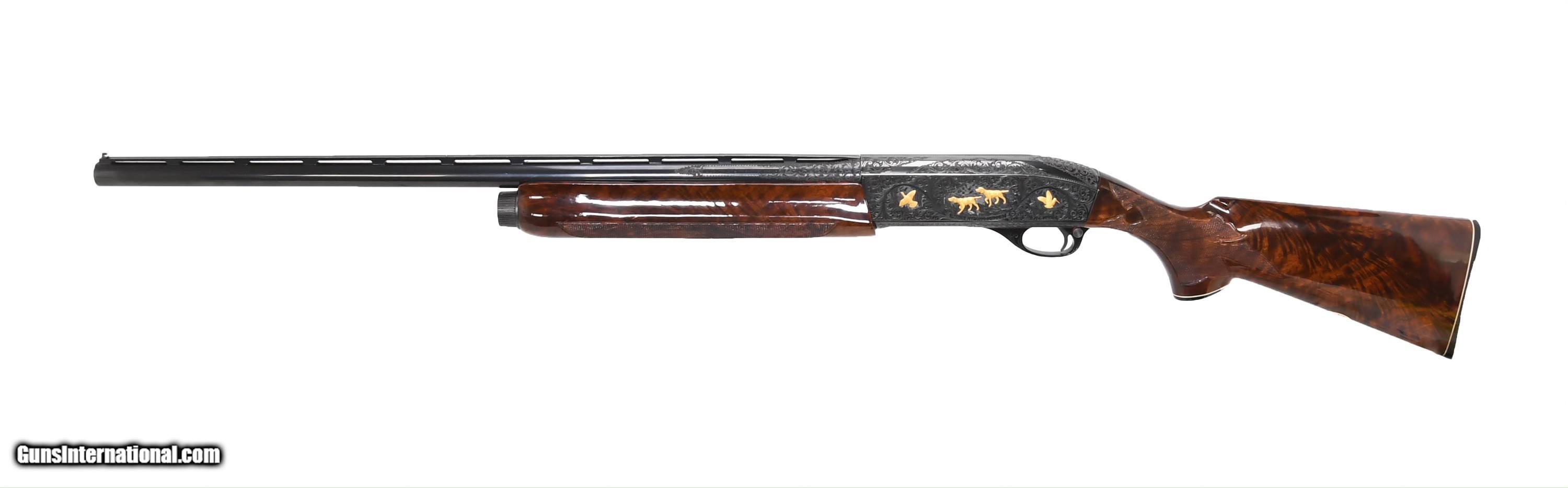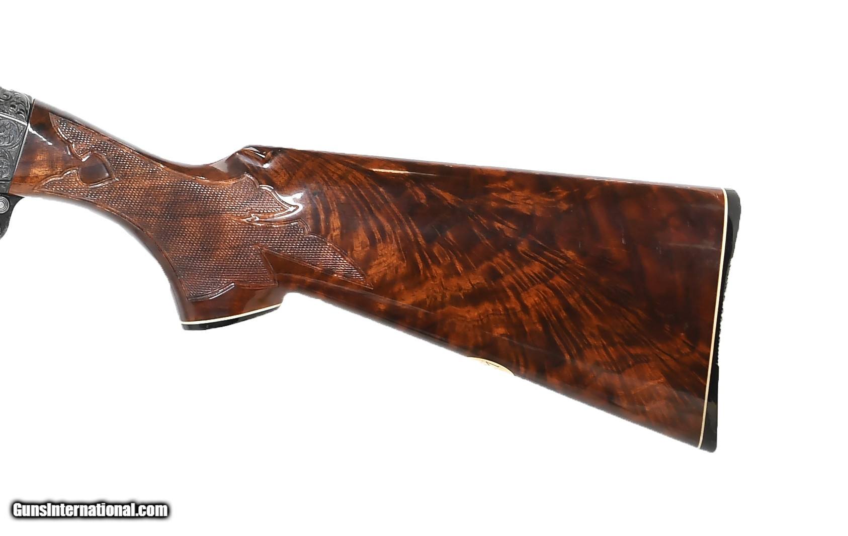 Description: Remington 1100SF, or sometimes referred to as an 1100 Premier. Strikingly beautiful 1100 in the highest cataloged grade that Remington offered with gorgeous floral and scroll engraving with four gold inlays on each, the right and left sides. On the right side are a mallard, two pointing dogs and a flushing quail. On the left side are a woodcock, two long hair dogs on point and a flushing grouse…all expertly done! This 1100SF is a 12 gauge semi auto in Skeet configuration with a 26” SKEET choked vent rib barrel. An “F” grade 1100 is quite scarce in it own right but this gun comes as a factory ordered three-barrel set! All three barrels are “F” grade engraved and serial numbered to the gun: 26” VR SKEET, 28” VR Modified and 28” VR Full…quite unusual. The spectacular American Walnut stock has a 14 1/8” length of pull to the factory butt plate; 1 7/16” drop at comb and 2 ¼” drop at heel. There is a stock escutcheon with the initials DJM engraved on it. Elegant “F” style checkering is flawlessly executed on the stock and the matching forearm. Condition: The bolt face, the magazine tube and gas system make the gun look unfired. However, the Full choke barrel has that characteristic 1100 pitting on the hidden mag tube barrel band that shows-up after lots of use! Was this barrel used on another gun? The rest of the metal is 99%, even the loading gate is nearly perfect! The stock shows some light handling scratches on the left side and the right side has several minor scratches and “dings” with one fairly significant mark about ¼” diameter, an inch from the toe. All-in-all this is a very desirable 1100SF for the Remington collector and shooter. $9,500.00 SN: L216800V SOLD |