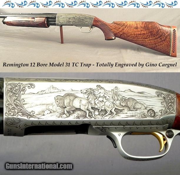 REMINGTON 12 MOD 31 TC TRAP- TOTALLY ENGRAVED by GINO CARGNEL- AMERICAN INDIAN SCENES, BISON & a LOT OF FLORAL BORDER- EXC. WOOD
