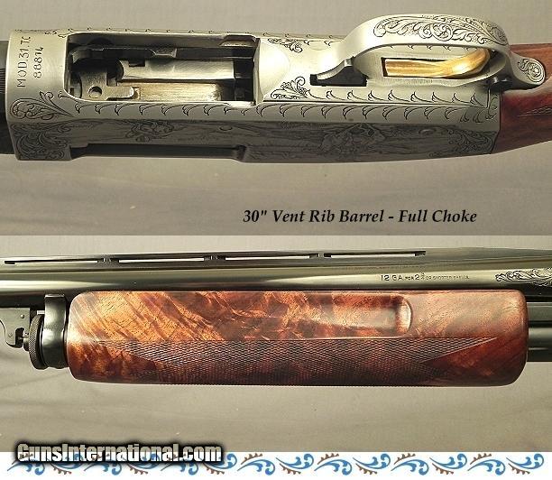 Description: #88814, Remington Model 31 TC Trap 12 Bore That is Totally Engraved by Gino Cargnel, 30" Vent Rib barrel at .732 .033" (Full), 2 3/4" chamber, Very nice wood with a lot of feather and excellent color and contrast, Checkered pistol grip stock at 14 5/8 x 1 1/2 x 1 5/8" at the Monte Carlo comb & 2 3/8" drop at the heel over a 1" Remington pad, 8 lbs. 6 oz.; Very nice engraving by the Master Gino Cargnel and signed with near full coverage of American Indian scenes, Bison and a lot of floral border work, It is also engraved at the muzzle and the barrel breech, The blue remains at 99%, The receiver and trigger guard finish remains at 99%, The stock and forend are at 99%, The checkering is at 100%, The bore is as new. /////////////////////////////////////// Mr. Gino Cargnel engraved for FN/Browning Arms in Belgium from 1951 to 1977 and then practiced his art here in the U.S. Both Angelo Bee and Gino Cargnel were contemporaries under Felix Funken. Angelo had a lot of influence in bringing Gino to the U.S. in 1978 because of the opportunity for engraving work here. Gino became an apprentice engraver at the age of 15 learning from some of the master's at FN. In the evening he attended the Belgium Royal Academy of Fine Arts and graduated top of his class in design. He became one of the best engravers at FN/Browning. //////////////////////////////////////////////// If you like your hunting shotgun, you can keep your hunting shotgun. We will keep this Promise to the American people. SOLD |