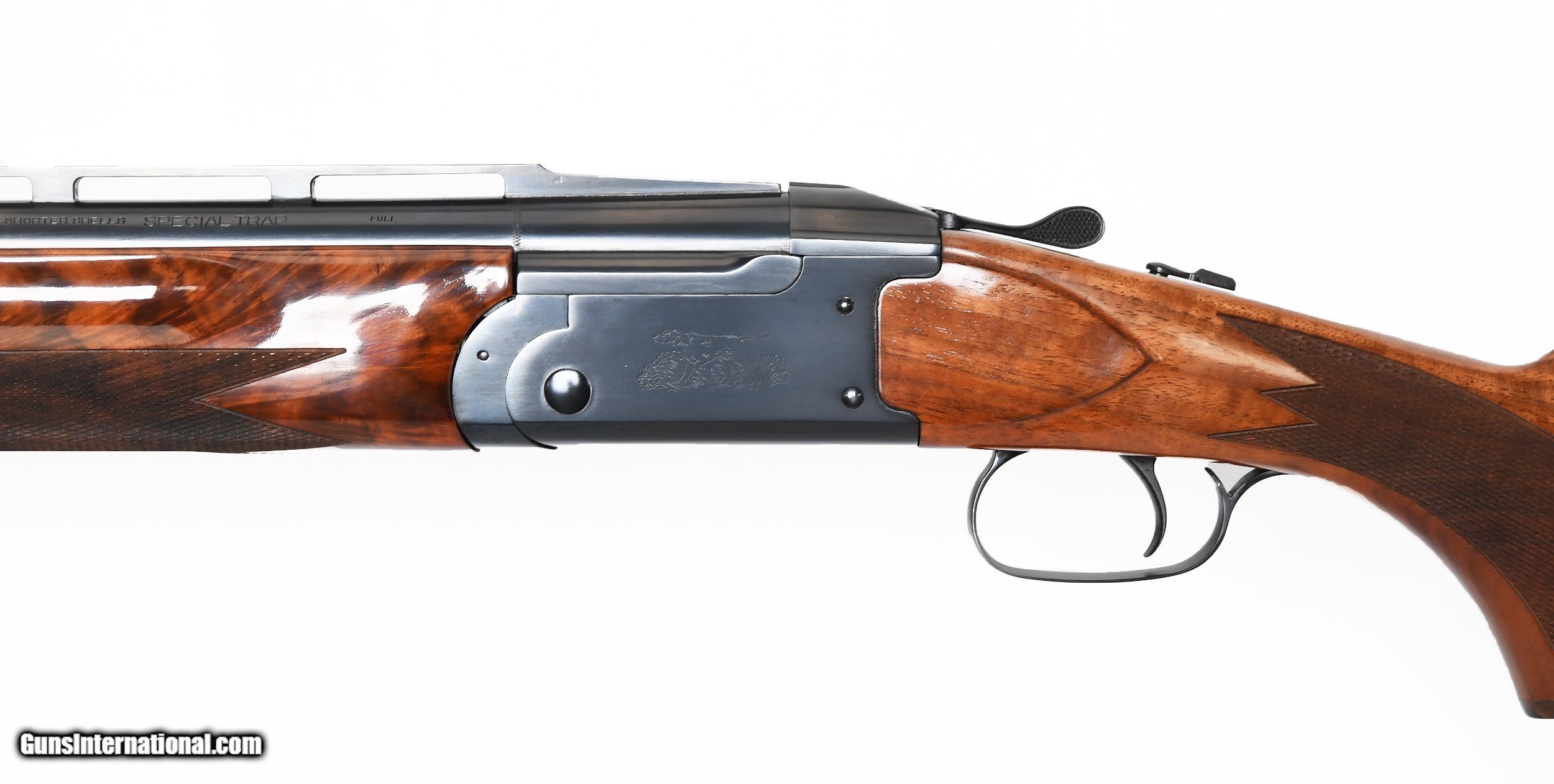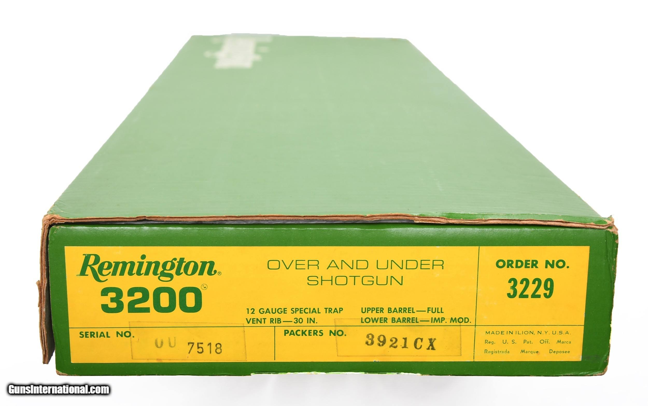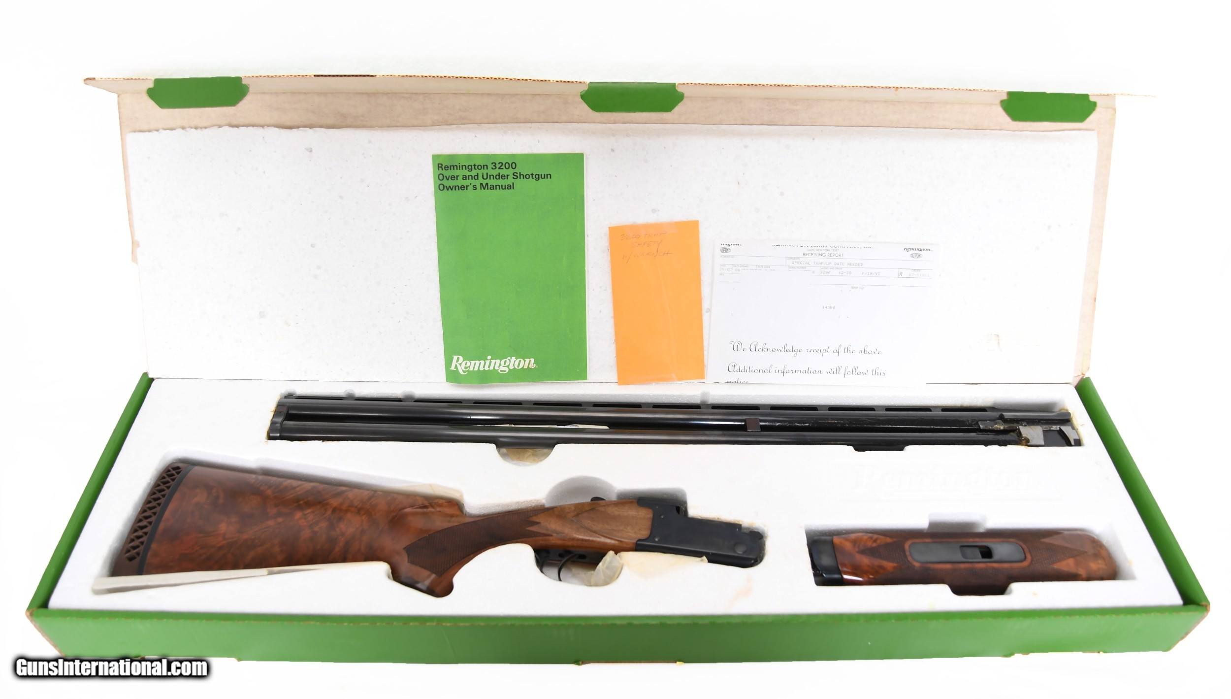 Description: SOLD Remington 3200 Special Trap 12-gauge O/U shotgun. Made in September of 1982 it looks like this gun has sat in its original box the entire time until it was “updated” in June of 1987, then put back in its box until now! What I am inferring is that this is either an NIB 3200 Special Trap or one that has been test fired only and put back in the box! 30” Vent Rib barrels have factory chokes of IM/F and measure accordingly: .028”/.040” with factory .730” bores. Single selective trigger. The gun even comes with Allen wrench to remove the safety button. Many 3200’s had good wood and this one has outstanding wood! Beautiful on both sides and the forearm matches perfectly. Put it in your collection and/or put it together and enjoy shooting it. $2450.00 SN: OU 7518 SOLD |