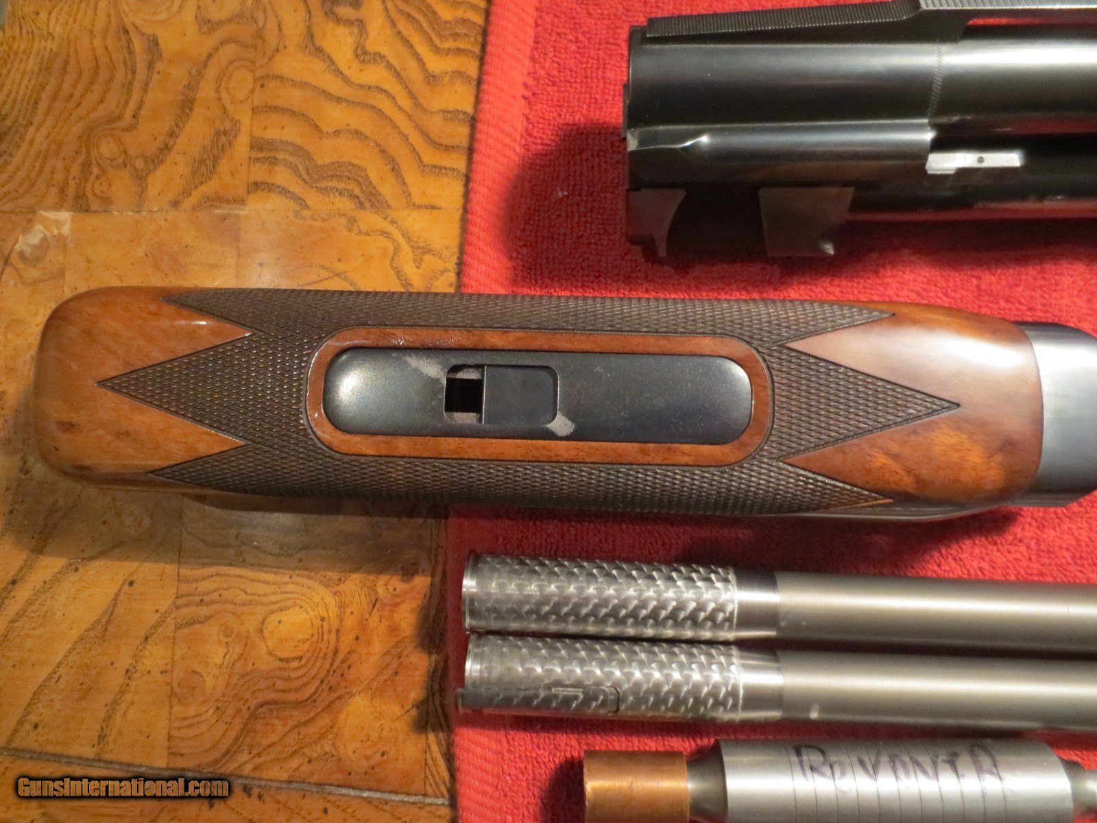 Description: For sale is a two barrel set Model 3200 Remington, 30inch and 26 inch. Double release trigger. updates are completed, Also comes with a Briley 20ga.skeet Tube set. 26 inches long. It fits in the 30 inch barrels. The 26 inch barrel is not original to the gun but was fitted. Fixed chokes at bottom-.726/.011(skt ll) Top-.733/.010(skt ll). The 30 inch barrel is bottom-.730/.028(I Mod) Top-.730/.038(full). Chambers are 2.75". Lop is 14.5". DAC is 1 3/8". Overall condition is very good at 90% with only a little bluing wear on the forend iron. Updates are in place. Monte Carlo stock. In the photos you will see a" knocker outer tool " for the tube set. I use that as a taping in and out hammer with the wood dowel. I do not have the little nylon hammer that is included when you buy these items from Briley. It works fine. SOLD Manufacturer: Remington Model: 3200 Barrel Length: 30 and 26 Chambers: 2.75 Ejectors: yes in time Condition: very good Metal Condition: very good Wood Condition: very good Bore Condition: shiny and no pitting Barrel Type: O/U Triggers: double release Stock Comb: 1 3/8 Stock Heel: 2.25 Stock Cast: neutral Fore End: beavertail Butt Pad: new kick eeze LOP: 14.5 Weight: eight pounds ten ounces Chokes: fixed Engraving: 3200 pattern Case: no Item Location: Reno Proof:Nitro: yes |