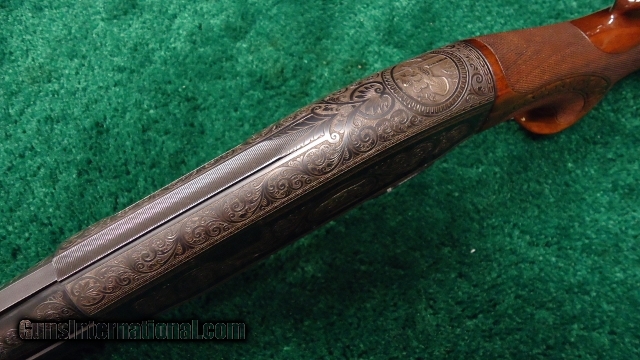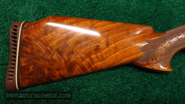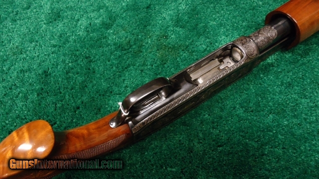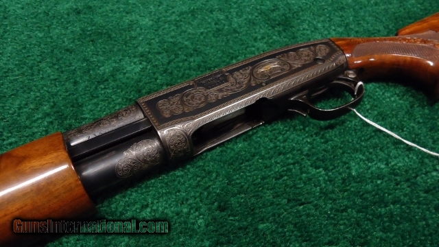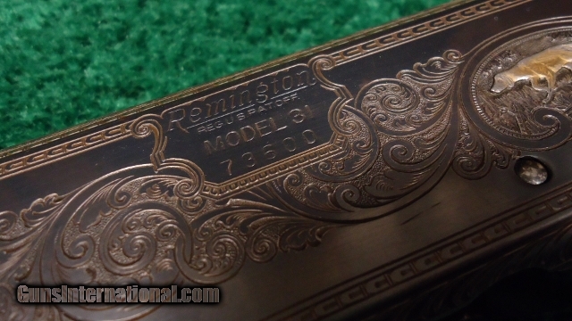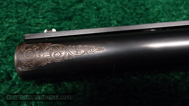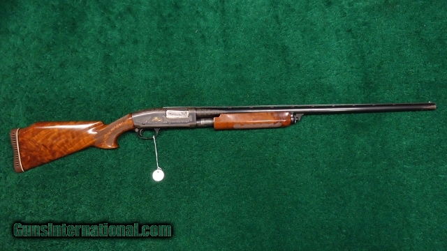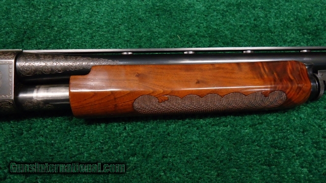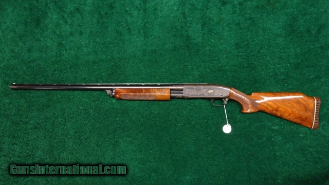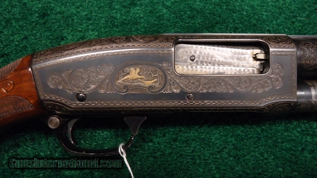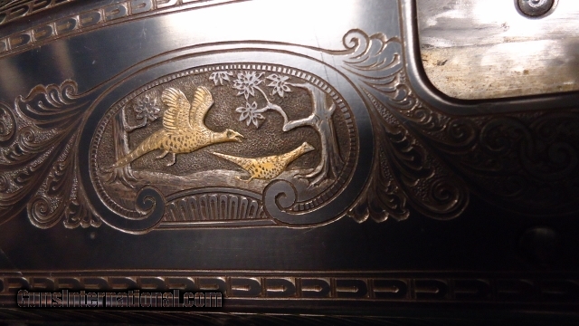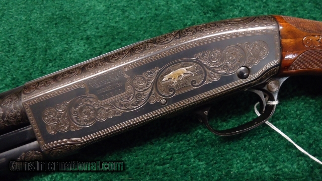 Description: ne of a kind engraved model 31 slide action in 12 ga. The engraving is magnificent with deep relief engraving of a grouse on top of the action. On the right hand side is two pheasants in gold and on the left is a hound in gold. The engraving continues on to the bbl and mag tube in a delicate scroll engraving. Muzzle even has some engraving. Wood is a gorgeous deluxe wood with heavy marbling. Monte Carlo stock, pistol grip and very fine checkering. The motif follows through on the forearm. This is a 12 ga with 30" full choke vent rib bbl. Gun is beautiful inside and out. You could really impress your buddies at the shot club with this fine shotgun! Leroy Merz Antique Firearms specializes in antique and vintage Winchesters and other fine American firearms. Since 1965 Mr. Merz has taken part in the world of firearms and has been a contributor to many well known reference books. Just recently we mailed the 124th edition of our privately-published catalog. We have hundreds of additional guns in every price range at our home online. Search for Merz Antiques in google. SOLD Curio/Relic: Yes |
