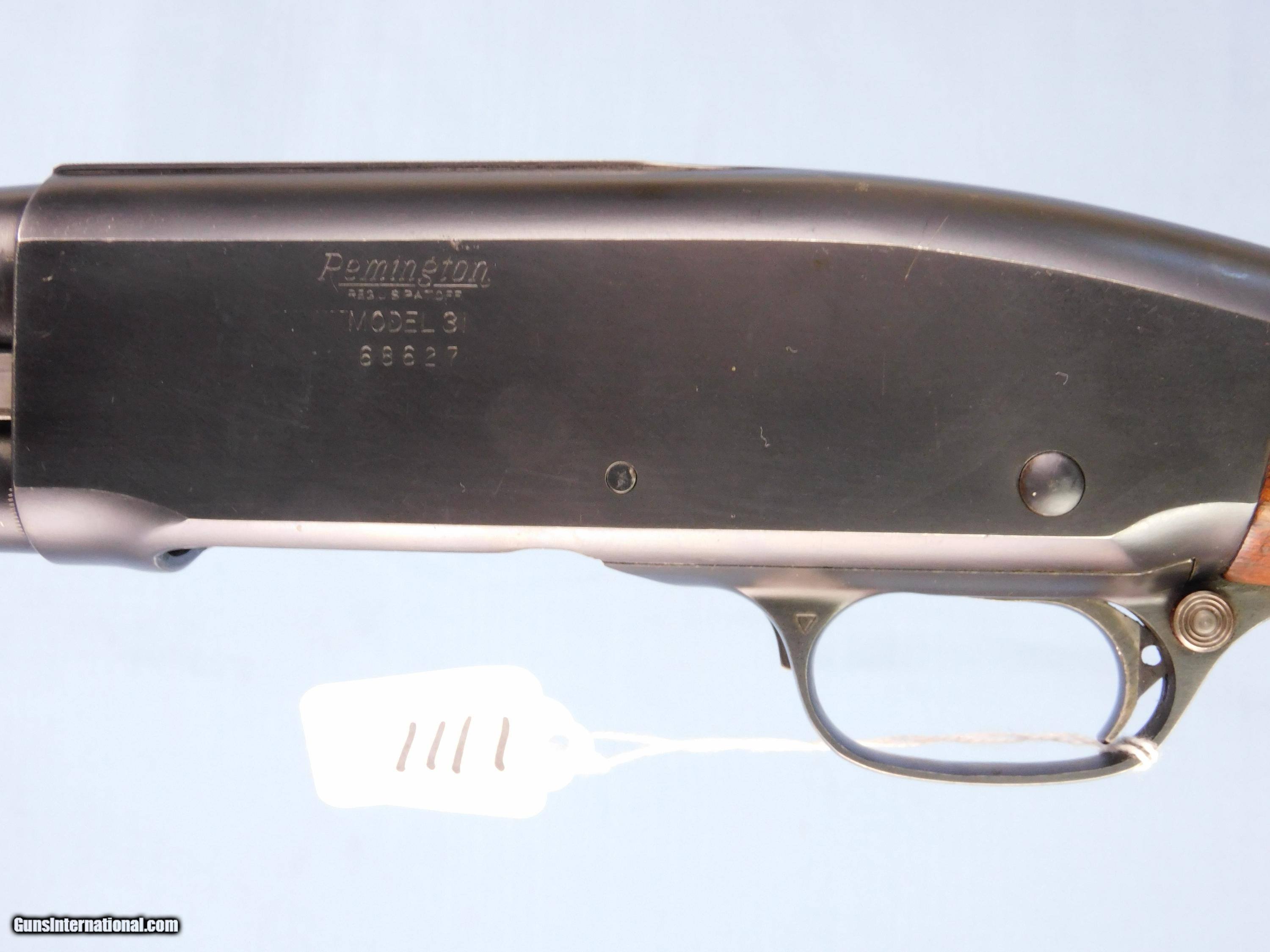 Description: #1111 REM. MODEL 31 PUMP RIFLE, 12 ga., SN 686XX, 28” Mod. bbl., steel frame, exc. wood, exc. bore, 98% blue. $350 FFL required SOLD Curio/Relic: Yes Shotgun Gauge: 12 Gauge |