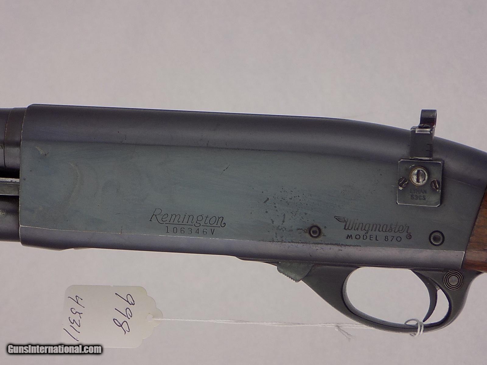 Description: #998 REM. MODEL 870 WINGMASTER, 12 ga., SN 1063XXV, 28” bbl., Mod. choke, Lyman 53CS peep sight, slip on recoil pad, 98% blue, exc. bore, VG wood. $245 FFL required SOLD Curio/Relic: Yes Shotgun Gauge: 12 Gauge |