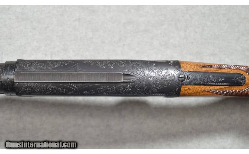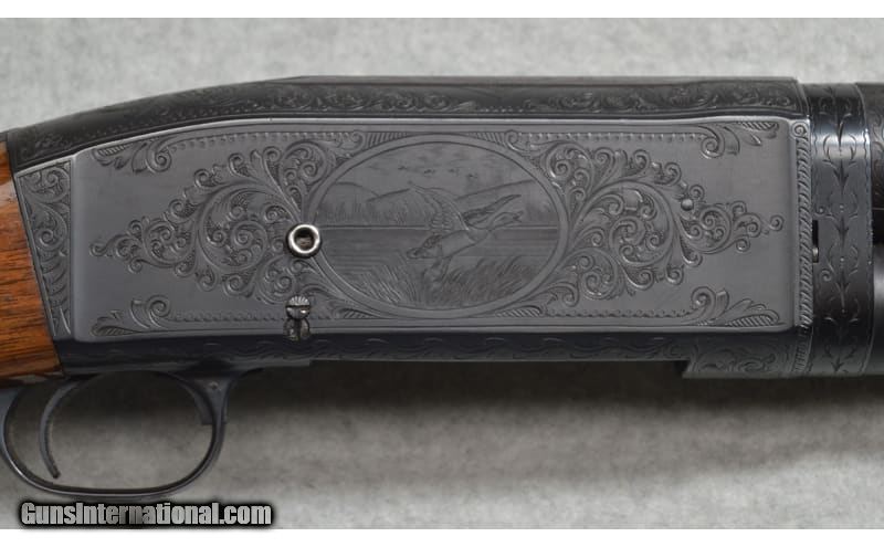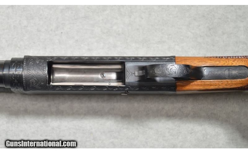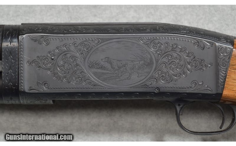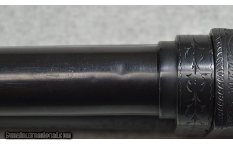 Description: Remington Model 10 shotgun with E-Grade engravings in excellent condition. This Remington was professionally refinished and features beautiful scroll-work and game portraits on the receiver and parts of the barrel. Minor handling marks and wear on the barrel and the rib. SN: U132246 12 Gauge SOLD Chambers: 2 3/4 Metal Condition: Excellent Wood Condition: Excellent Bore Condition: Clean Barrels: 30 Triggers: Two Bead Sight Stock Dimensions: 14 1/4" LOP Butt Pad: Replacement Stock Weight: 7 lb 15 Oz Chokes: Marked "FULL" Measures as MOD Item Location: Fort Worth, TX |
