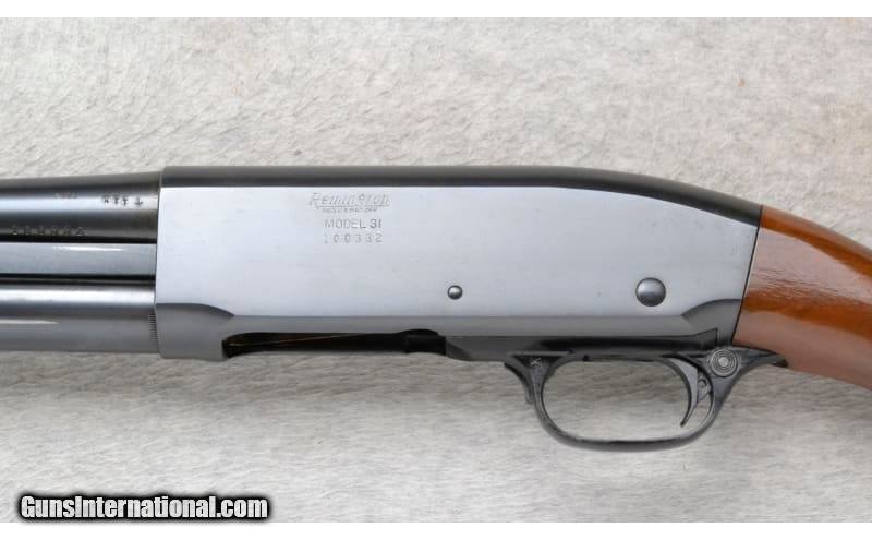 Description: This Remington Model 31 is a right hand pump action shotgun in 12 Ga. It has a 30 inch barrel. A metal bead front sight. With a 2 3/4 inch chamber it has a fixed full choke. The butt stock is a smooth grip hardwood pistol grip. The forearm is a grooved grip hardwood. S/N 100332. 12 Gauge SOLD Chambers: 2 3/4 inch. Metal Condition: Good. Receiver left side has some blemishes. Wood Condition: Very Good. A few light handling marks. Bore Condition: "Clean, bright and shiny. Barrels: 30 inch. Stock Dimensions: LOP 13 3/4 inches. Fore End: Grooved grip hardwood. Butt Pad: Remington grooved black plate. Weight: 7 lb. 4 oz. Sights: Metal front bead. Chokes: Fixed Full. Item Location: Richfield, WI |