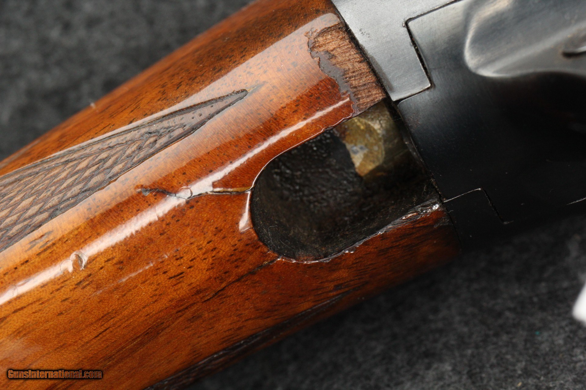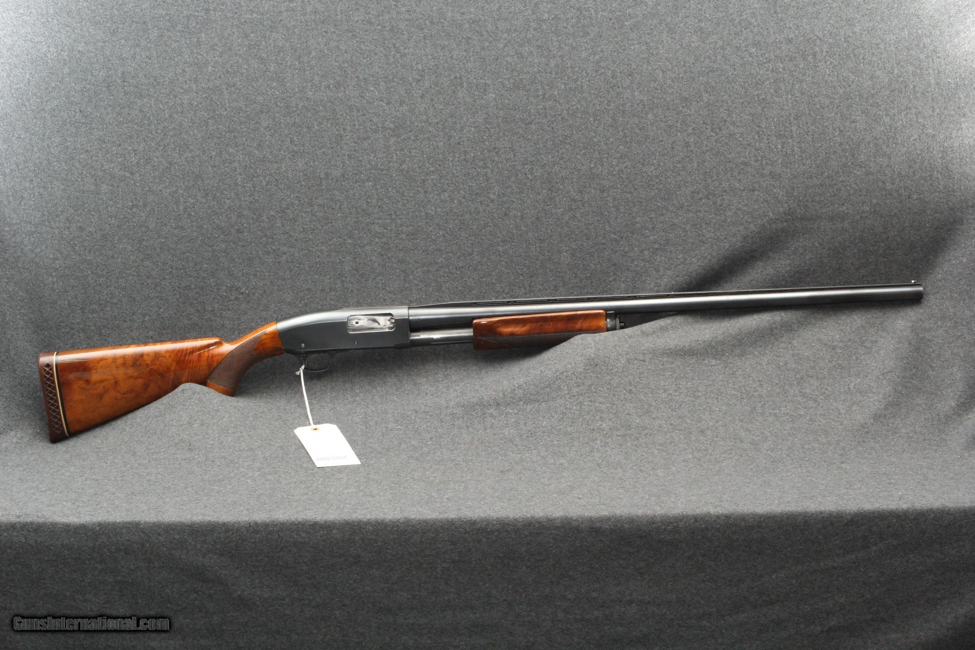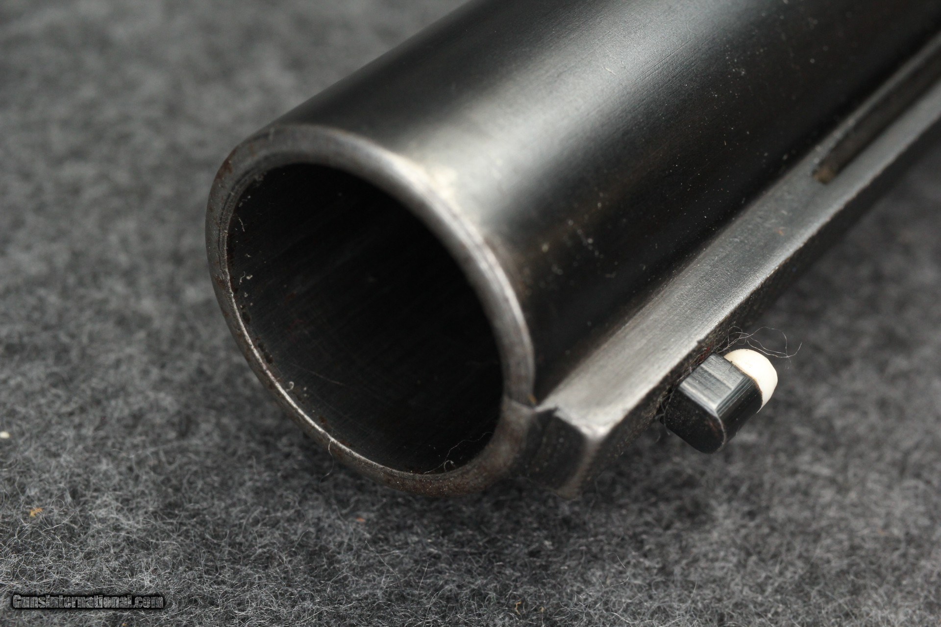 Description: Serial number 371XX. 12ga, 2 3/4" chamber, 30" VR barrel, fixed choke, open side of full. Non-original buttstock. Butt has notch for tang and this receiver does not have tang, see photos. Nicely figured walnut, flame grain. Pachmayr Whiteline recoil pad added. Correct grip cap. Chip at back of head. Crack radiating out from U-notch about 1/2". Receiver retains 95% blue, barrel retains 90%. Magazine tube shows normal wear pattern. Bore is excellent. More photos on request. Will ship to C&R. Please add $60.00 for shipping and insurance. SOLD Curio/Relic: Yes Shotgun Gauge: 12 Gauge |