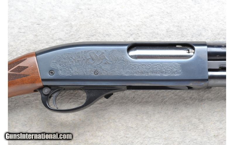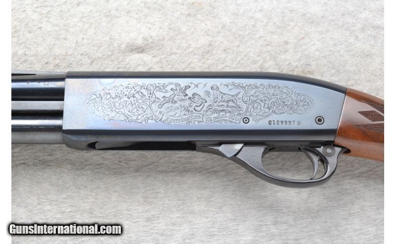 Description: This Remington Model 870 is a right hand pump action shotgun in 20 Ga. It has a 28 inch ventilated rib barrel. A white front bead and metal middle bead sight. The buttstock is a checkered grip walnut pistol grip and forearm with finger grooves. The receiver is scroll and game scene engraved. SOLD Caliber Info: 20 Ga. Chambers: 2 3/4 inch or 3 inch - Pump Action. Metal Condition: Excellent. Wood Condition: Excellent. Bore Condition: Bright and shiny. Barrels: 28 inch blued with a ventilated rib. Stock: Checkered walnut pistol grip with a black cap. Game scene engraved receiver. Stock Dimensions: LOP 13 7/8 inches. Fore End: Checkered grip walnut with finger grooves. Butt Pad: Remington brown rubber recoil pad. Weight: 6 lbs. 15 oz. Sights: White bead front. Metal middle bead. Chokes: Tube. Comes with one Skeet tube. Item Location: Richfield, WI |