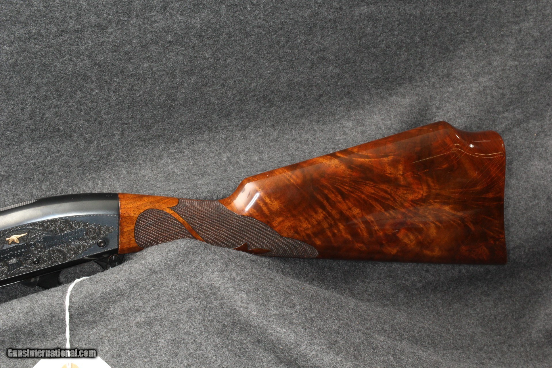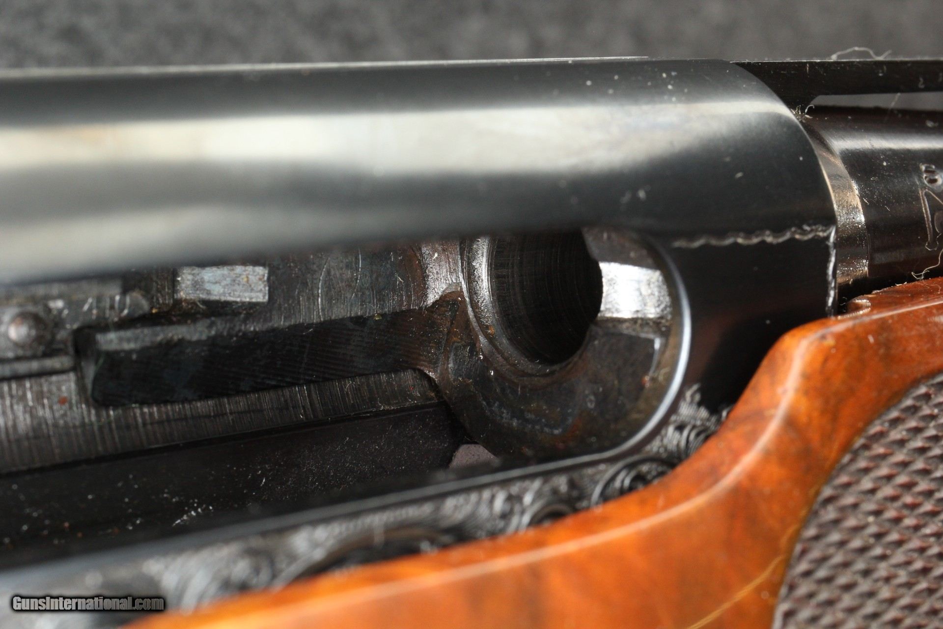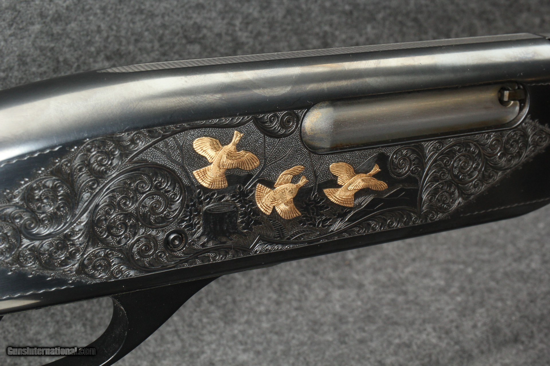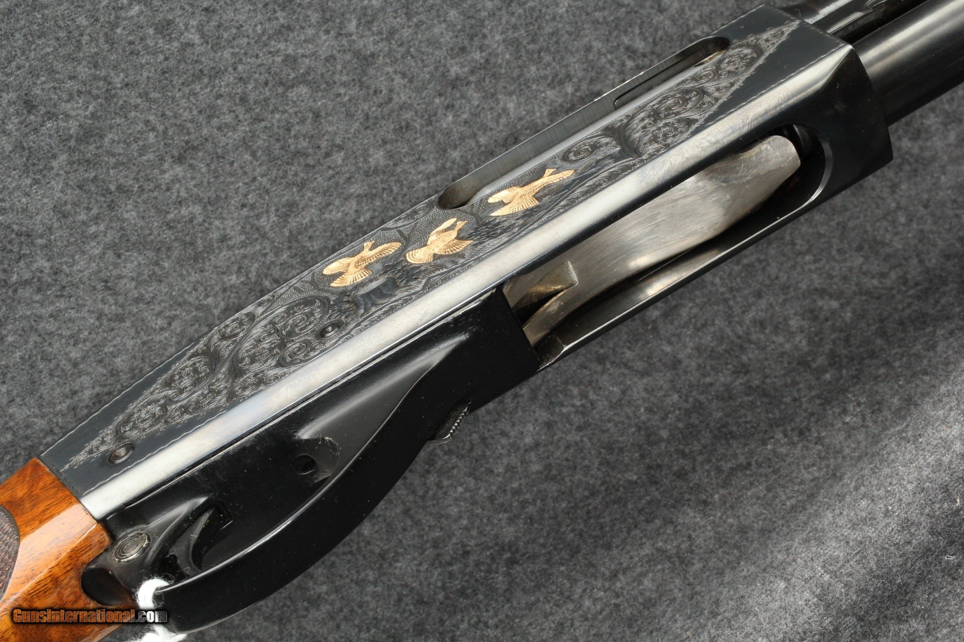 Description: 410ga, serial number S0454XXX. Beautifully embelished and gold inlaid by Walter Kolouch. Receiver features a pheasant bird scene on the left side and a grouse woods scene on the right. Each scene has three gold inlaid birds and each are surrounded by tight scroll engraving on a punchdot background with silver wire inlay. The remaining borders of the receiver feature a wavy line motif. The receiver has been mounted on a beautifully and checkered figured beavertail forearm and straight wrist high comb buttstock with checkered integral buttplate. The Kolouch's signature "WK" can be found hidden within the rock in the left bird scene. The barrel features steel middle and white front bead sights, 3 inch chamber, and skeet marked choke. Stock measurements: drop at comb 1 3/8", drop at heel 1 3/4", length of pull 13 9/16". Retains 99% plus blue and gold finishes with some handling marks and crisp engraving. Wood is very good with crazing in the finish, a few dings and scratches, a slight crack coming off the right side of the receiver, and crisp checkering. Mechanically excellent. See Rock Island May 16, 2021 lot #3404. Contact us for shipping and insurance. SOLD Shotgun Gauge: .410 Gauge |