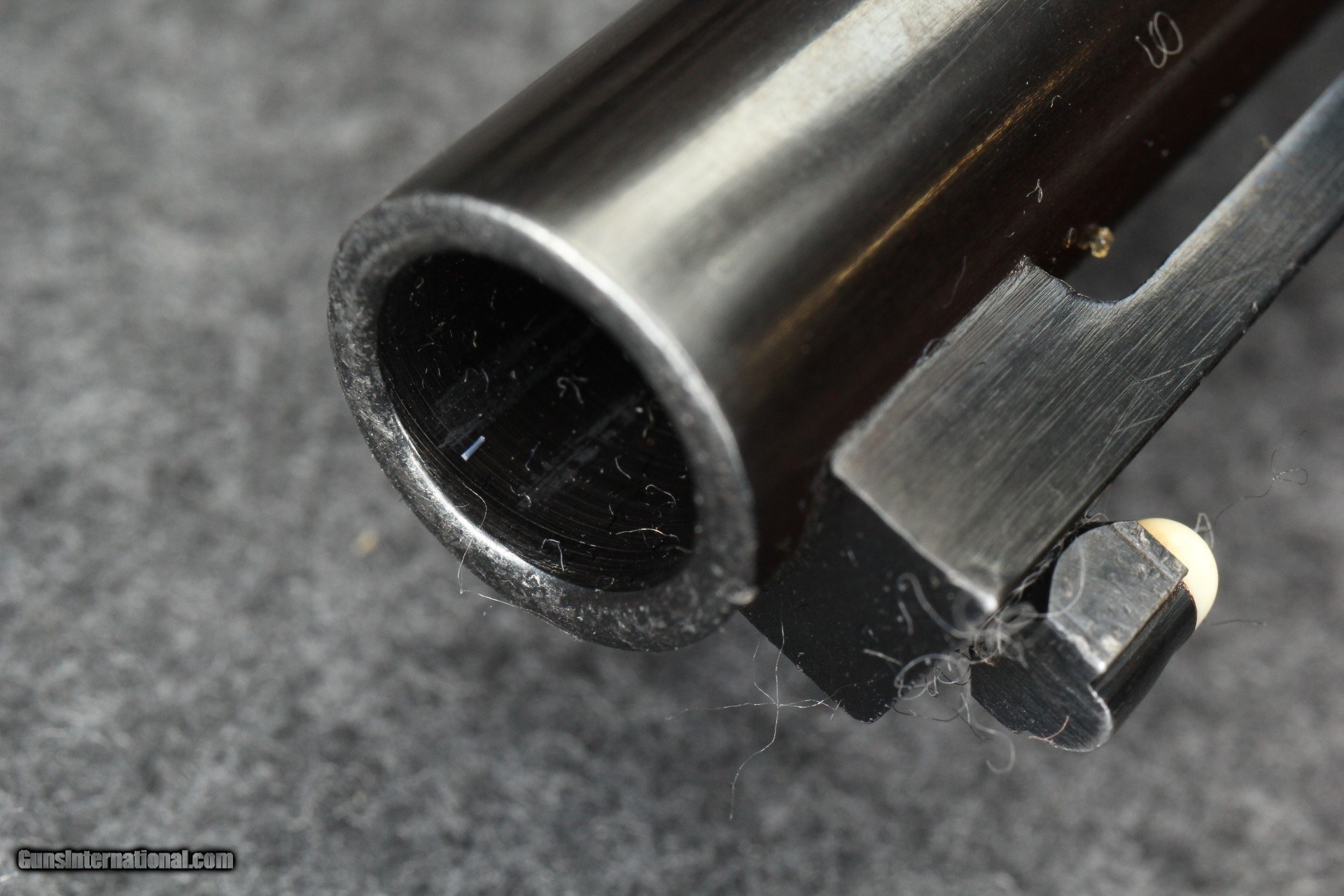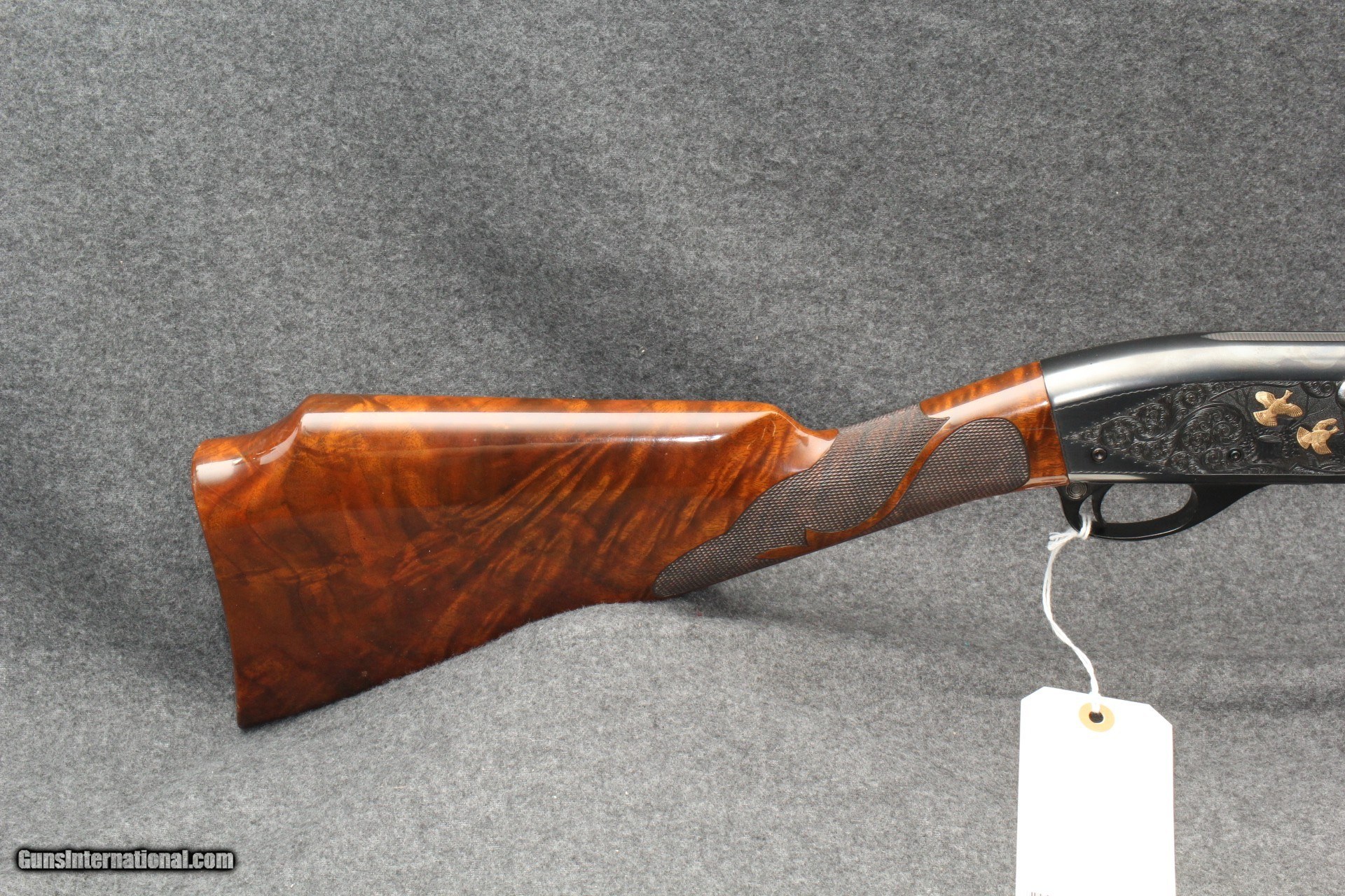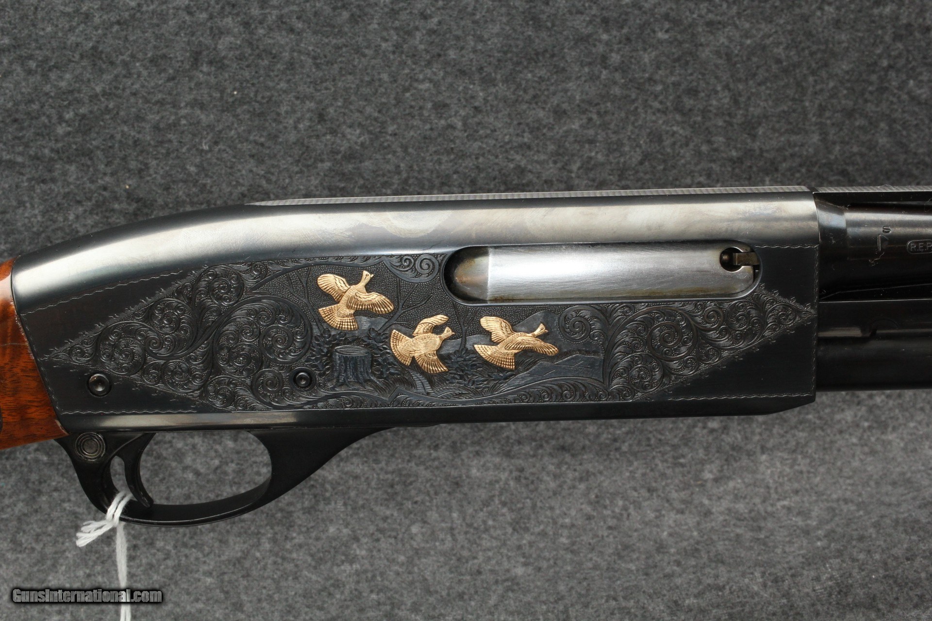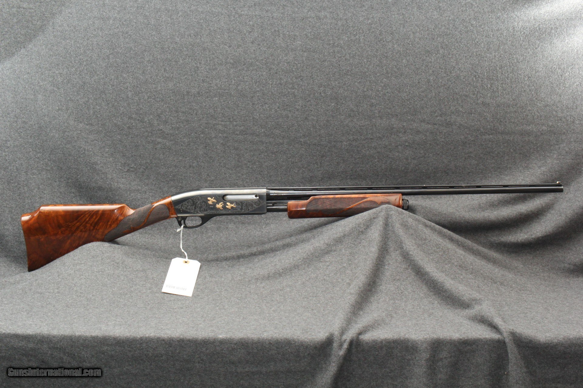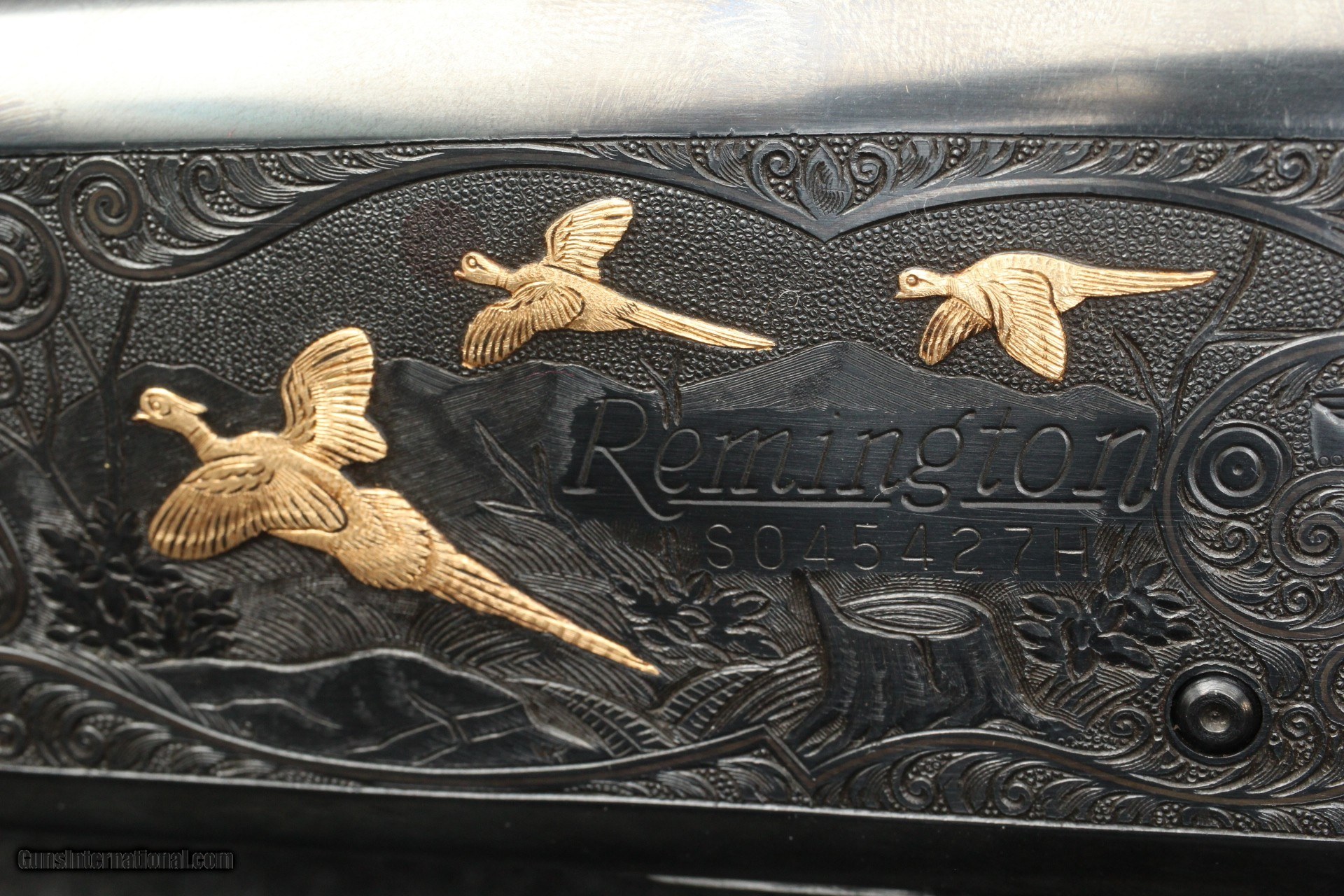 Description: 410ga, serial number S0454XXX. Beautifully embelished and gold inlaid by Walter Kolouch. Receiver features a pheasant bird scene on the left side and a grouse woods scene on the right. Each scene has three gold inlaid birds and each are surrounded by tight scroll engraving on a punchdot background with silver wire inlay. The remaining borders of the receiver feature a wavy line motif. The receiver has been mounted on a beautifully and checkered figured beavertail forearm and straight wrist high comb buttstock with checkered integral buttplate. The Kolouch's signature "WK" can be found hidden within the rock in the left bird scene. The barrel features steel middle and white front bead sights, 3 inch chamber, and skeet marked choke. Stock measurements: drop at comb 1 3/8", drop at heel 1 3/4", length of pull 13 9/16". Retains 99% plus blue and gold finishes with some handling marks and crisp engraving. Wood is very good with crazing in the finish, a few dings and scratches, a slight crack coming off the right side of the receiver, and crisp checkering. Mechanically excellent. See Rock Island May 16, 2021 lot #3404. Contact us for shipping and insurance. SOLD Shotgun Gauge: .410 Gauge |
