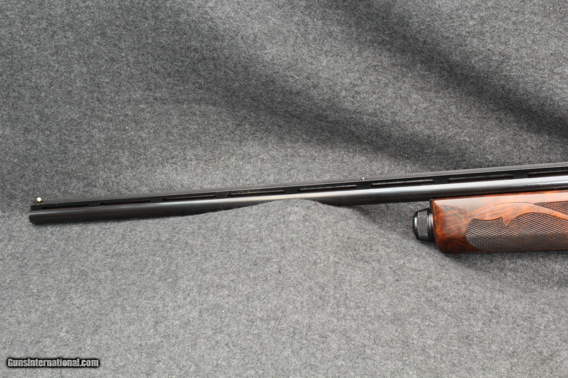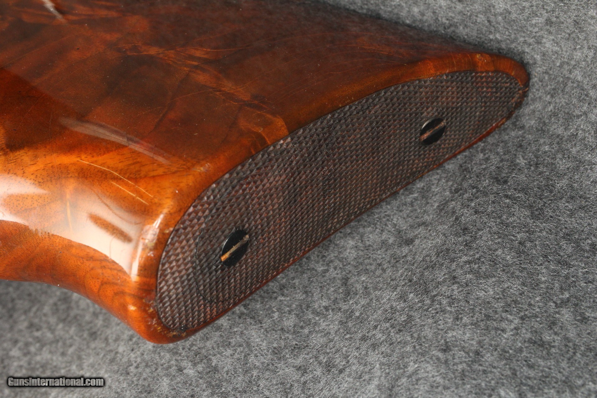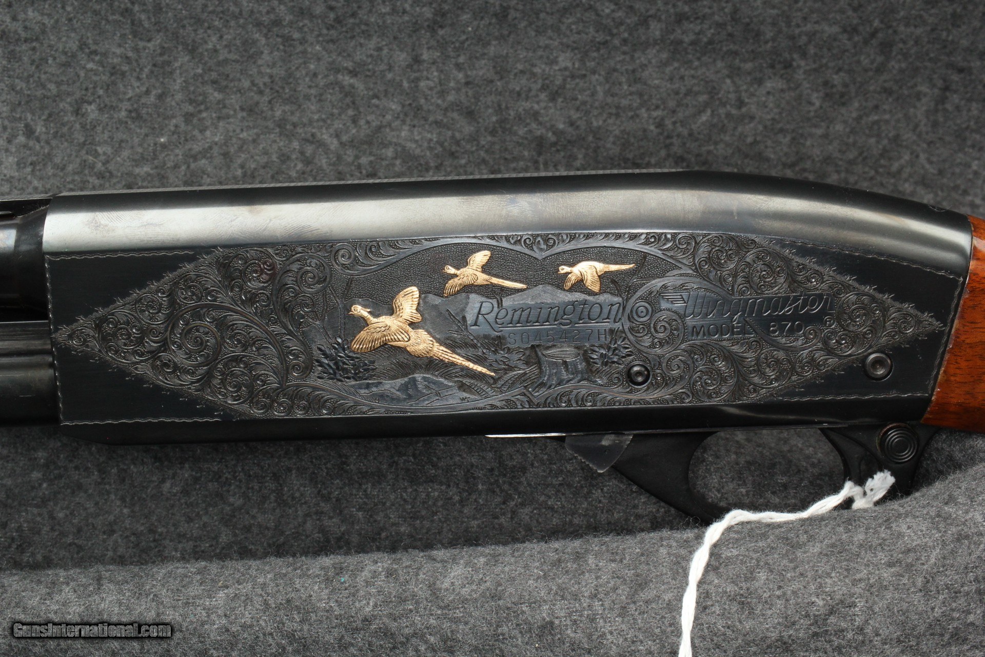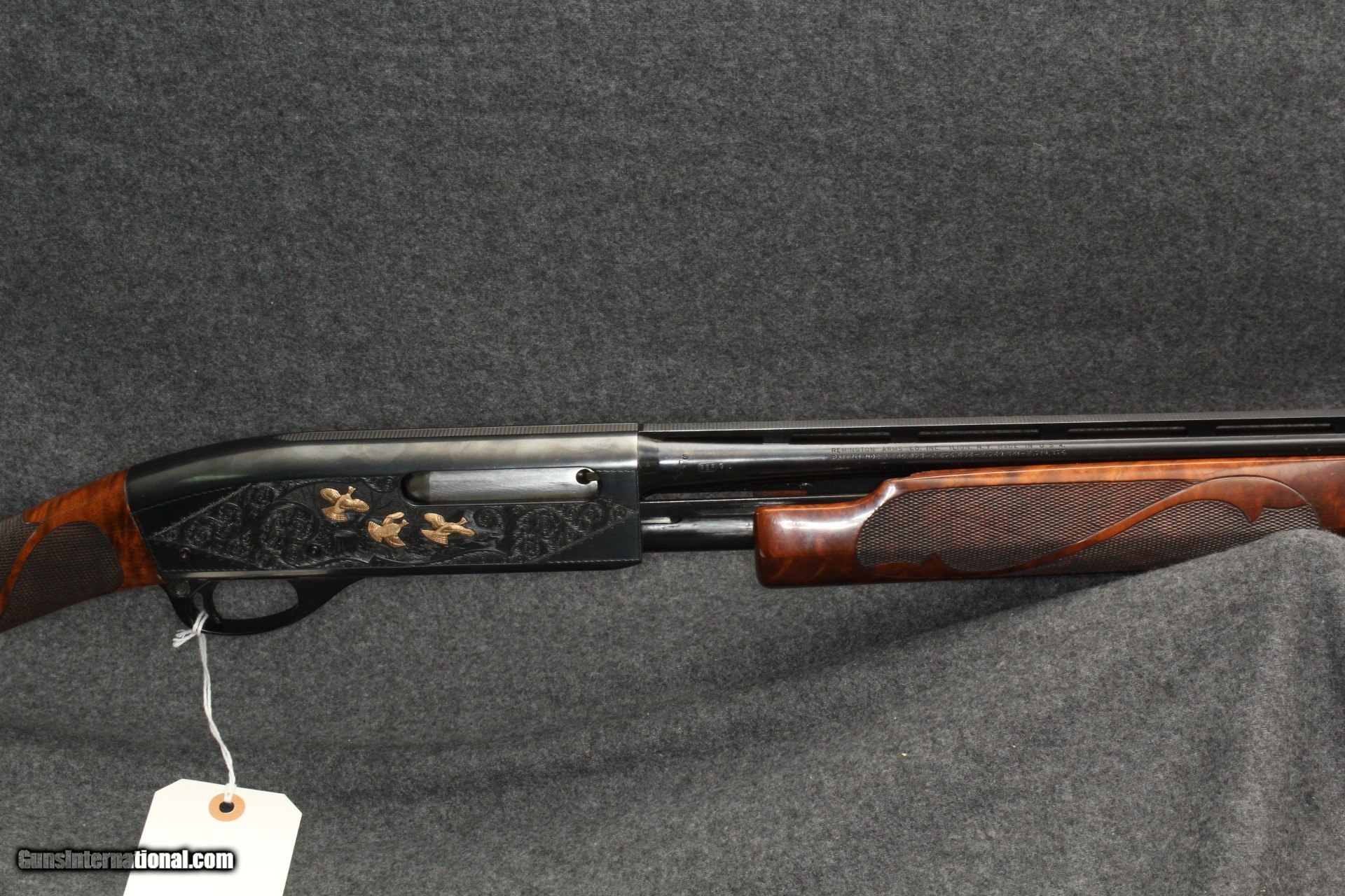 Description: 410ga, serial number S0454XXX. Beautifully embelished and gold inlaid by Walter Kolouch. Receiver features a pheasant bird scene on the left side and a grouse woods scene on the right. Each scene has three gold inlaid birds and each are surrounded by tight scroll engraving on a punchdot background with silver wire inlay. The remaining borders of the receiver feature a wavy line motif. The receiver has been mounted on a beautifully and checkered figured beavertail forearm and straight wrist high comb buttstock with checkered integral buttplate. The Kolouch's signature "WK" can be found hidden within the rock in the left bird scene. The barrel features steel middle and white front bead sights, 3 inch chamber, and skeet marked choke. Stock measurements: drop at comb 1 3/8", drop at heel 1 3/4", length of pull 13 9/16". Retains 99% plus blue and gold finishes with some handling marks and crisp engraving. Wood is very good with crazing in the finish, a few dings and scratches, a slight crack coming off the right side of the receiver, and crisp checkering. Mechanically excellent. See Rock Island May 16, 2021 lot #3404. Contact us for shipping and insurance. SOLD Shotgun Gauge: .410 Gauge |