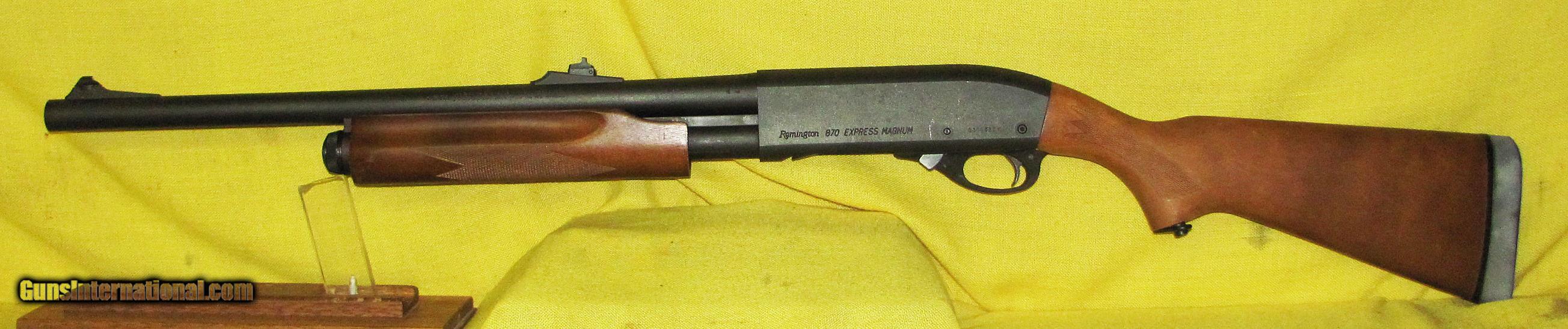 Description: REMINGTON 870 EXPRESS MAGNUM IN 12 GA CAL., WITH 20" BARREL. COLOR MATTE. CONDITION 96%+. SERIAL NUMBER B208892M. REMINGTON MODEL 870 EXPRESS MAGNUM, 2 ¾” AND 3” CHAMBER, SMOOTH BORE SLUG BARREL WITH MIRROR BORE AND RIFLE SIGHTS, WOOD EXCELLENT, 96%+ FACTORY FINISH. OUR NEW STOCK # D33136. OUR OLD STOCK # YA11355 SOLD |