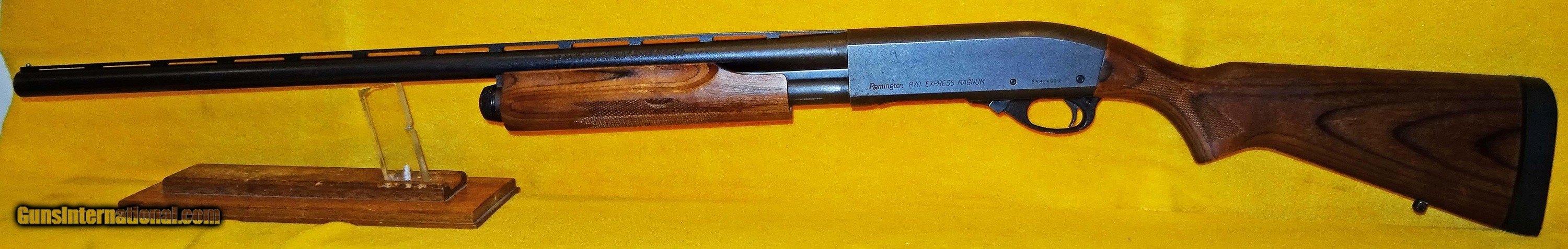 Description: REMINGTON 870 EXPRESS MAGNUM IN 12 GA CAL., WITH 28" BARREL. COLOR PARKERIZED. CONDITION 94%. SERIAL NUMBER B582652M. REMINGTON MODEL 870 EXPRESS MAGNUM, 2 ¾ AND 3 INCH CHAMBER, COMES WITH A SINGLE BEAD VENT RIB MIRROR BARREL WITH A SCREW IN MODIFIED CHOKE, WOOD IS VERY GOOD TO EXCELLENT, 14 ¼ INCH L.O.P., 94% OVERALL CONDITION, OUR STOCK # D841. SOLD |