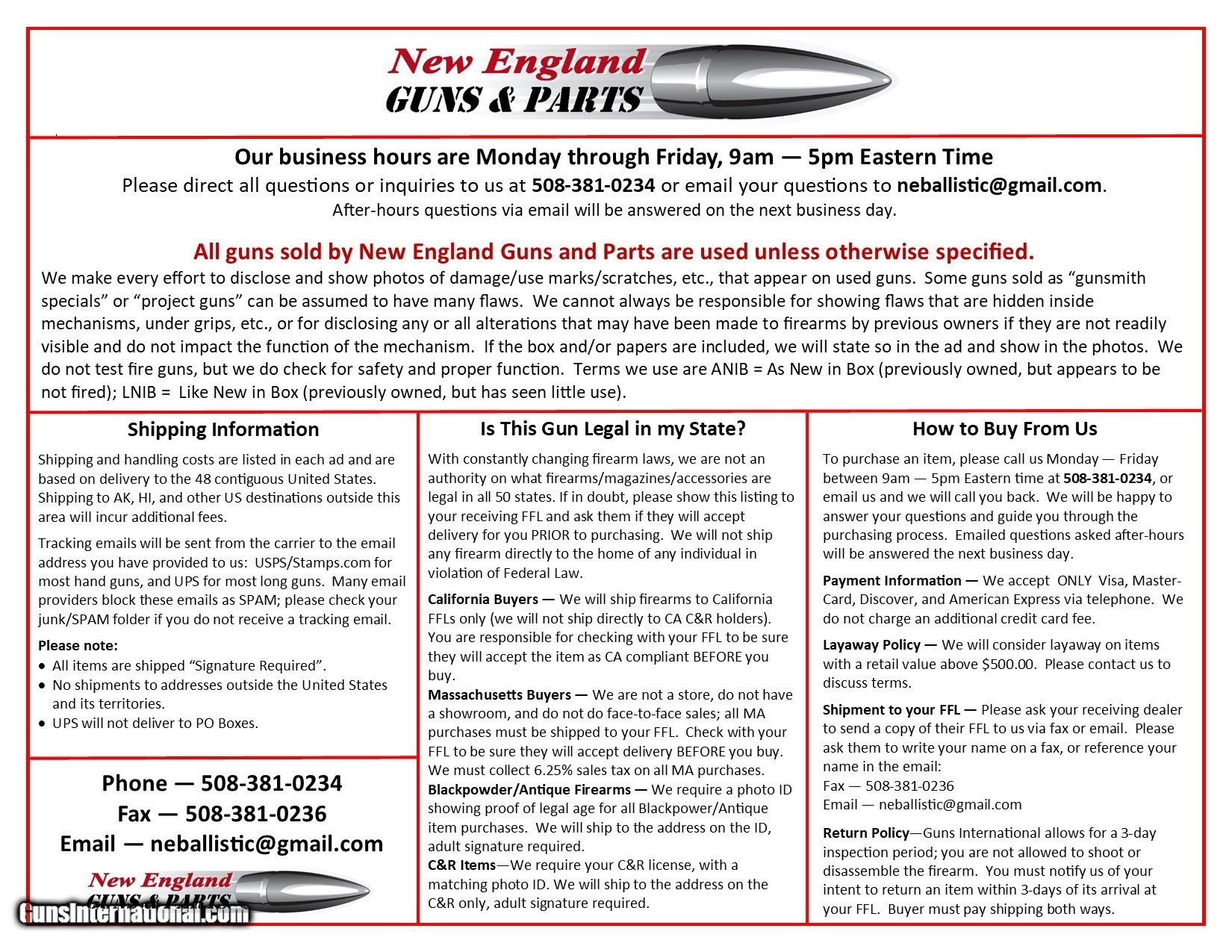 About Us: The buyer is responsible for obtaining the FFL for shipment. The buyer will insure the FFL is emailed or faxed to New England Guns and Parts in a timely manner. All of our guns are used unless otherwise stated.