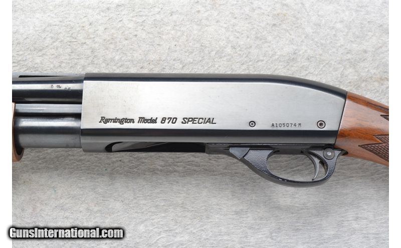 Description: This Remington Model 870 Special is a 12 Ga. pump action shotgun. It has a 21 inch barrel with a ventilated rib. A white bead front sight and a metal middle bead sight. With a 3 inch chamber it takes choke tubes and comes with one tube. The stock is a checkered grip walnut straight grip butt and forearm with finger grooves. 12 Gauge SOLD Chambers: 2 3/4 inch or 3 inch - Pump Action. Metal Condition: Very Good. Wood Condition: Very good. Barrels: 21 inch blued with ventilated rib. Stock Dimensions: LOP 14 inches. Fore End: Checkered walnut grip with finger grooves. Butt Pad: Remington brown rubber recoil pad. Sights: White bead front. Metal middle bead. Chokes: Tube. Comes with one Skeet tube. Item Location: Avon, OH |