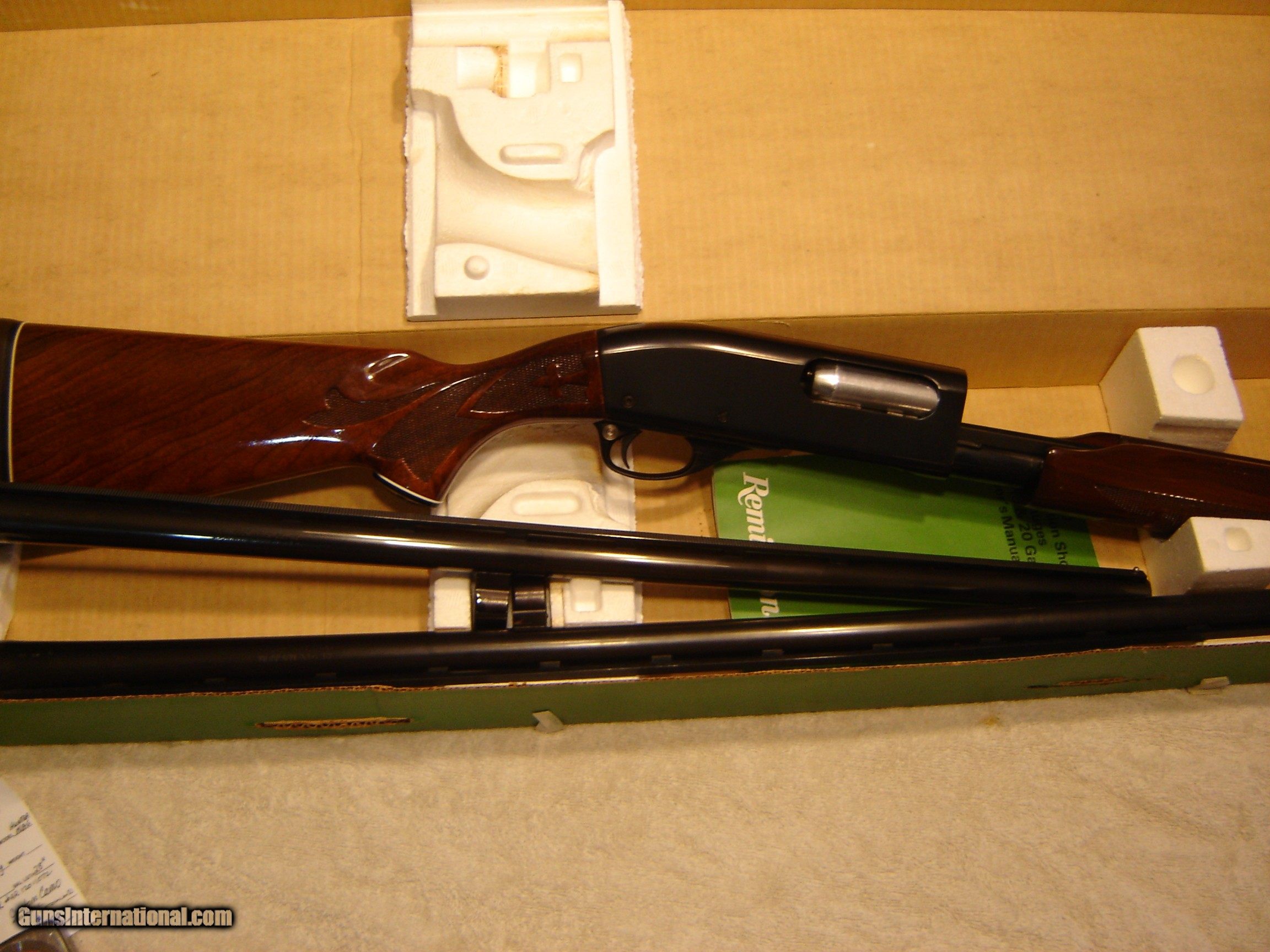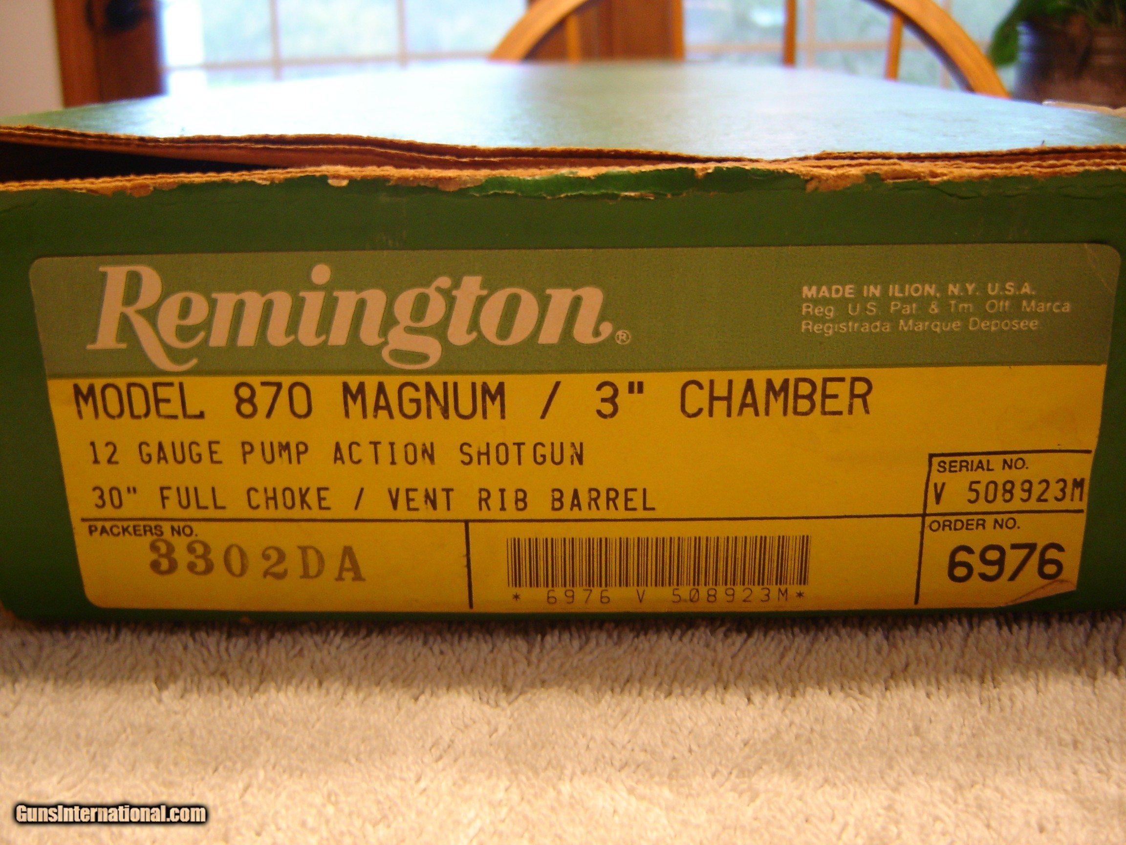 Description: Remington M-870 Wingmaster Magnum 3"- early 80's vintage ANIB. 30 " Full Vent rib barrel and extra 26" Vent improved cylinder. With all paper work, Box is very crisp. From estate. No California sales please. SOLD Manufacturer: Remington Model: 870 Wingmaster Serial Number: V5089XXM Barrel Length: 30 & 26 Condition: ANIB |