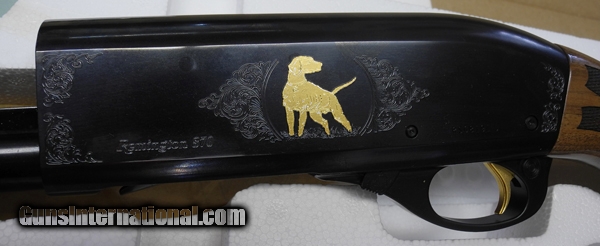Description: REMINGTON 870 WINGMASTER AMERICAN CLASSIC GOLD DOG ENGRAVING 12GA 28", NEW (82084) PUMP, FANCY AMERICAN WALNUT WITH HIGH GLOSS FINISH, GOLD ENGRAVING OF FULL SIZE LAB ON ONE SIDE, SCROLL ENGRAVING ON OTHER SIDE. 3 REMOVABLE CHOKES, IC/M/F. SOLD |