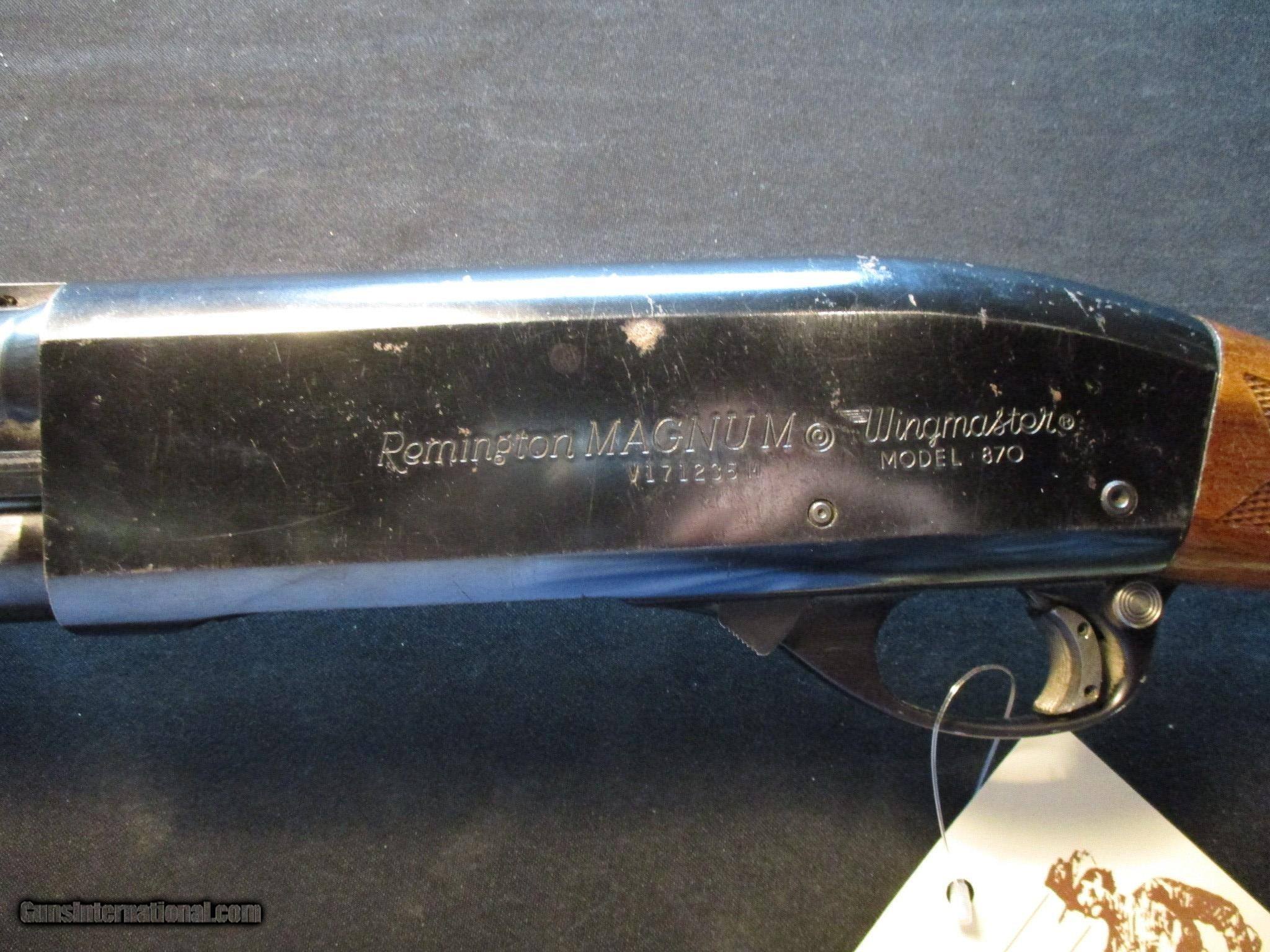 Description: Remington 870 Wingmaster Magnum, 20ga, 28" Vent Rib, 3" chamber, Fixed Mod choke. Factory finish on both wood and metal, SN is V1712xxM. Hard to find cool old classic gun! Email me if you would like these pics sent to you, they will come through bigger and better than on the listing page here. We do offer Lay-A-Way. Our standard terms are 25% down, 90 days. Initial deposit is not refundable. Email me with any questions. I am a store front dealer, and I will close s if the gun sells locally. Once it has aI will pull it from my shelves. Please check your local laws to confirm it is legal to own in your state! Buyer pays $25 shipping and insurance to your FFL in the lower 48. AK, HI or PR is extra. I will ship to California, NO PROBLEM! All my guns come with a non-firing, 3 day unconditional return privilege, from the day UPS delivers to your dealer. Buyer pays shipping both ways if the gun comes back. I can add a new hard case by PLANO for secure shipping for $25 if the buyer wishes (highly recommended, cheap insurance, really helps keep the UPS monster from eating my guns!). No sales tax on guns ship out of Kansas, guns sold in Kansas are subject to Kansas sales tax. I am a licensed FFL, and will include a copy of my FFL with the gun for your dealer’s records. I will ship to a C&R if the gun is eligible. I will ship to California, but you need to confirm the gun is legal where you are, California or other. WE BUY AND CONSIGN GUNS AND GUN COLLECTIONS! We will travel to pick up collections! I am always looking for good clean, old original Winchesters to buy, consign, or trade, especially Pre '64's model 70's and model 54's. WE ALSO TRADE FOR CLASSIC CARS AND TRUCKS! Email me with any questions, and good luck! SOLD |