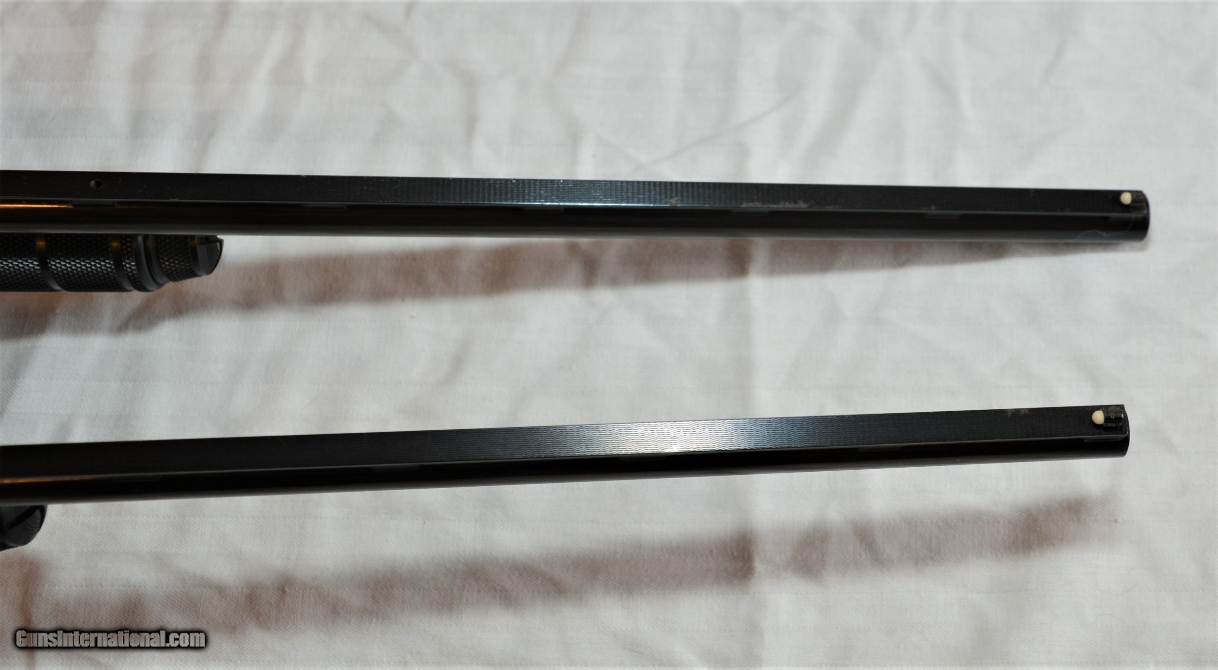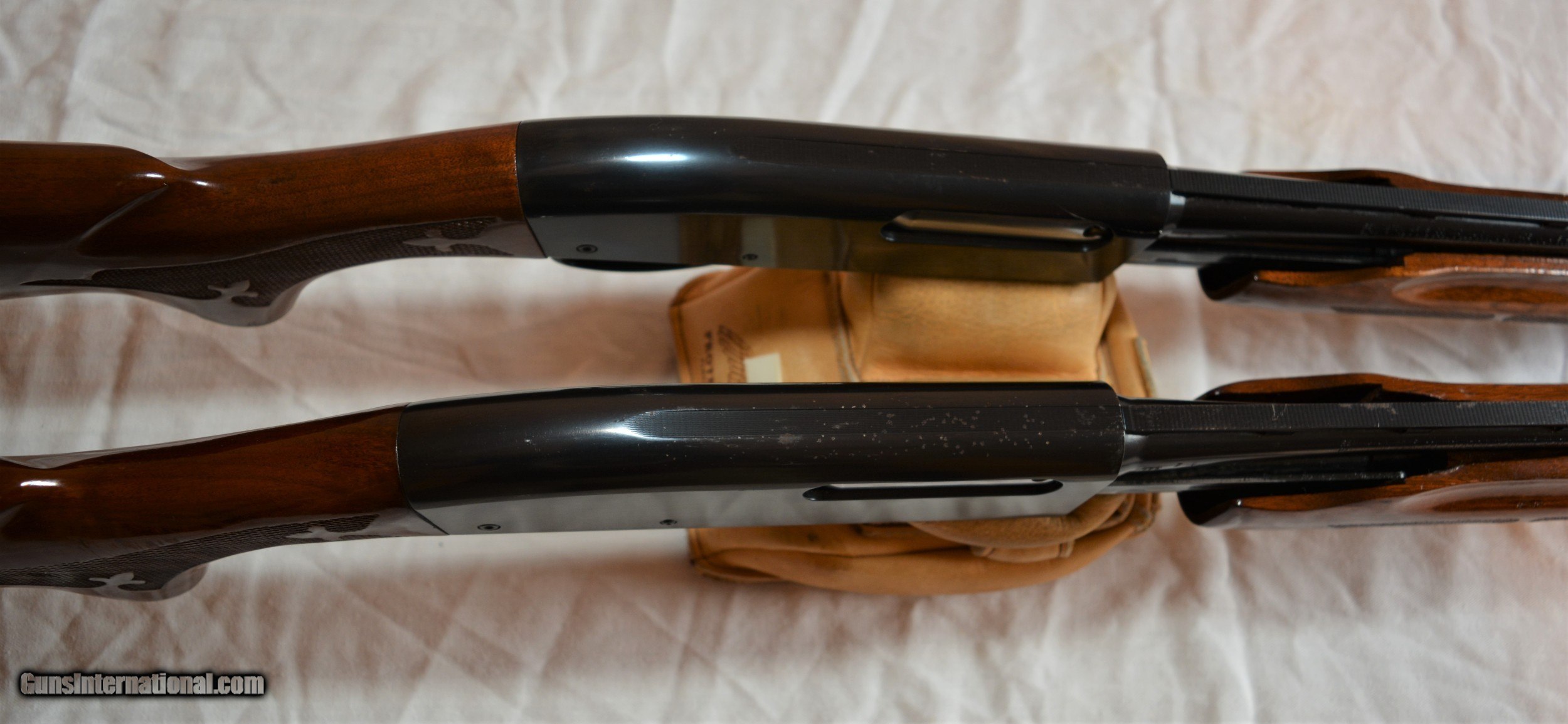 Description: Remington 870 Wingmaster Matched Pair Skeet Set #409 On behalf of a late fellow shooter and friend I am posting this Matched Pair #409 of Remington Model 870 Wingmasters in 28ga and 410 bore. Please contact Mr. Stevens at 816-835-2131 or email him at russstevens121gmail for any additional questions and to arrange payment. We are offering this somewhat scarce Remington Matched Pair Skeet set #409. These are not to be confused with the far lessor 870 express or vanilla 870 models. These are Winemasters, and as such were made to shoot competitive skeet matches with. Starting with the .410 bore Matched Pair Serial # S045340H we find a shotgun with a great majority of the original blue intact and bright. There is some minor light frost on the bottom of the receiver. There are some speckles on the top of the receiver. The 26” barrel is factory ventilated and fix choked Skeet. The barrel has a few similar blemishes on its exterior, left side and top of rib just forward of receiver and a small and the middle bead has been removed but the threads are fine. Bore is good. Shotgun functions fine, the butt stock and forened have a few handling marks and dings target guns always acquire these character marks. No cracks or splits. Both of these guns came with magazine tube weights that the shooter could add lead to make them weigh exactly the same as each other. The 28-gauge Matched Pair #409 bears serial #S056443J exhibiting far less wear is in a good bit better condition that her sister. Likely due to the availability of ammo. The factory 26-inch ventilated barrel is very nice no visible issues in the bore. It is fix choked Skeet. But again, we find the middle bead removed with threads fine. There is some very faint rust and freckles on the rib toward the muzzle. Receiver has minimal cosmetic issues one or two freckles on the round ed top of the receiver. Again we find the wood set on this one to be in better shape but a few minor nicks and dings. No cracks or splits. Payment by Cash, US Postal Money Order or Certified Check. Bank Checks/Certified Checks will be held until they clear both institutions. US Postal Money Orders Ship same or next day with tracking. Shipping will be $50.00 to your local FFL. It is preferred that YOUR FFL accept these firearms from an individual with bill of sale and a copy of Mr. Stevens state issued valid identification. Other wise $50.00 for them to pass through our local FFL. Local sale OK with Cash and state issued ID. SOLD Manufacturer: Remington Model: 870 Wingmaster Serial Number: S045340H & S056443J Barrel Length: 26-inches Chambers: 28 ga 2 3/4 410 3"&2.5 Condition: 92-95% Metal Condition: 92% Wood Condition: 95% Barrels: 26 Barrel Type: Steel vent rib Action: Pump Triggers: Single Gauge Info: 28ga & 410 Bore Stock: Walnut Stock Cast: Right Handed Butt Pad: Factory Recoil plate Rib: Vent Finish: Blue Steel Chokes: Factory Fixed Skeet Item Location: San Antonio Texas |